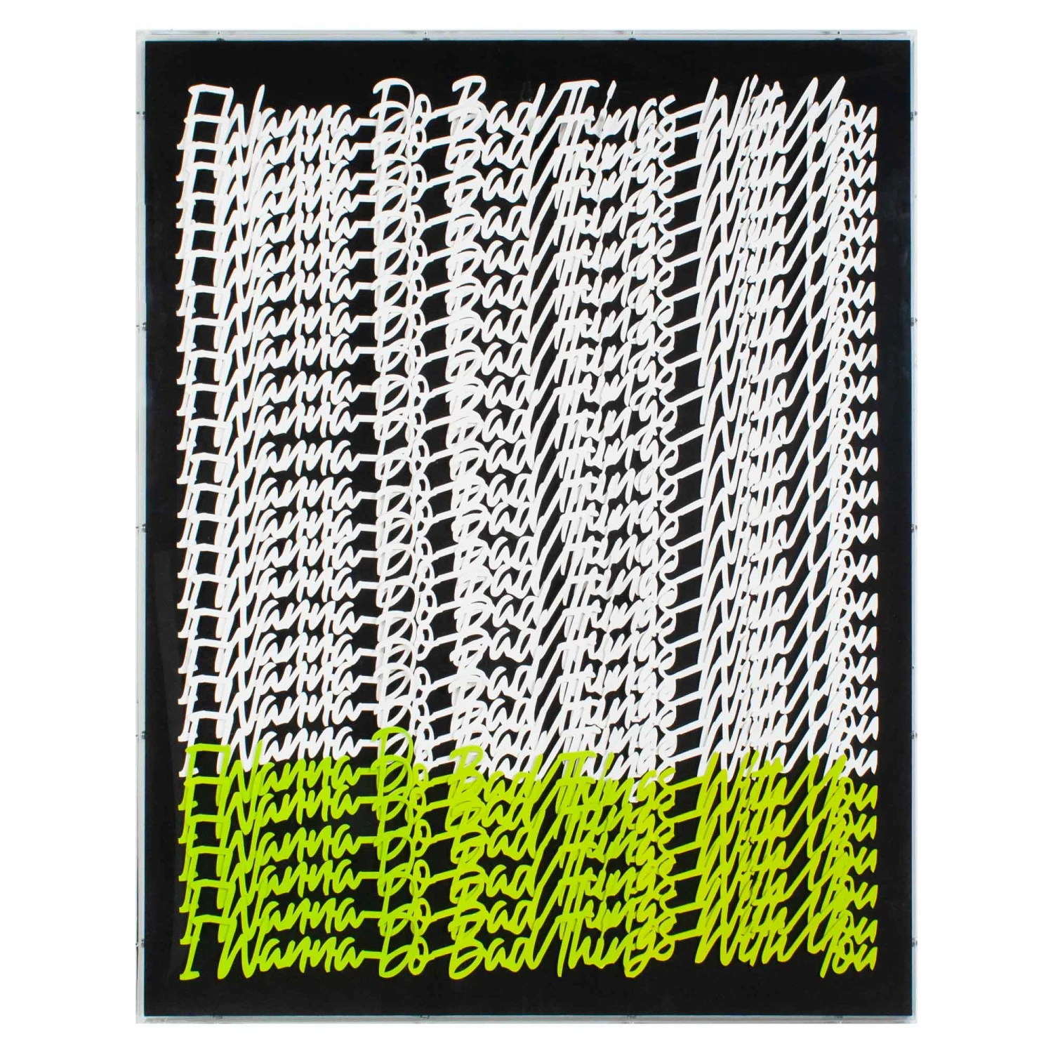 I wanna do bad things with you. Laser cut words set the mood against black canvas. Framed in an acrylic shadowbox.