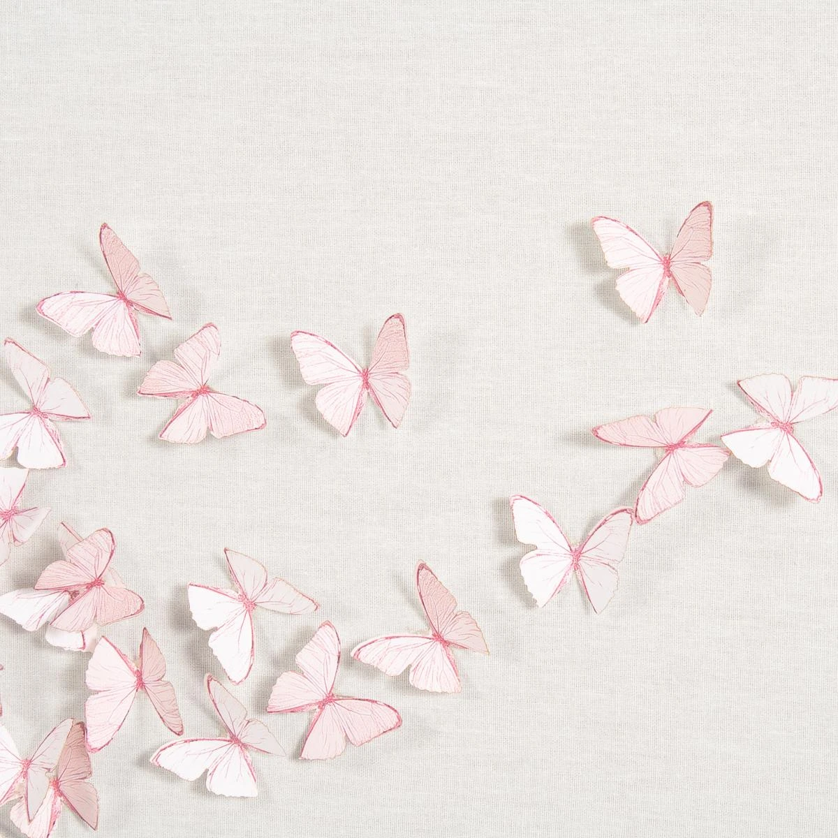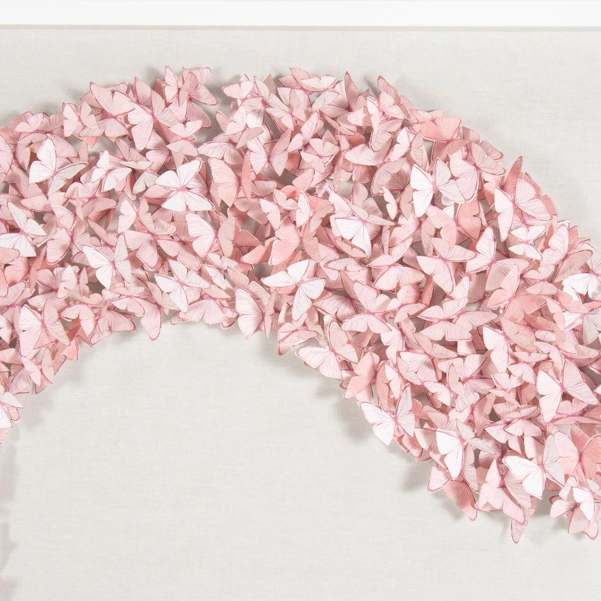 Pink paper butterflies arranged in a circular swarm. Each butterfly is hand cut and individually pinned to white linen.