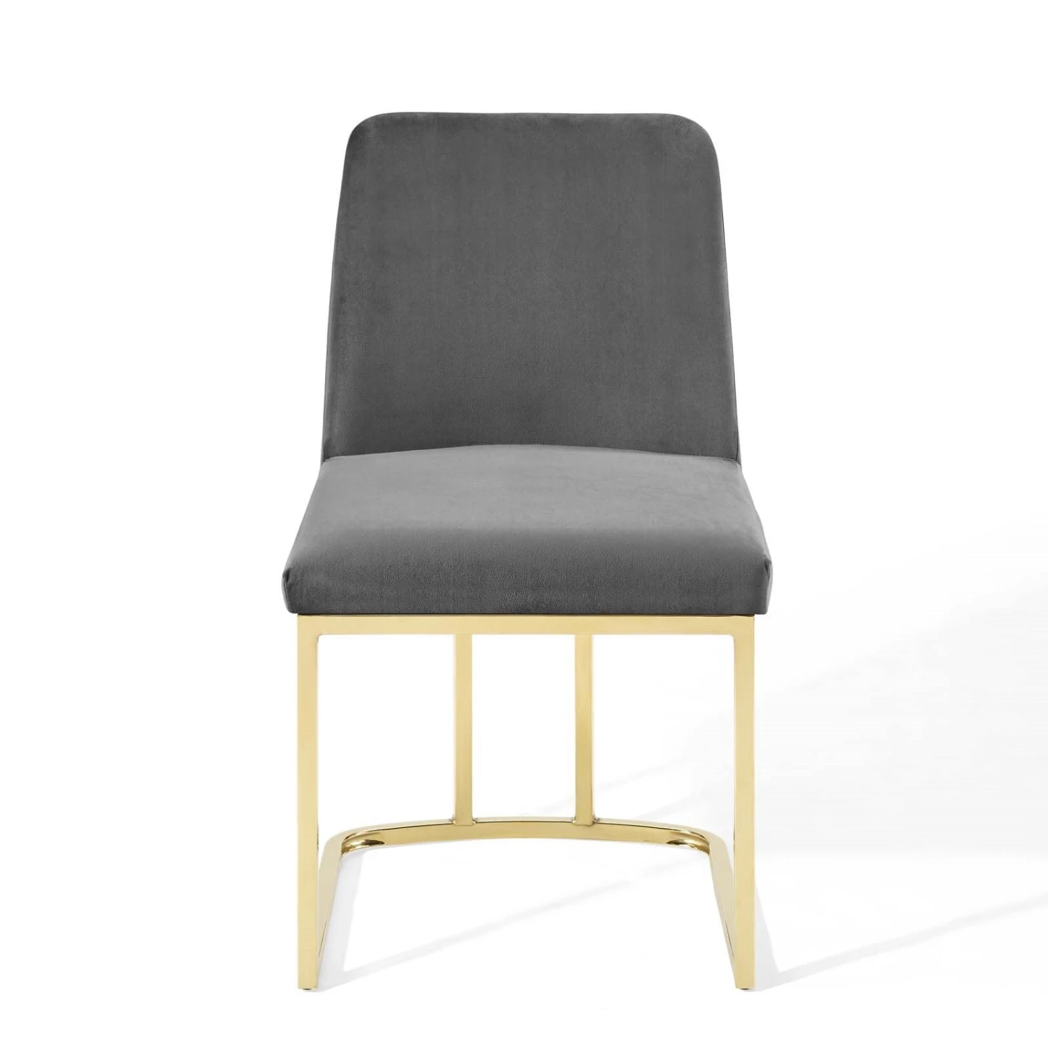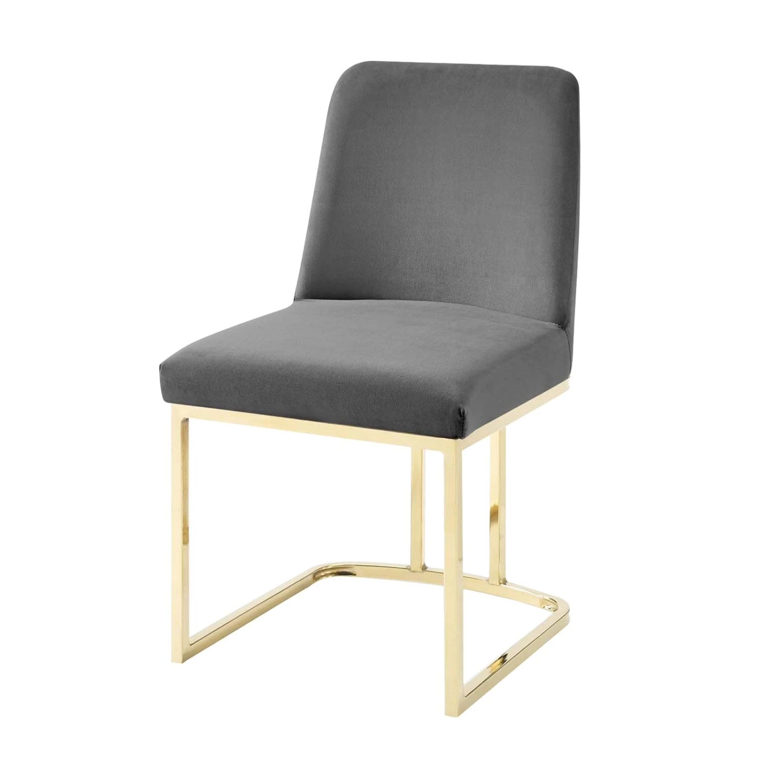 This art deco dining chair is elegant and glamorous with its gold stainless steel tapered legs and grey performance velvet. Great for a dining room or just as classy in the entryway, bedroom or living room.