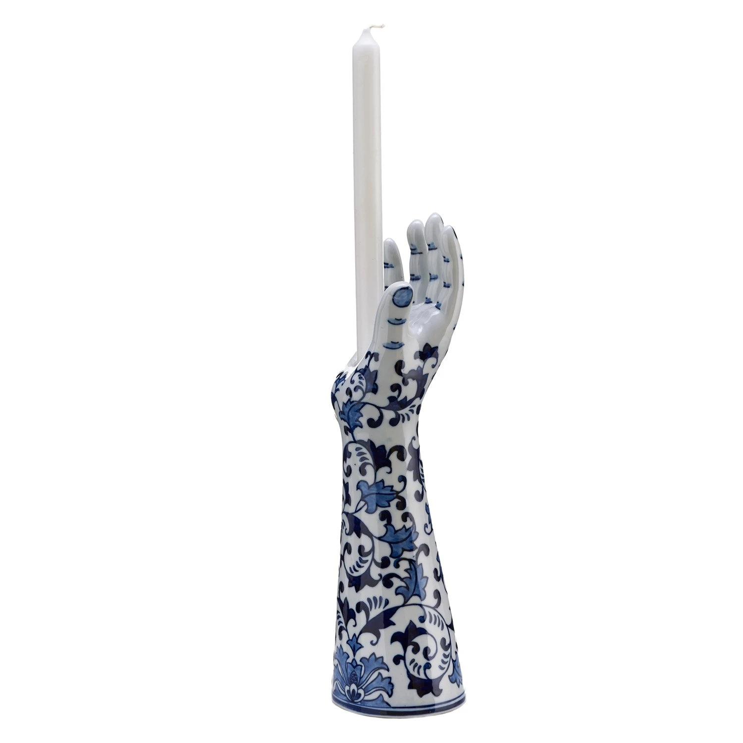 Porcelain hand candle holder with a classic blue and white chinaware design by Pols Potten.