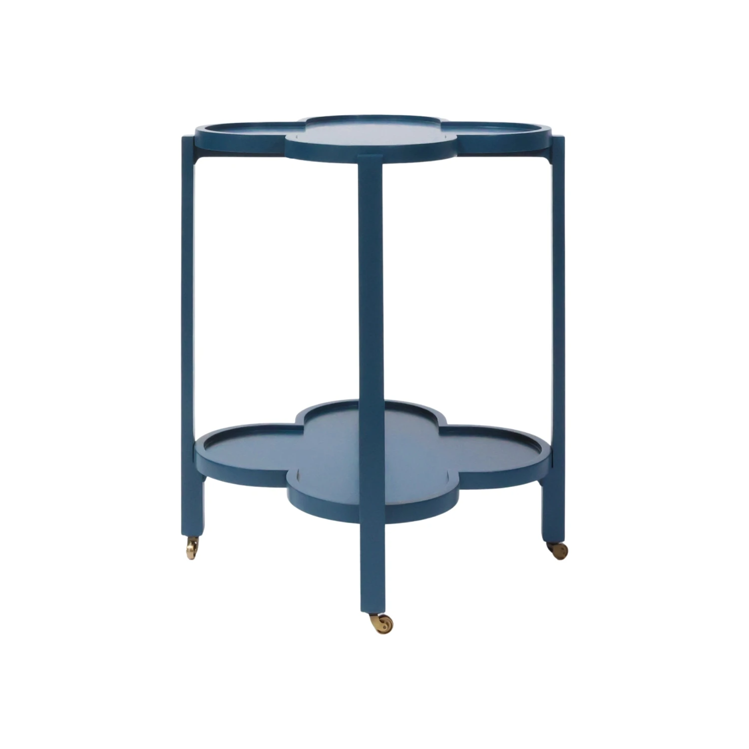 Our Clover Bar Cart features gentle curves that form the shape of a lucky four leaf clover. A double tier provides extra room to show off your favorite bottles and glasses, while a matte dark blue lacquer finish adds a touch of drama. Brass castors make moving this chic piece a breeze, so you can have cocktail hour anywhere.