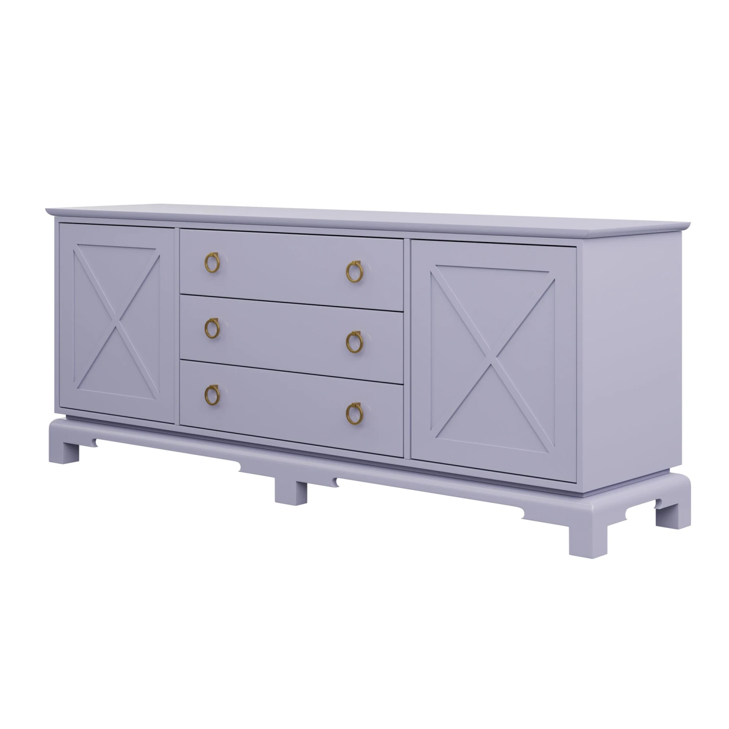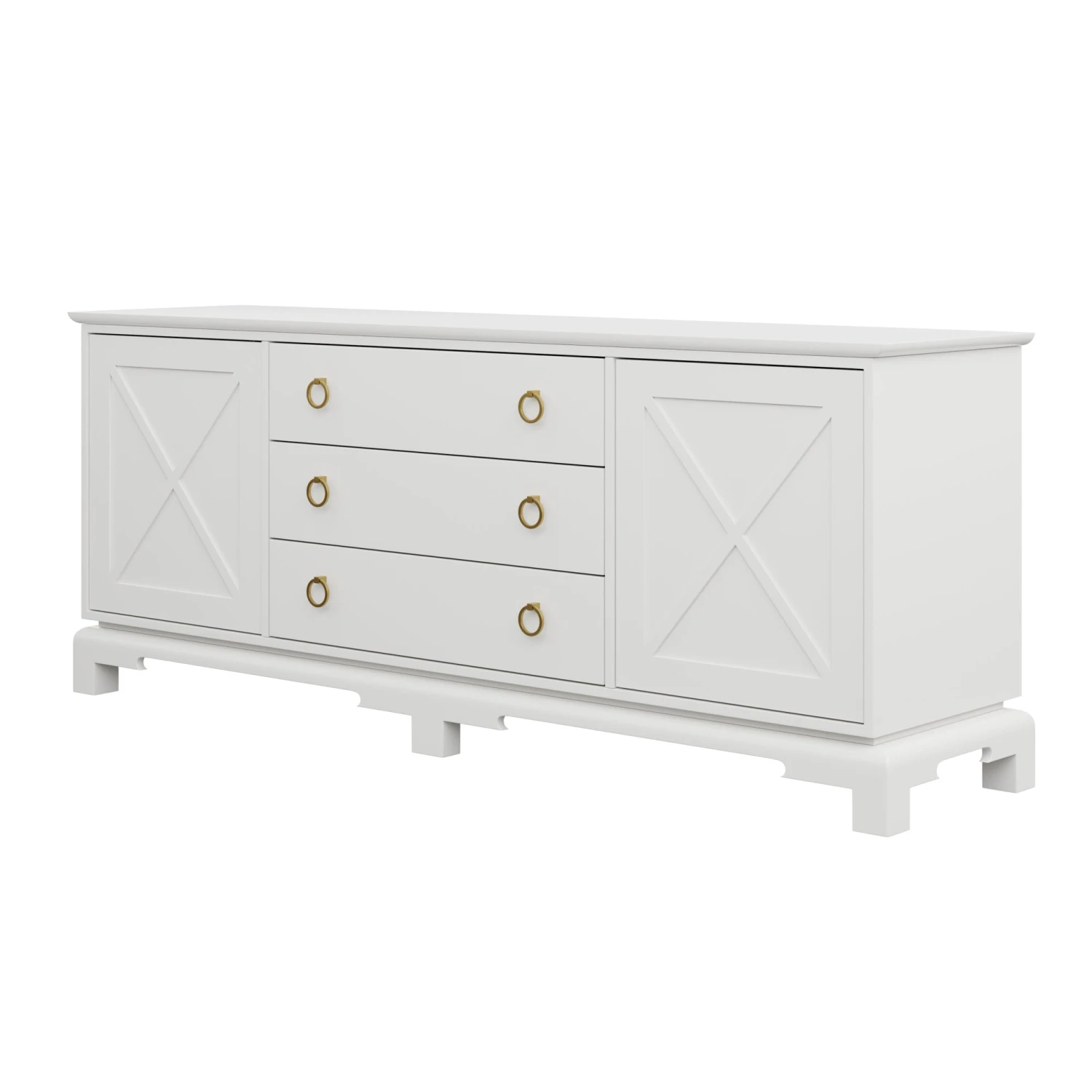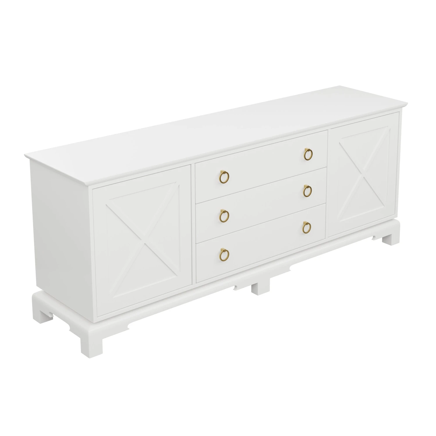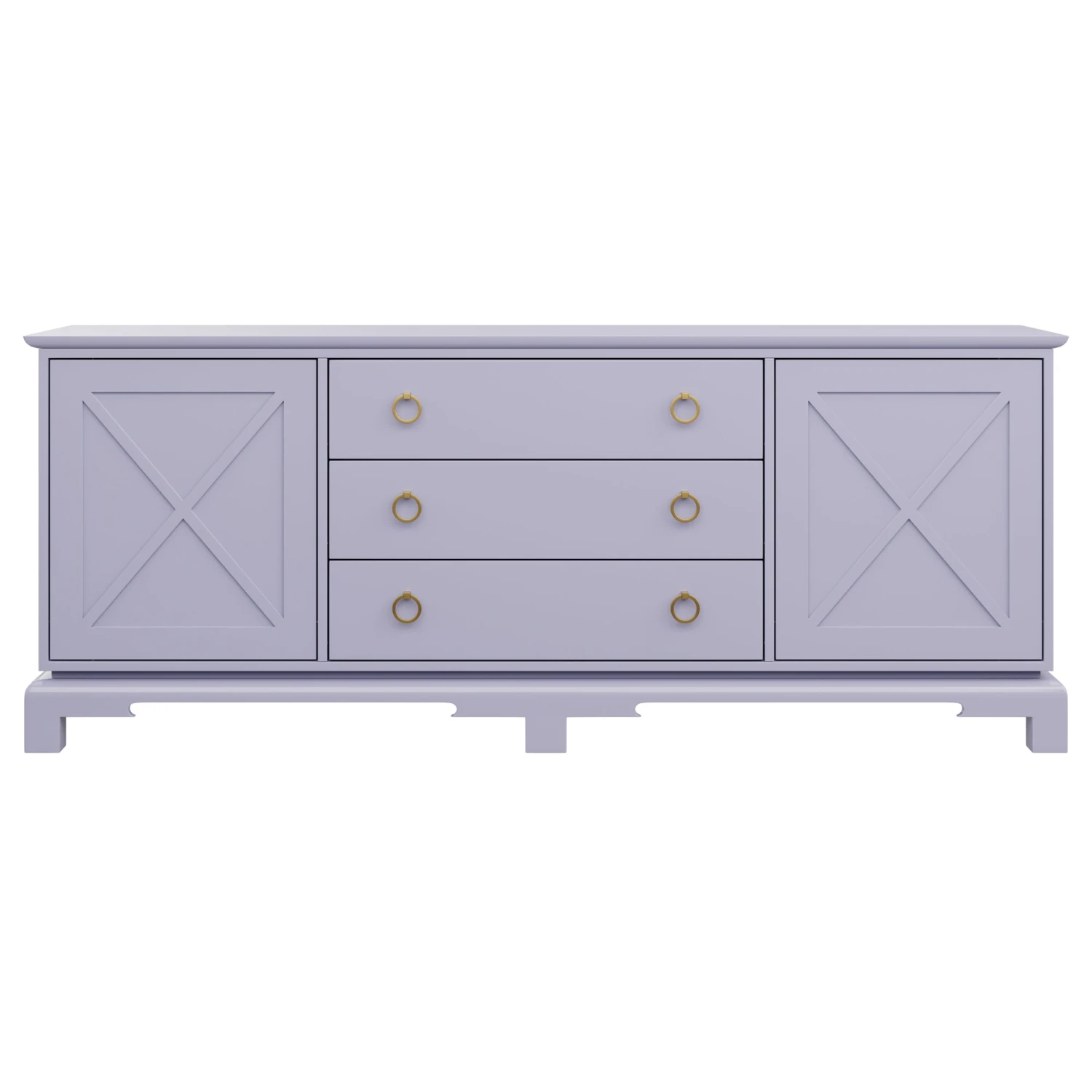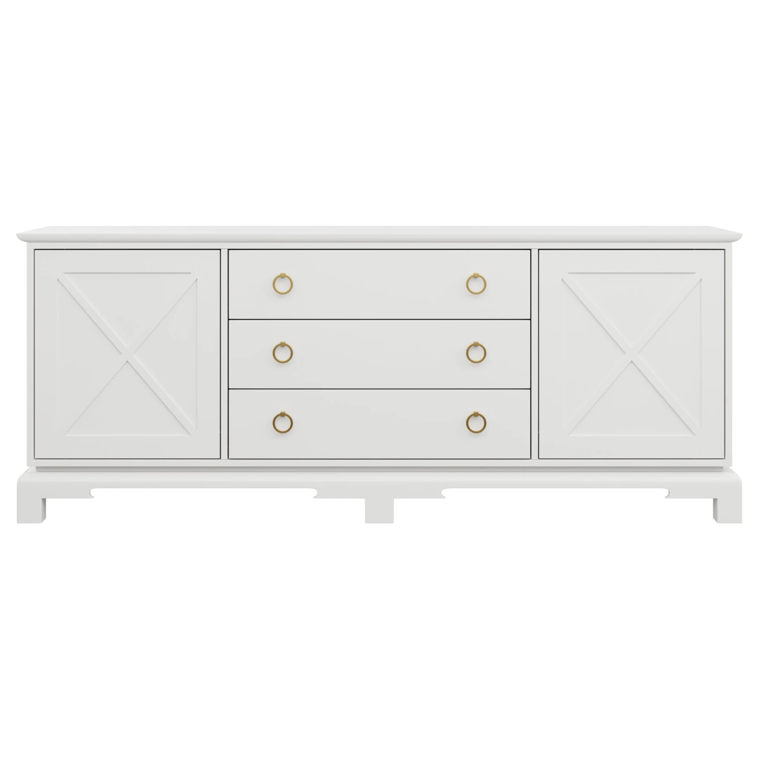 Perfect for a bedroom, living room, or nursery, the Aerin features push-close X doors and 3 center drawers that rest on unique feet.