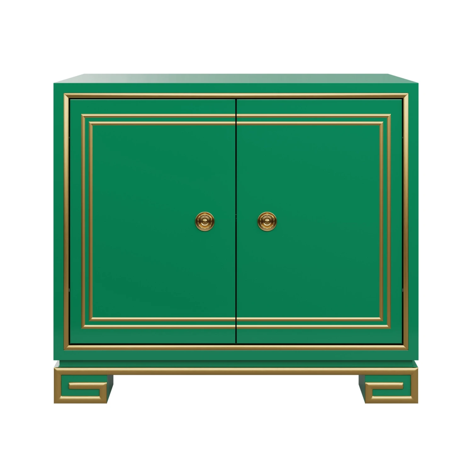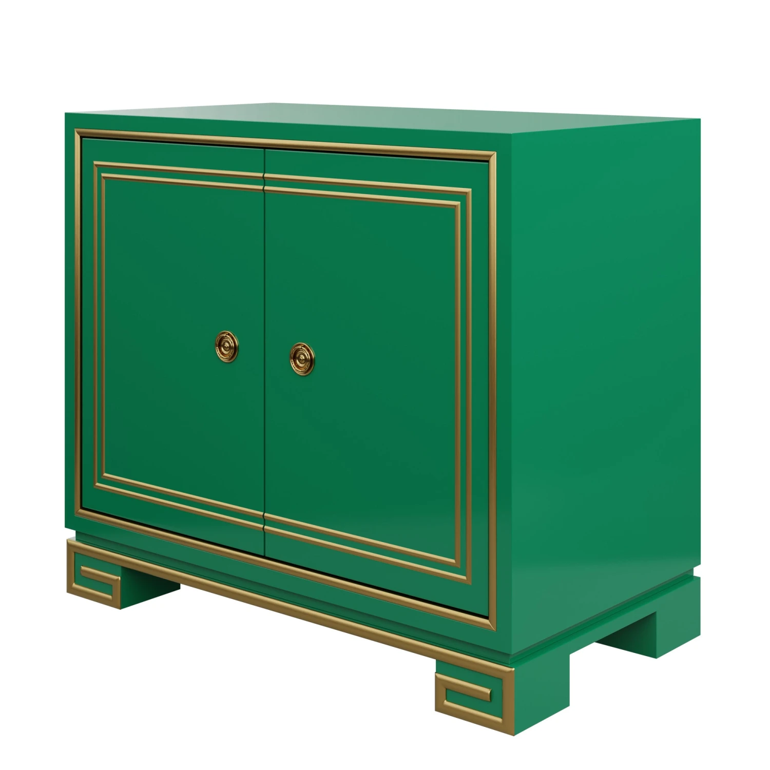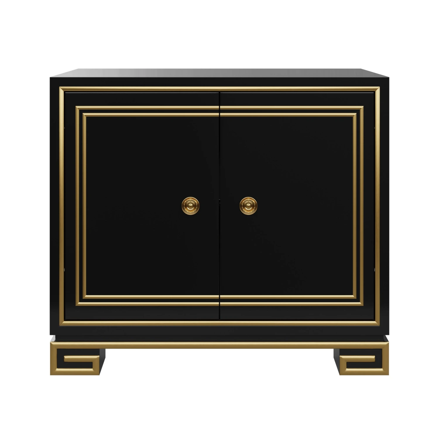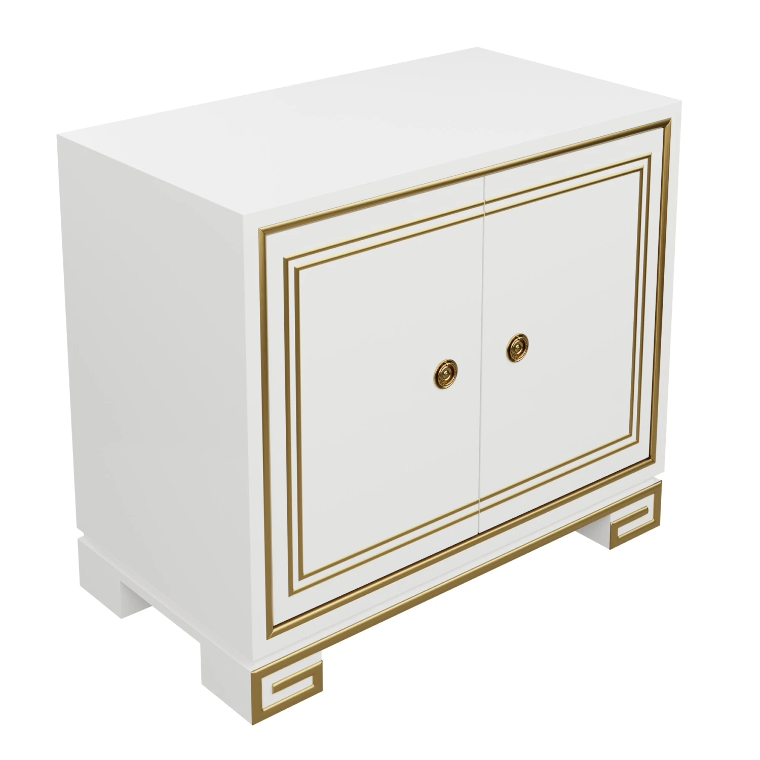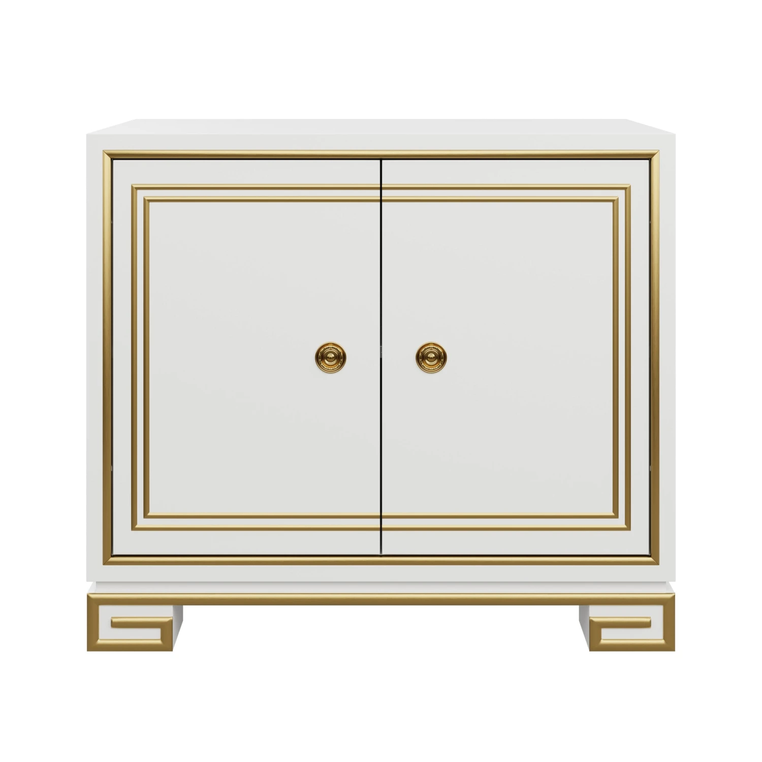 Our Bisou Chest stuns with its unique gold leaf trim detailing. Perched atop feet that give a simple nod to Greek Key, this piece features a push close cabinet with an adjustable shelf.Â