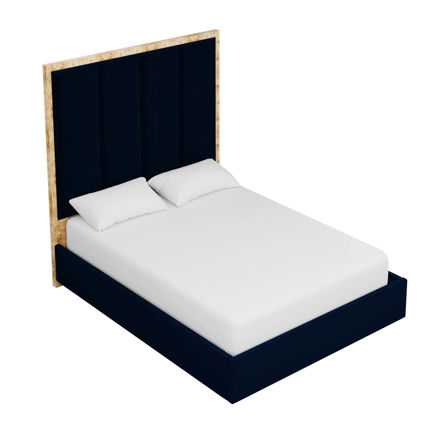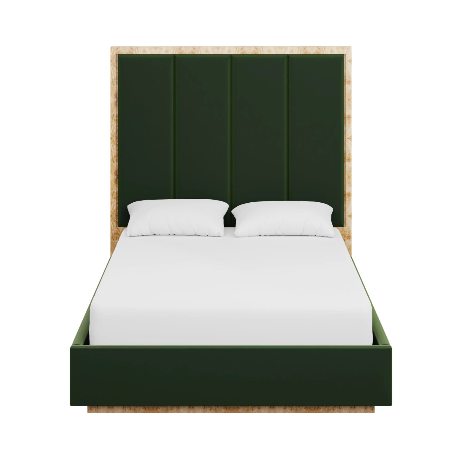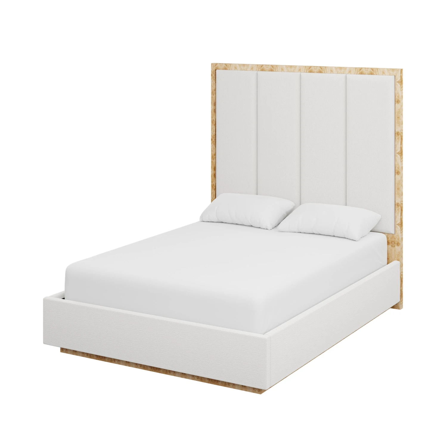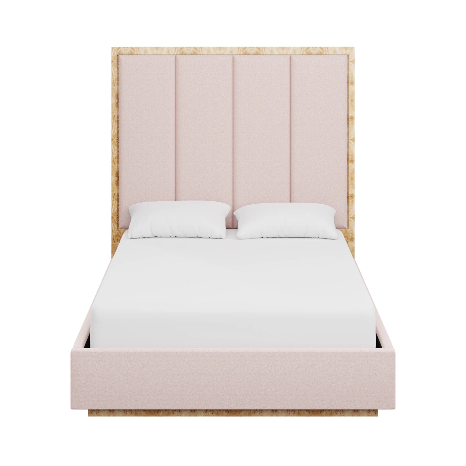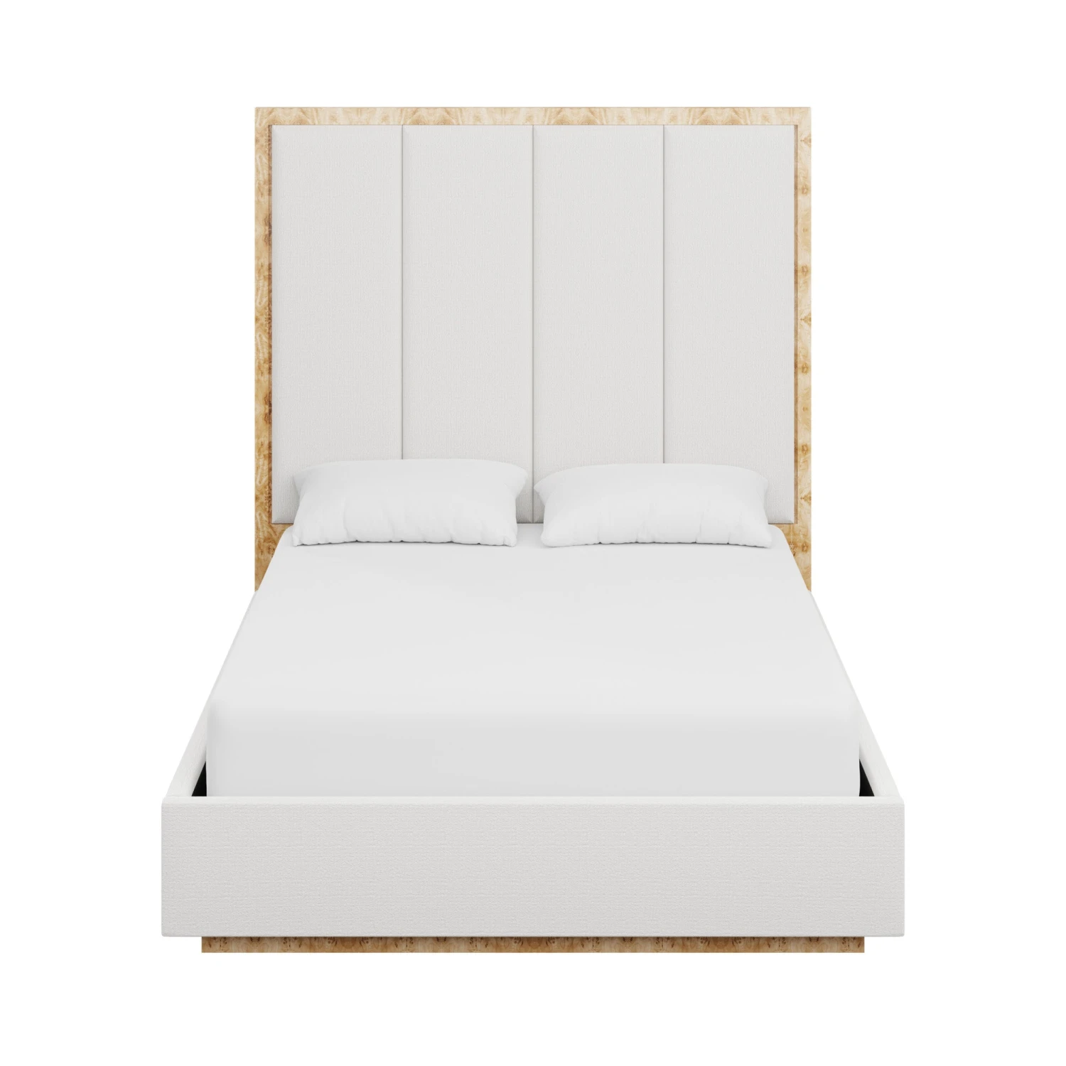 Made to order in the fabric of your choice, our custom Brant Bed boasts an organic burl back and base, with upholstered side railing and panels on the back.