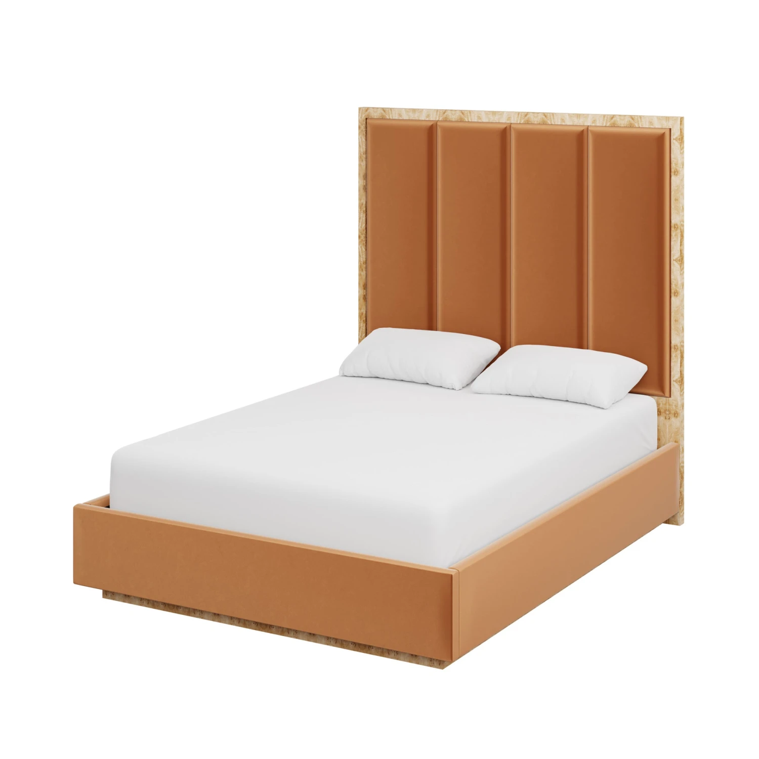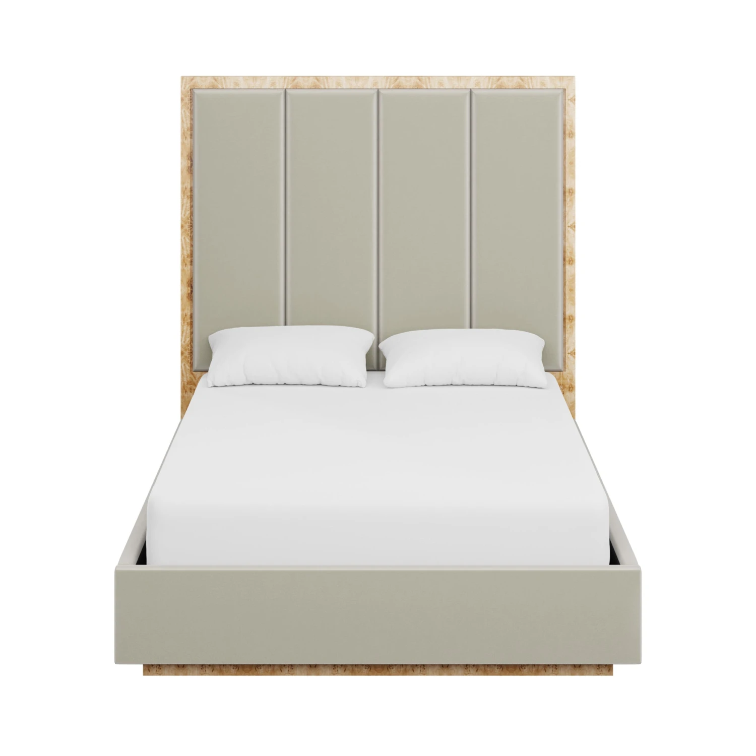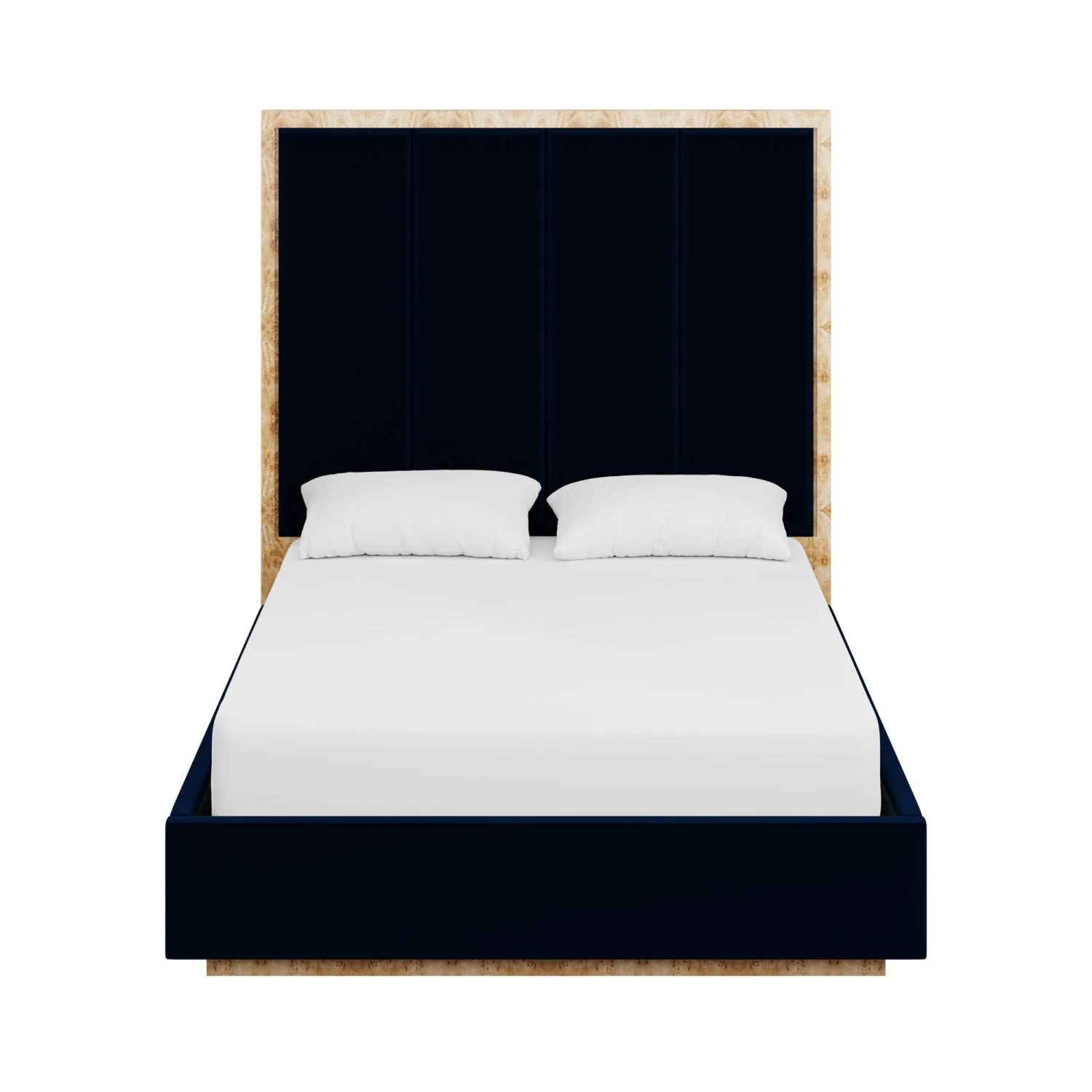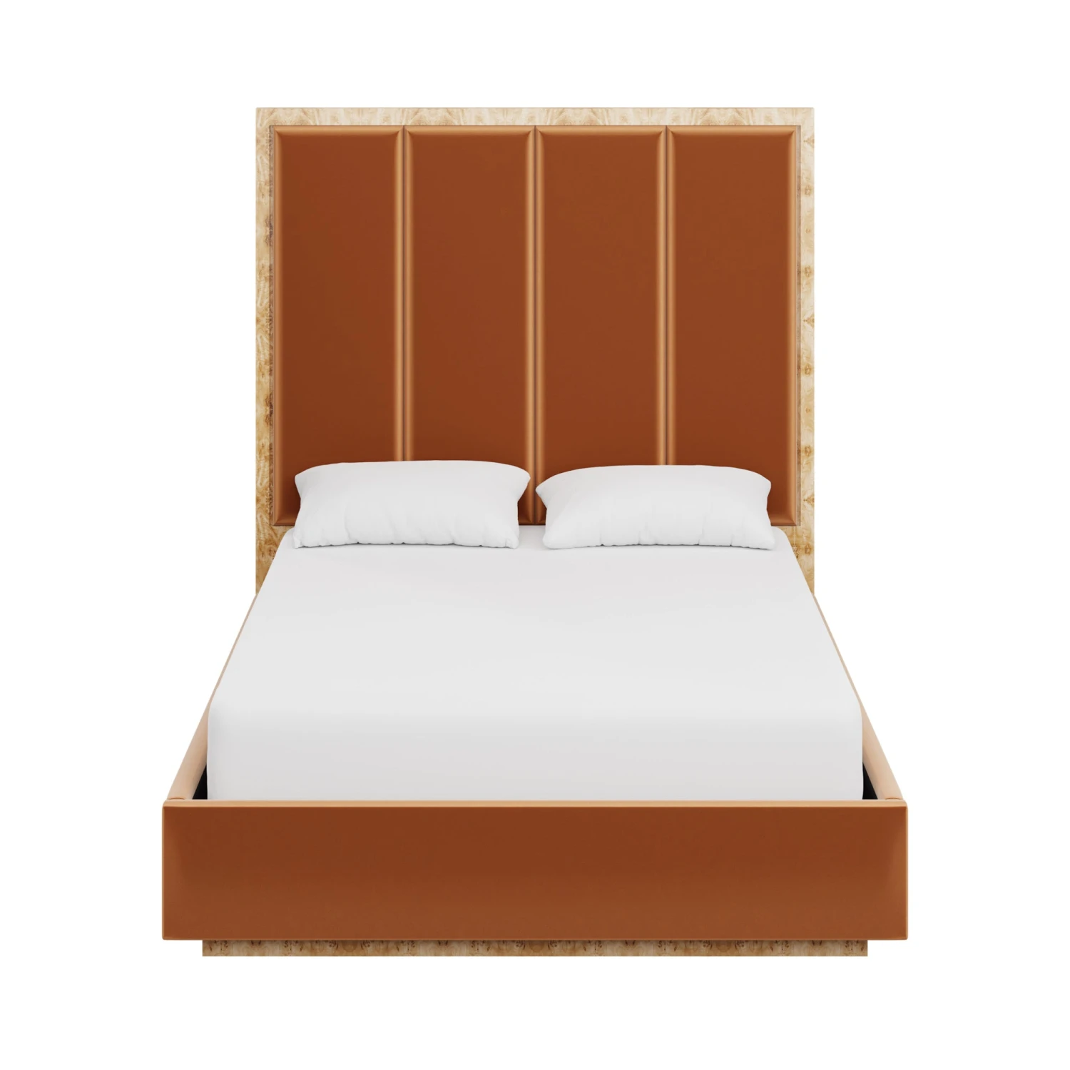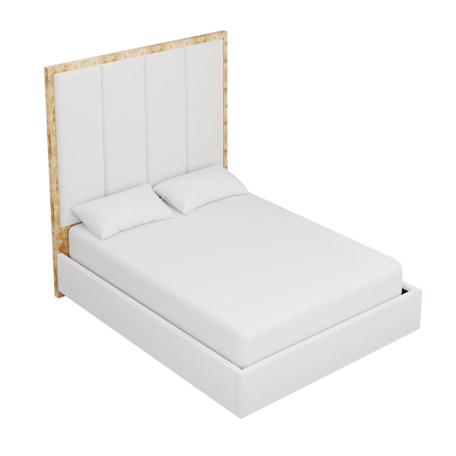 Made to order in the fabric of your choice, our custom Brant Bed boasts an organic burl back and base, with upholstered side railing and panels on the back.