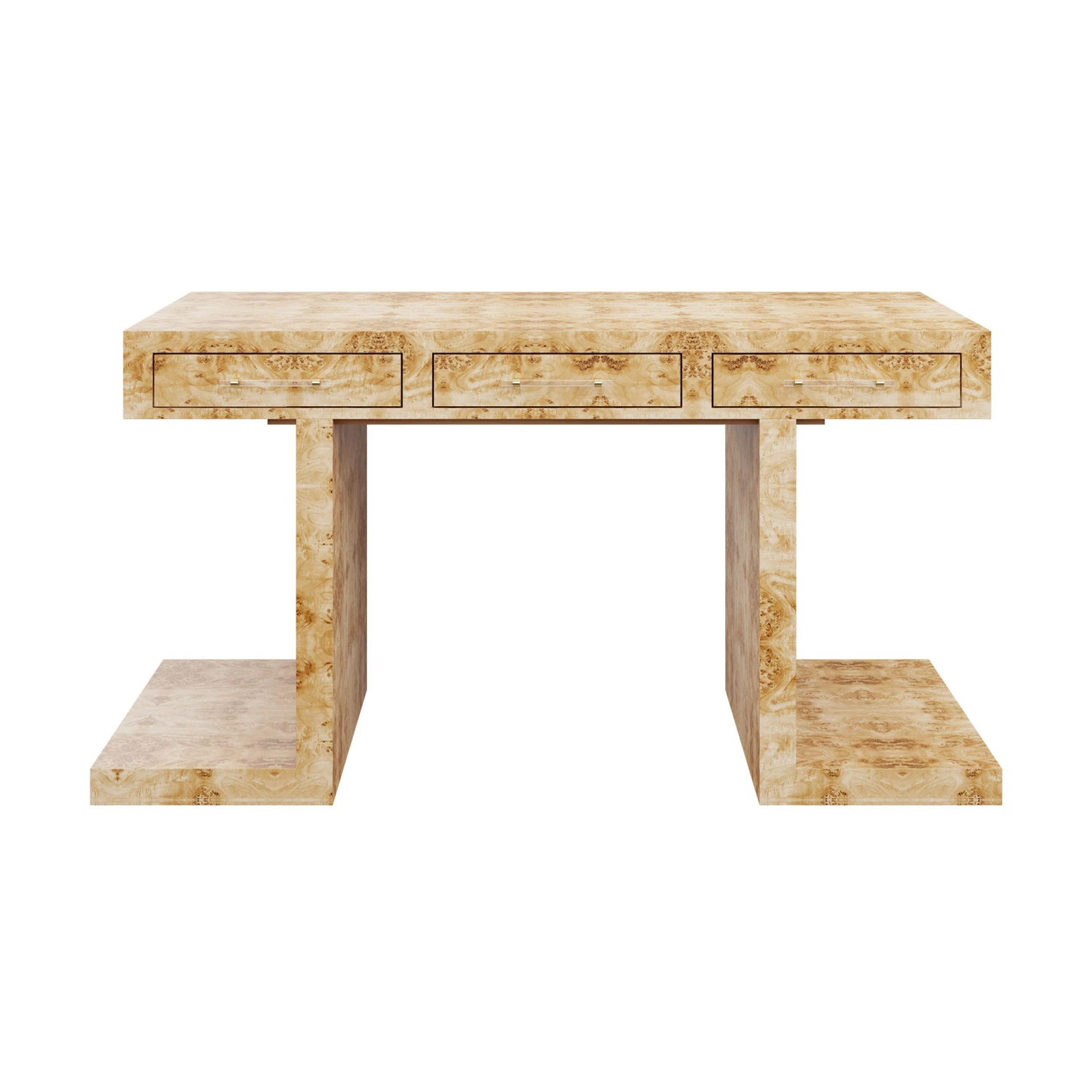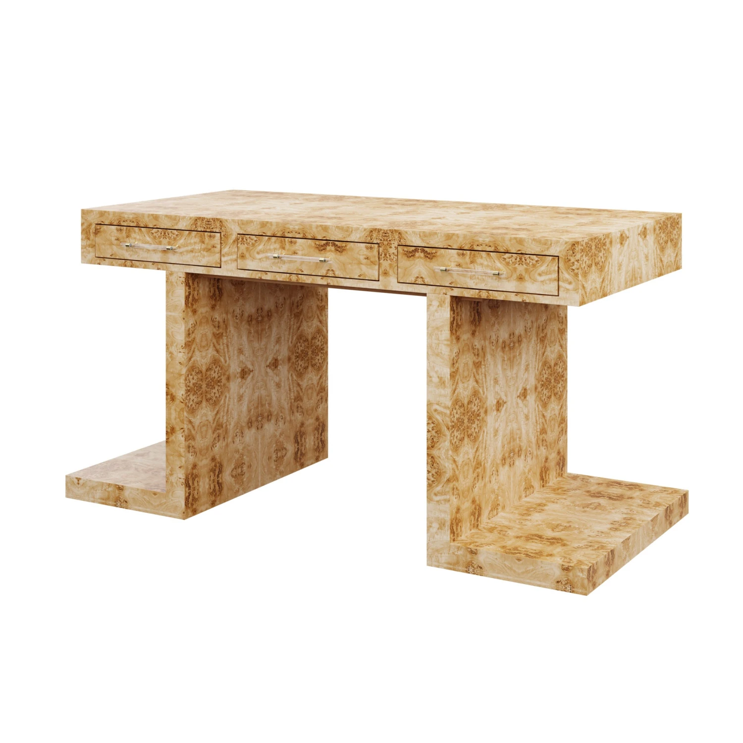 This Scout Bespoke desk features a unique frame with gorgeous burl wood veneer and 3 drawers with acrylic handles for storage. The L-shape legs can be styled with books, plants, etc. to keep it even more interesting. 100% made to order in your selected finish.