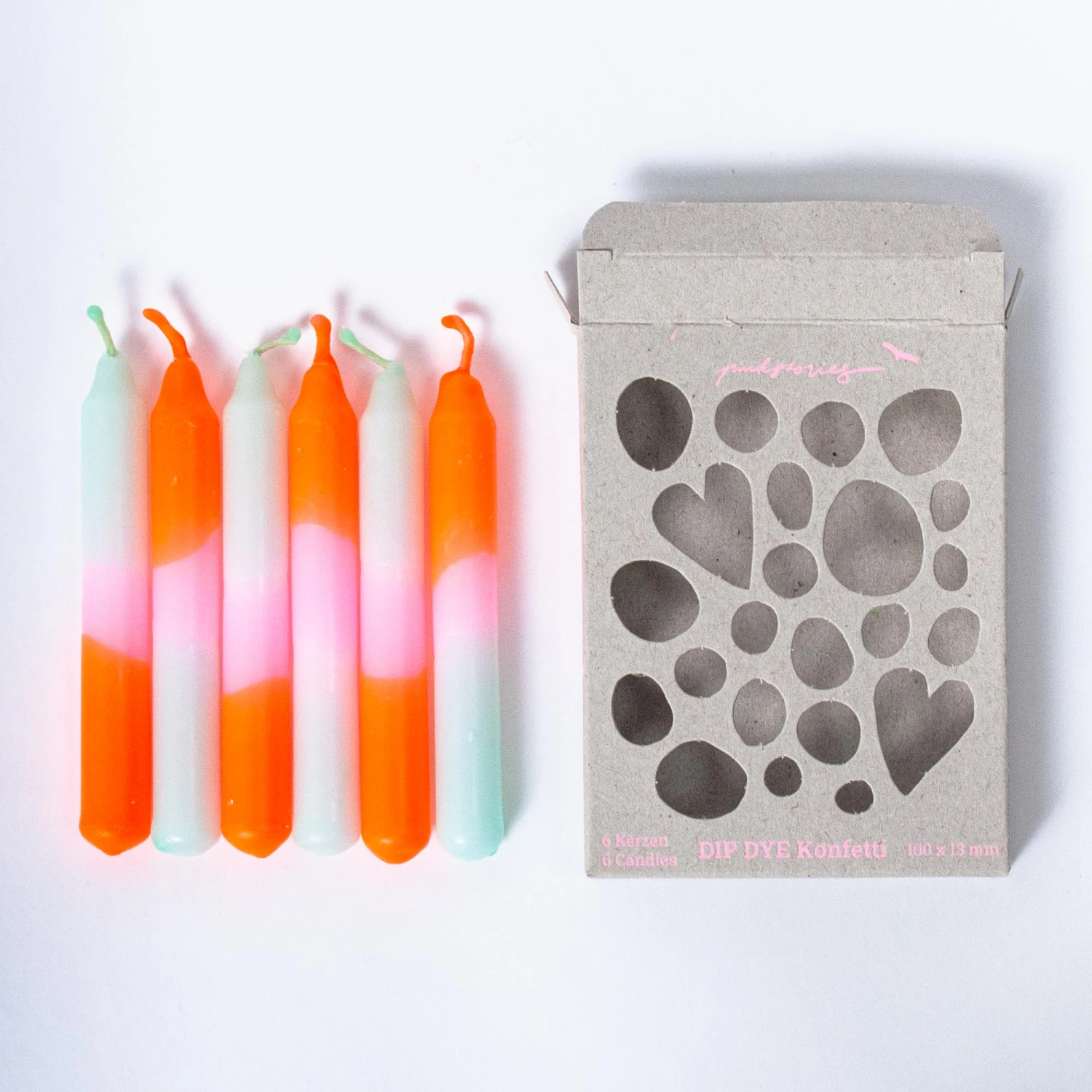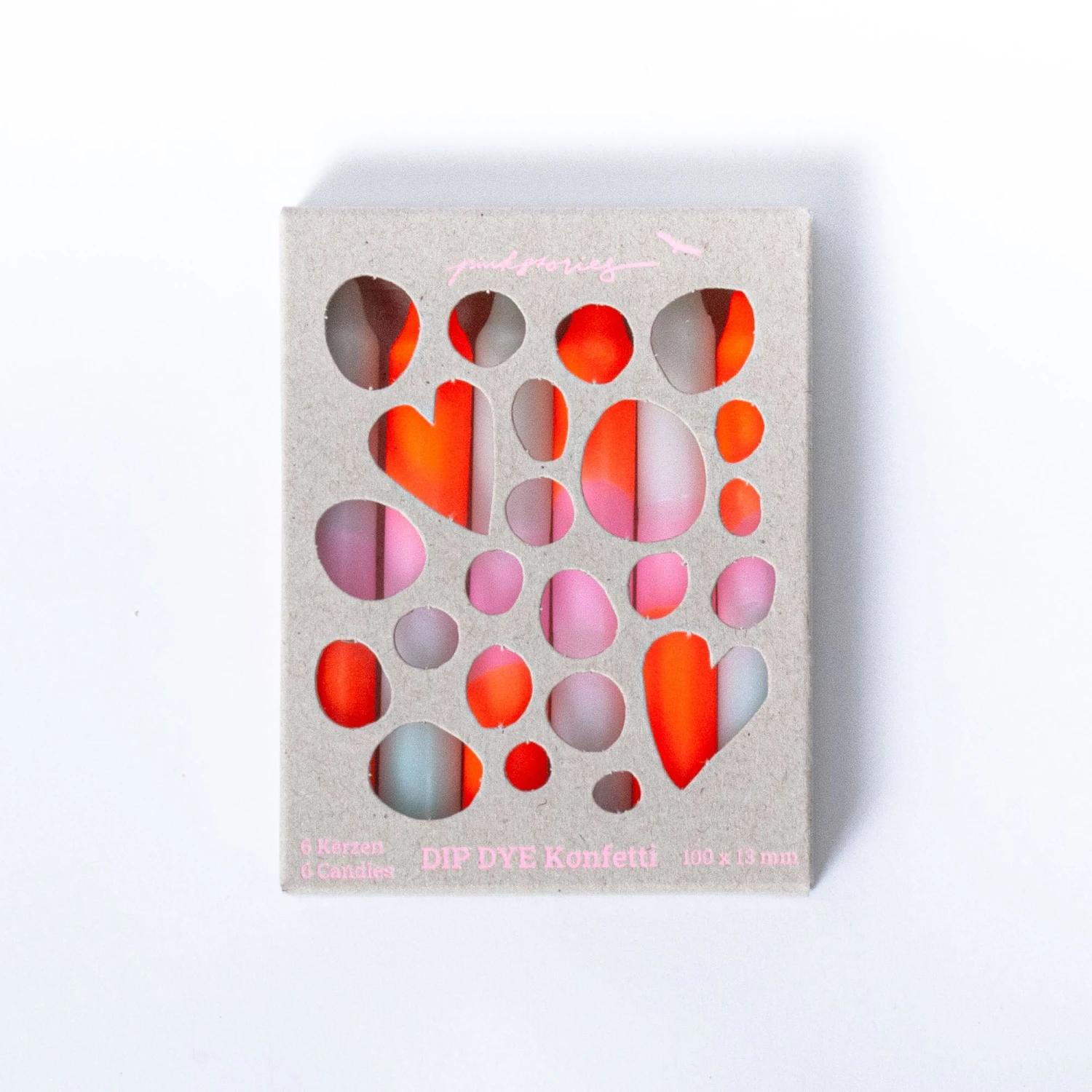Set of six lovingly hand-dyed birthday candles in shades of pink. While the colors remain the same, the patterns vary with each candle and make each one unique.