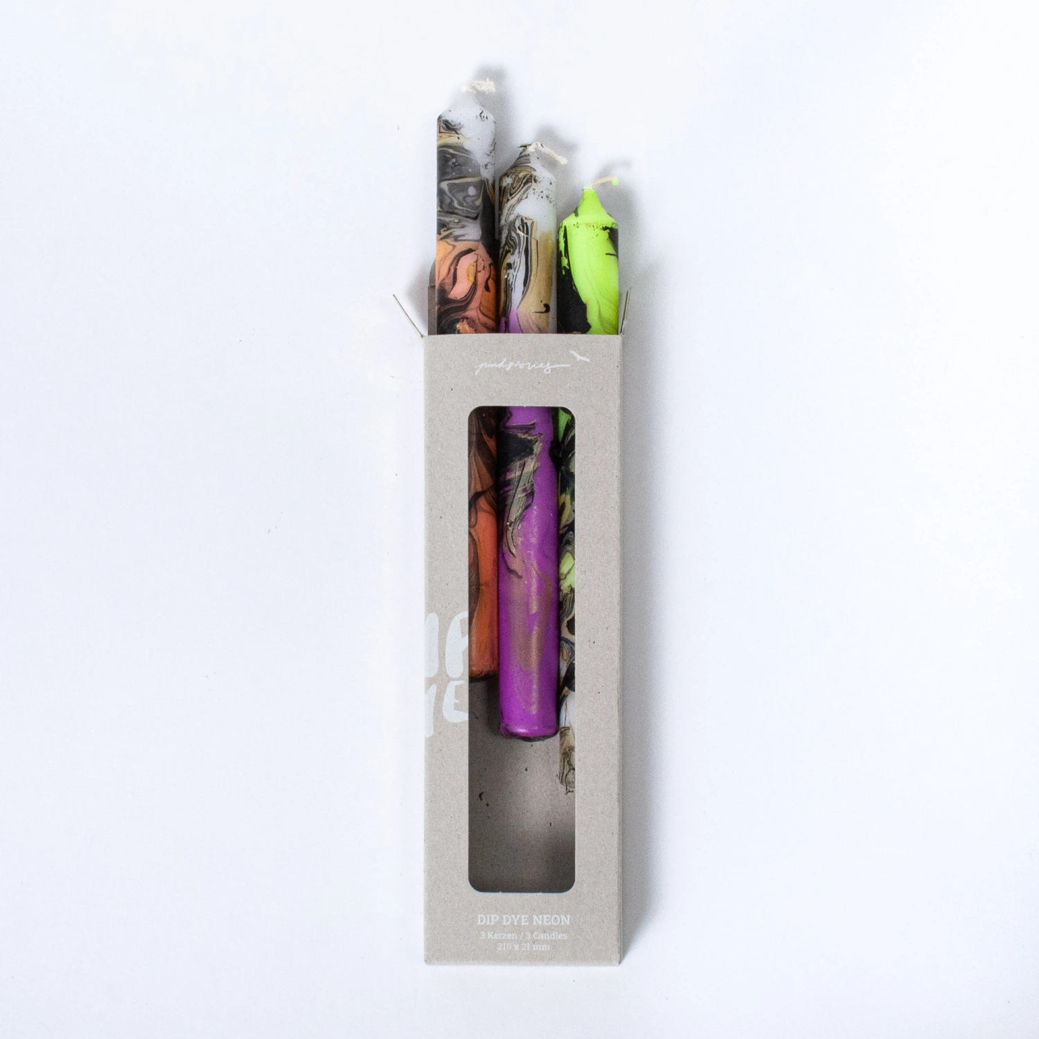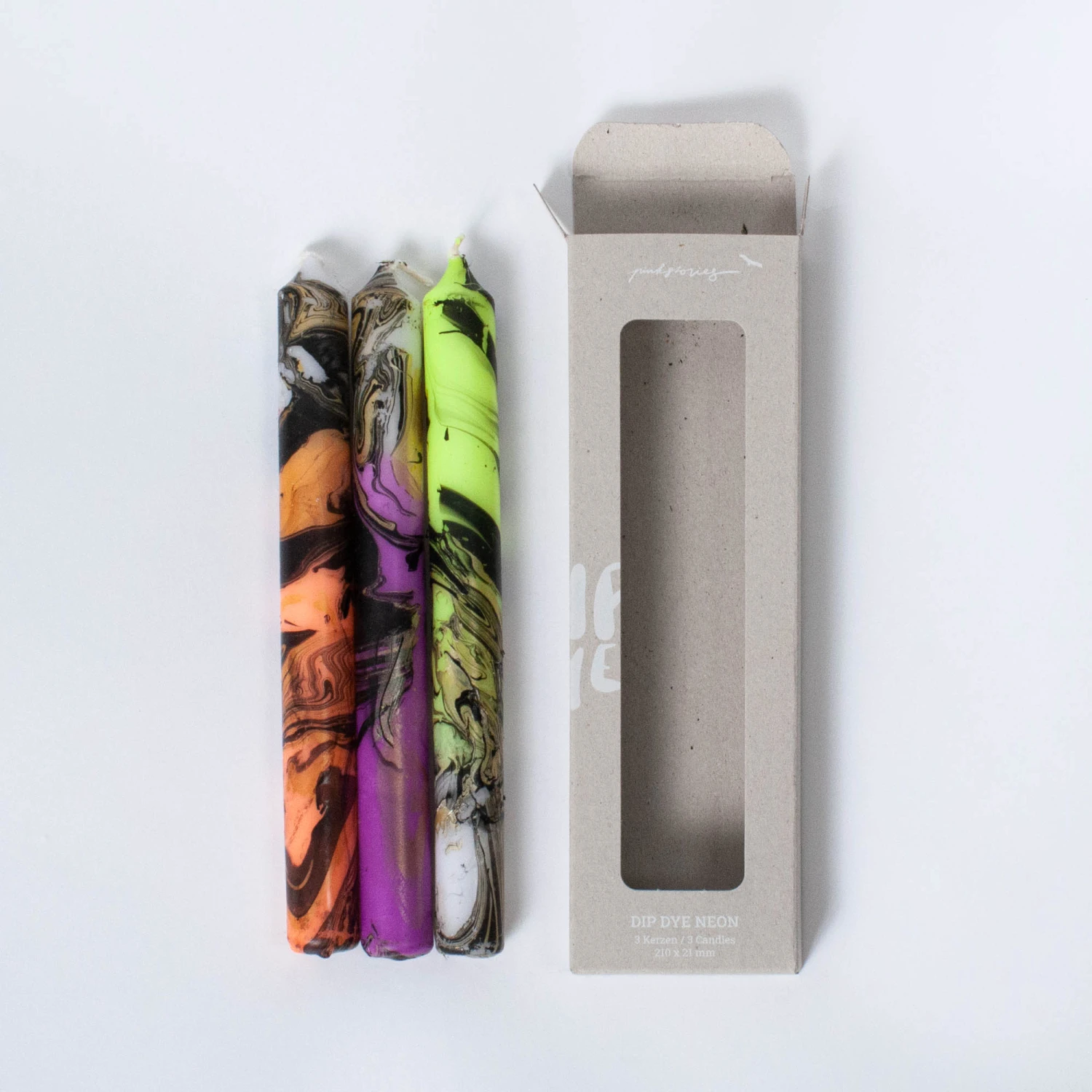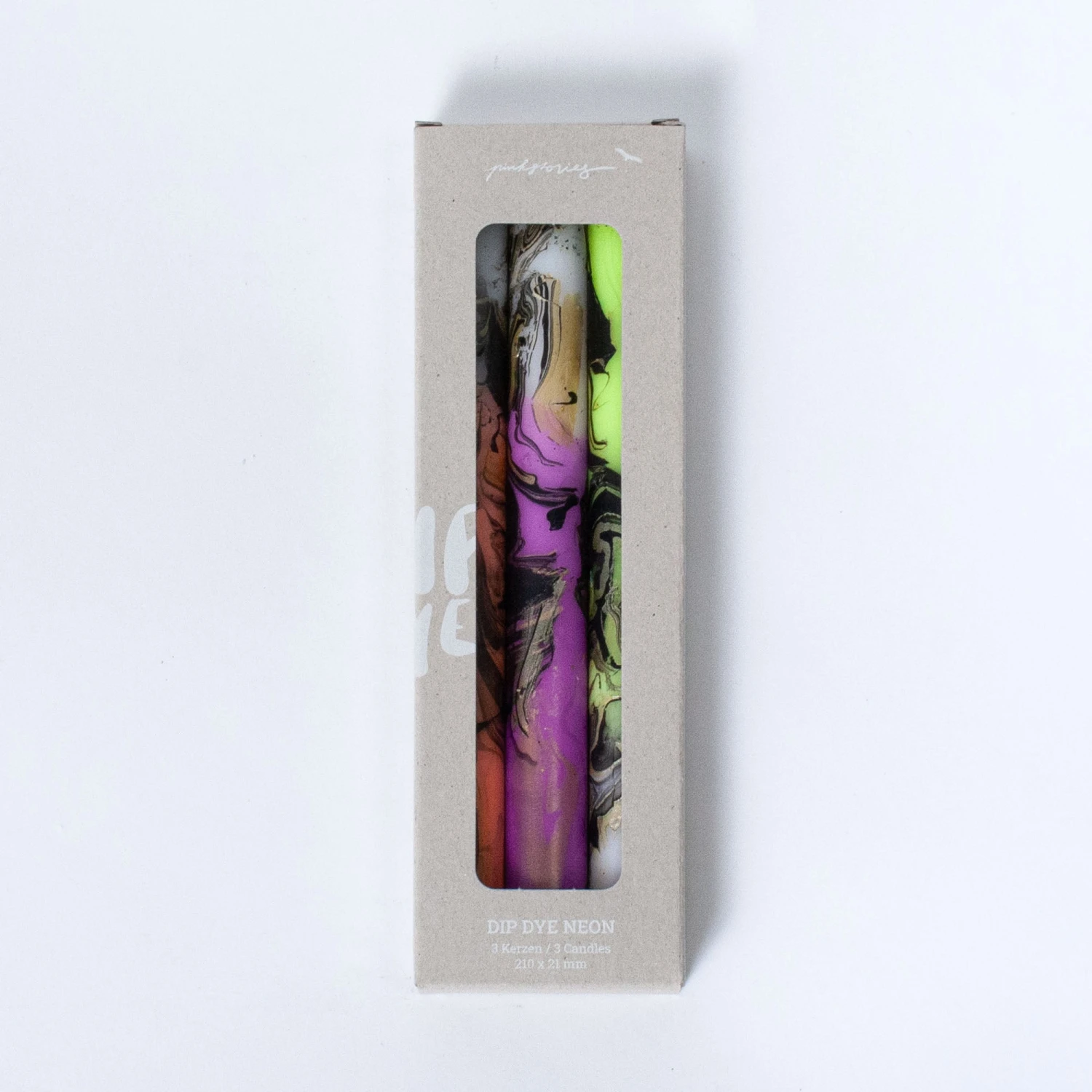 Set of three lovingly hand-dyed dinner candles in a neon look. The colors remain the same, but the patterns vary for each candle, making them unique.