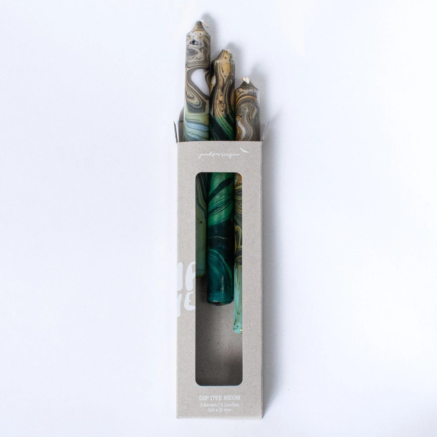 Set of three lovingly hand-dyed dinner candles in a neon look. The colors remain the same, but the patterns vary for each candle, making them unique.
