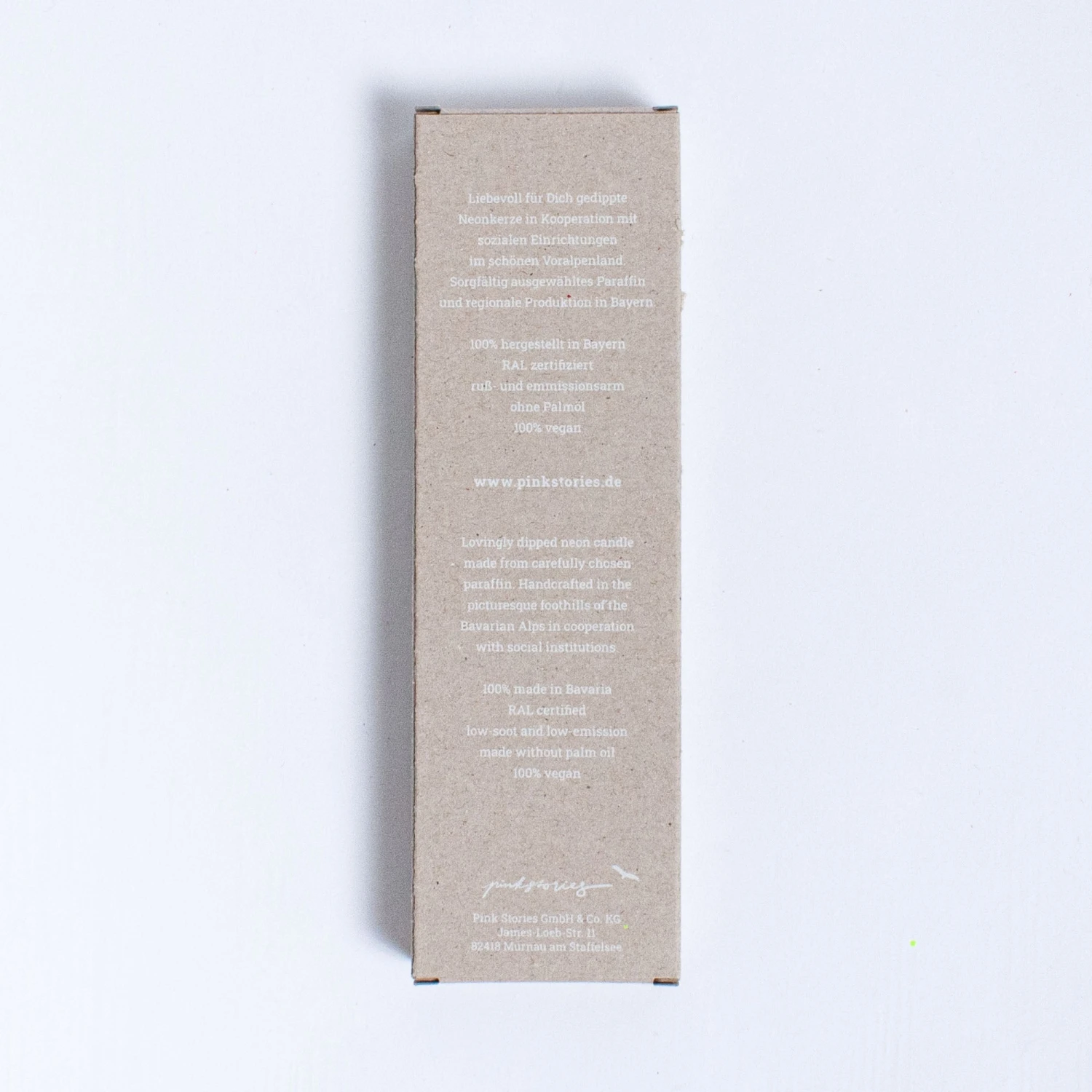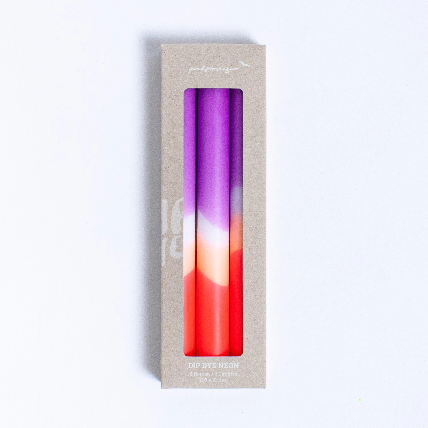 Set of three lovingly hand-colored taper candles in a neon look. While the colors stay the same, the pattern gradients vary with each candle to make it one-of-a-kind.