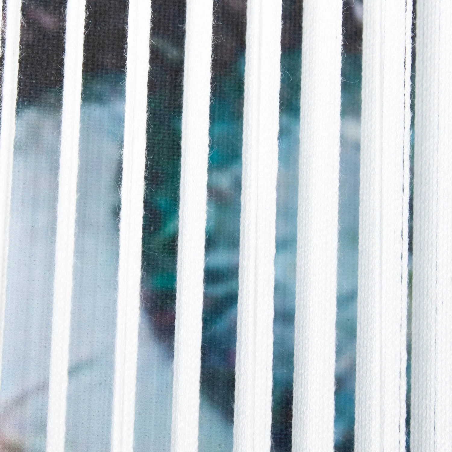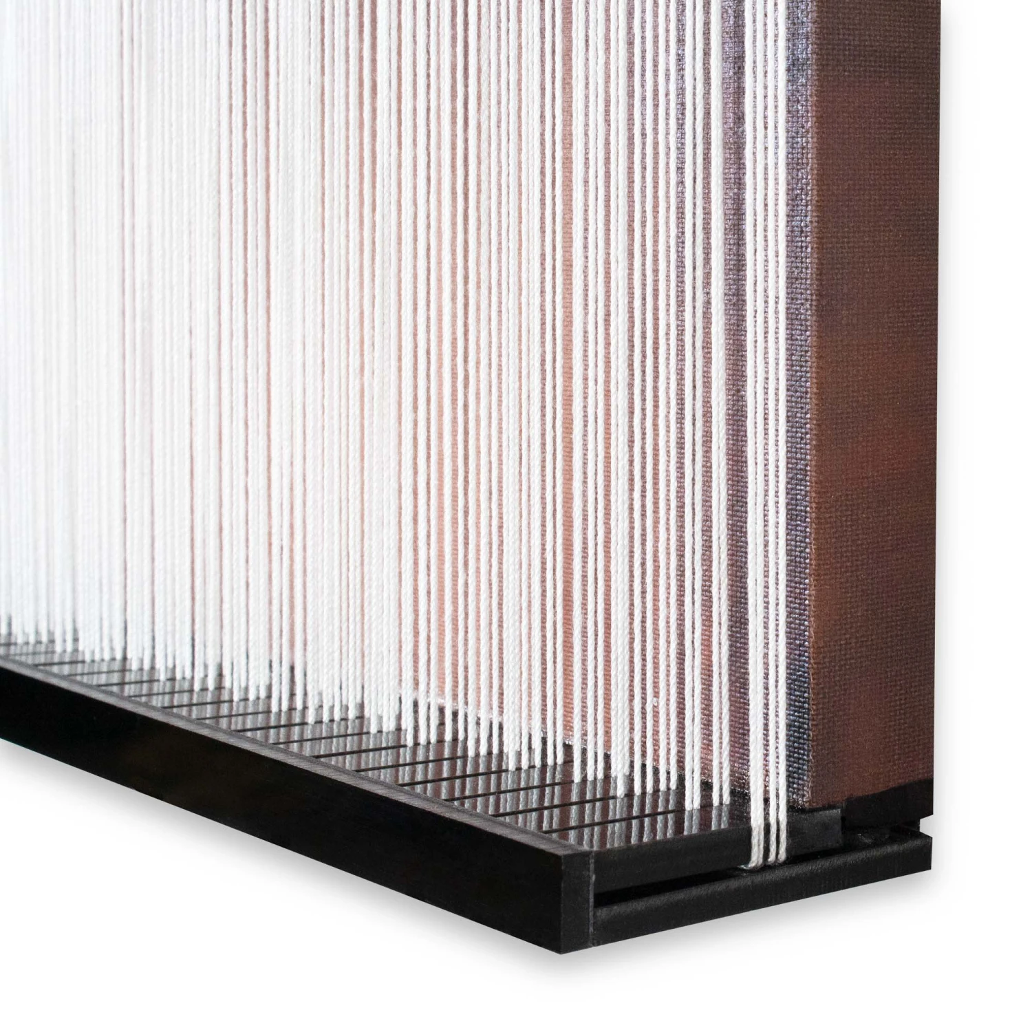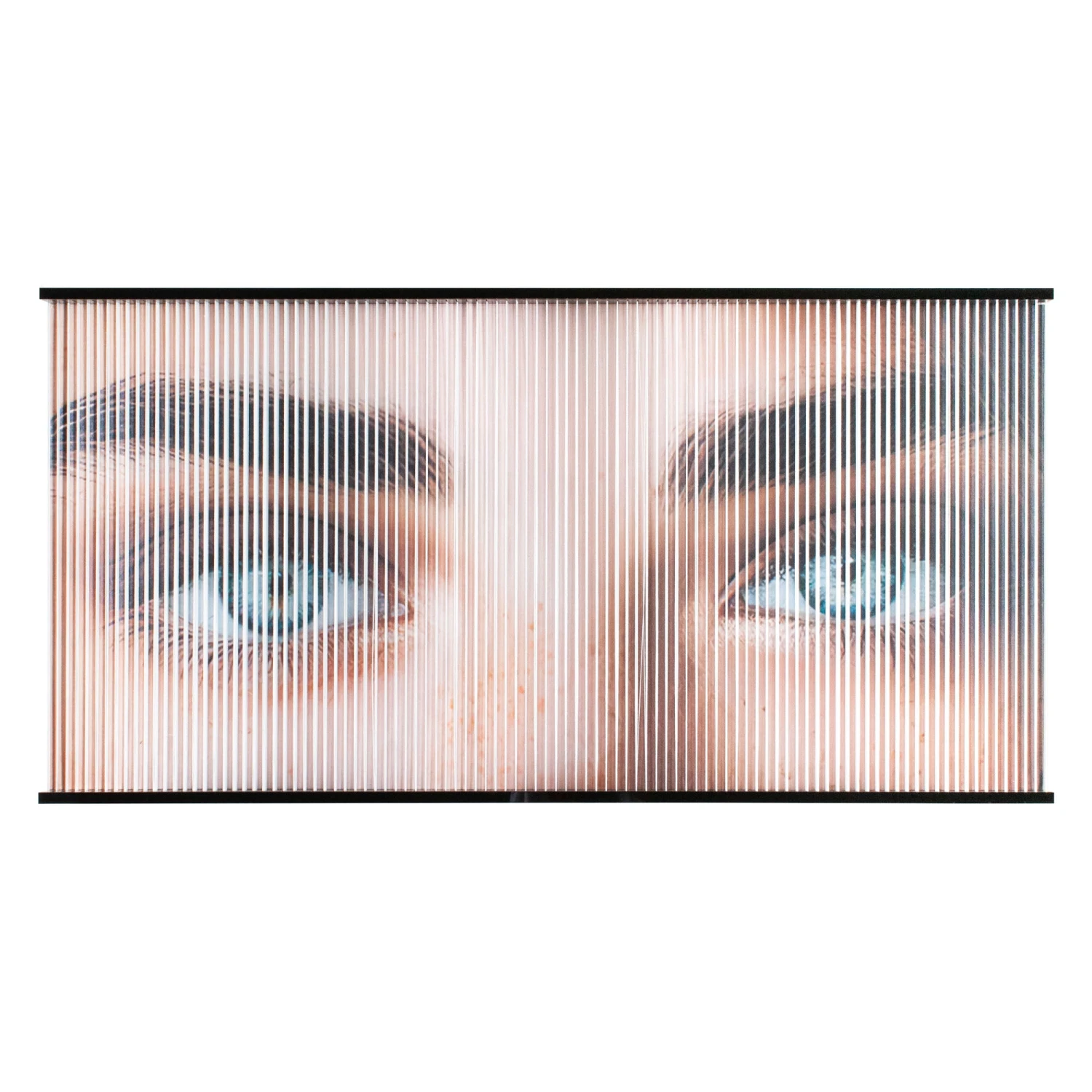 Mixed media artwork by Tat Frederick featuring a printed eye painting with segmented strings overlaid on top.Â