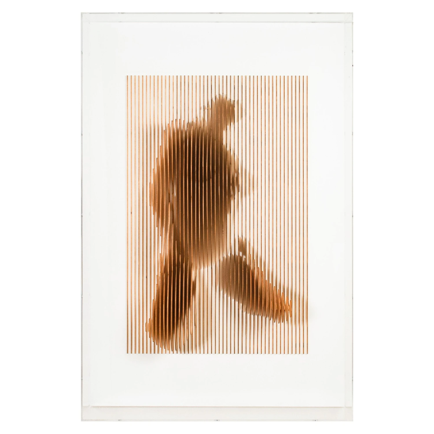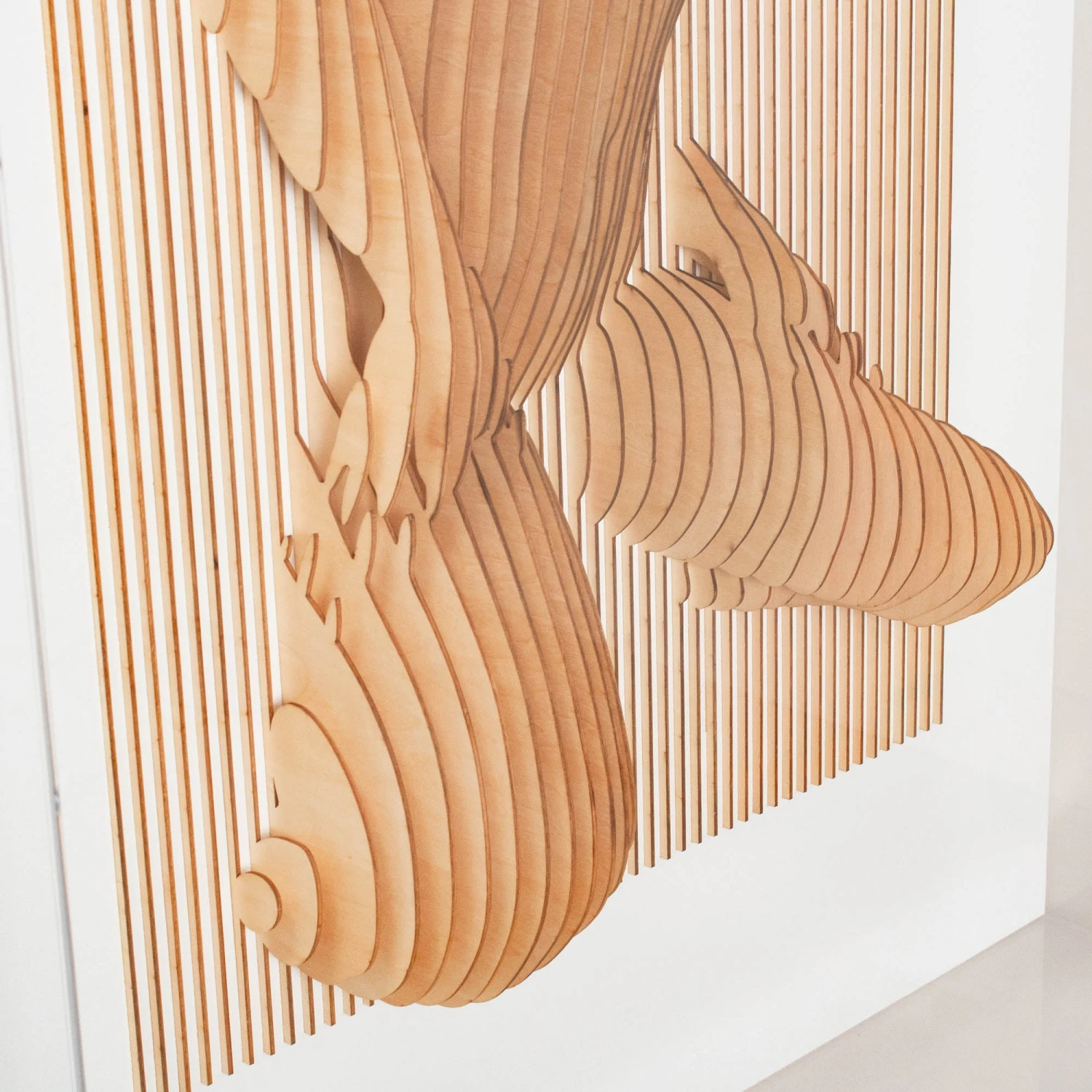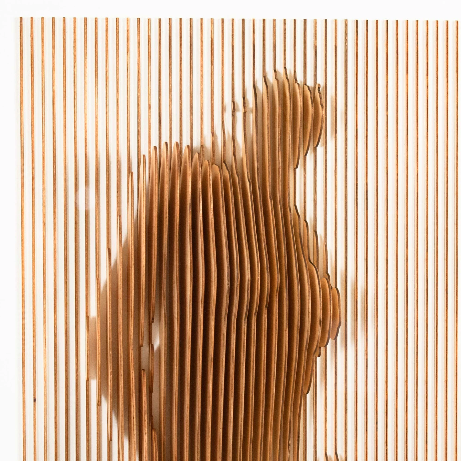 Mixed media artwork by Tat Frederick. Laser cut wood forms the body of a female with a stunning 3D effect. Mounted on white sandstone.
