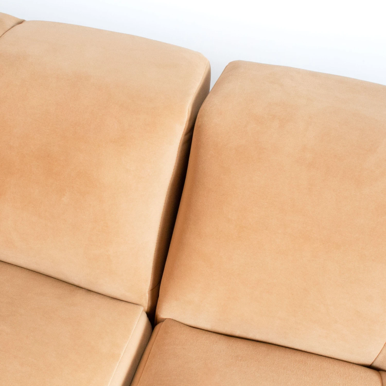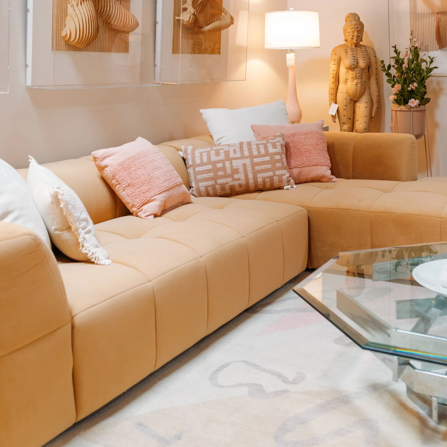 Contemporary and vintage-inspired, our Faye Sectional is roomy enough for the whole watch party. Warm caramel velvet and clean tufting details throughout bring a luxe feel to this unique piece.