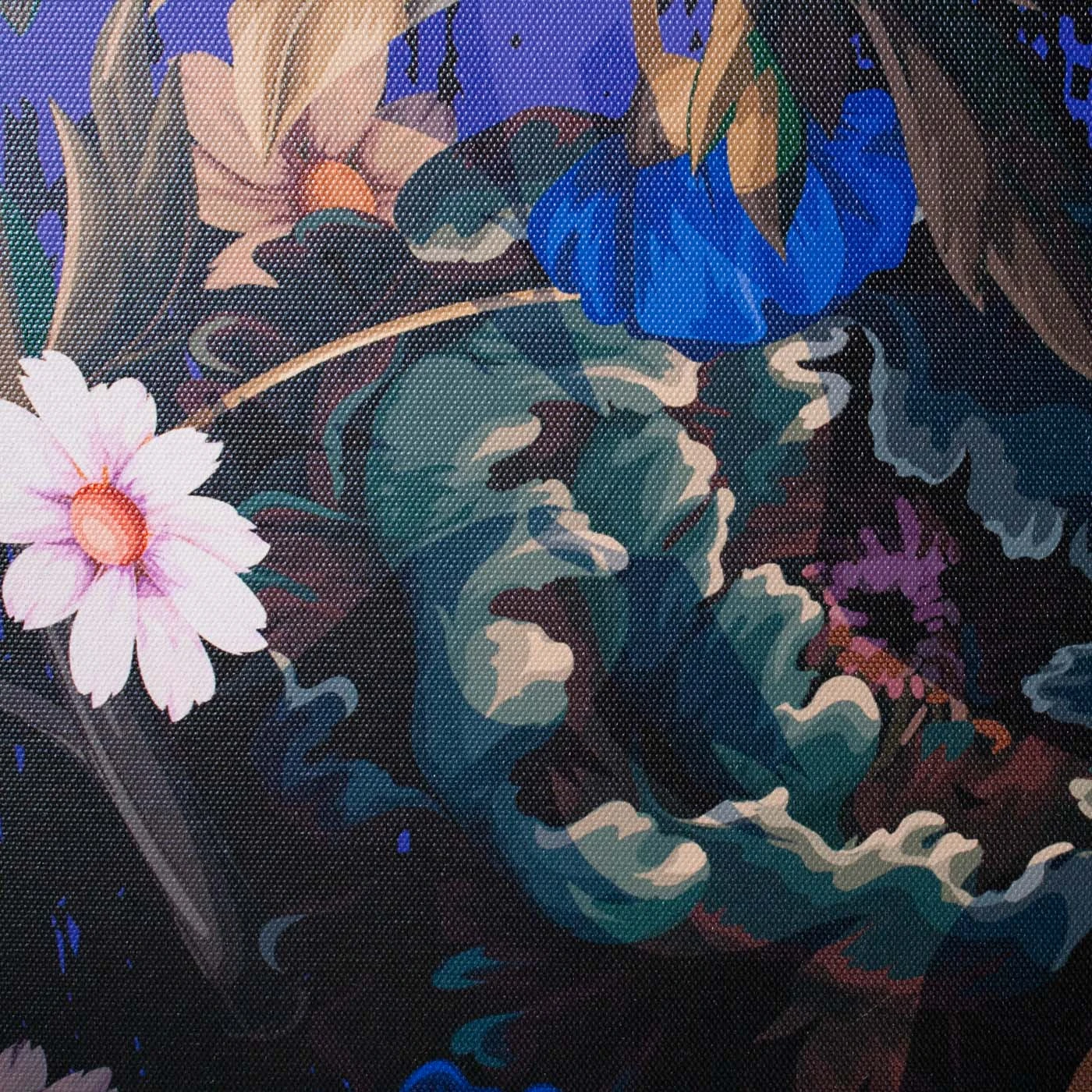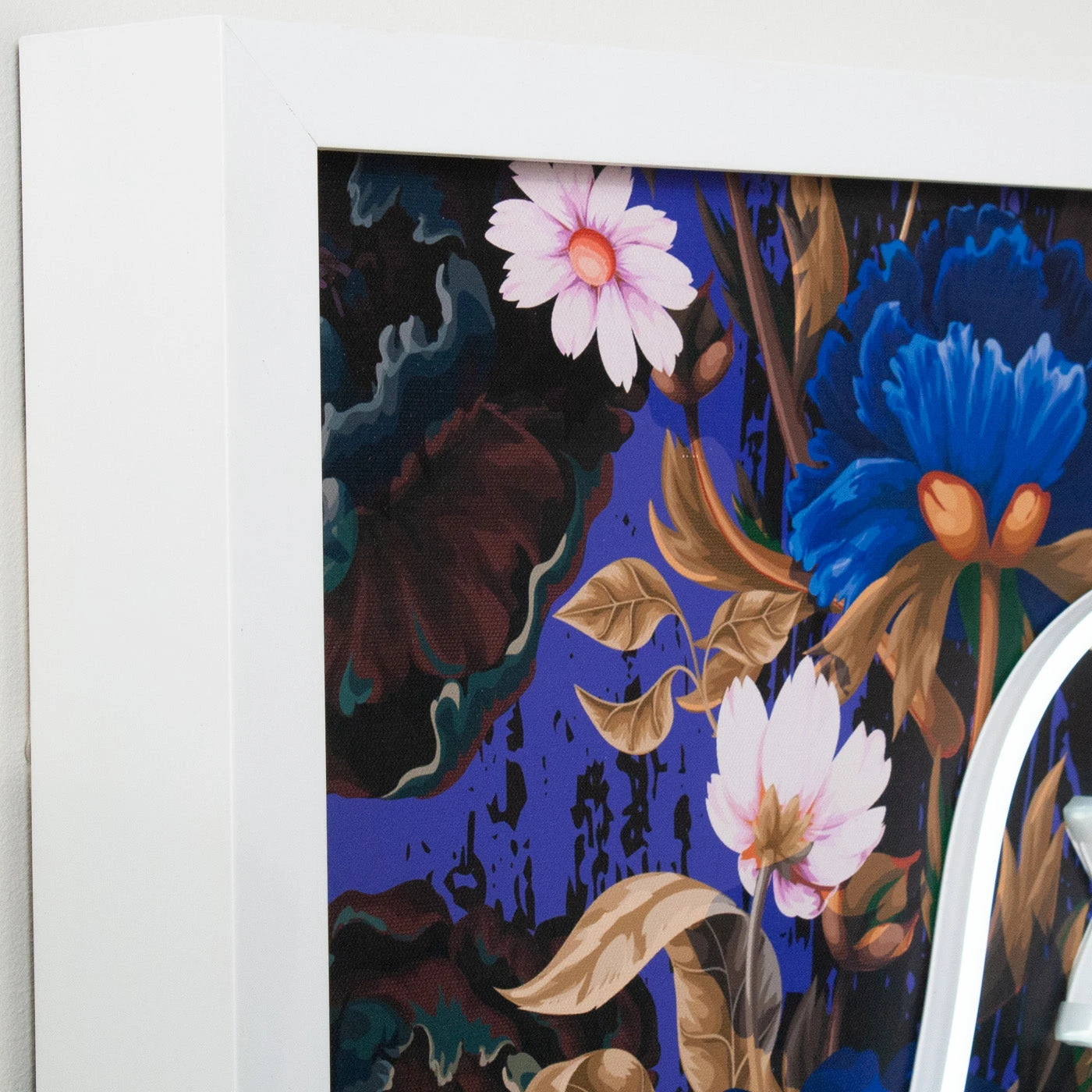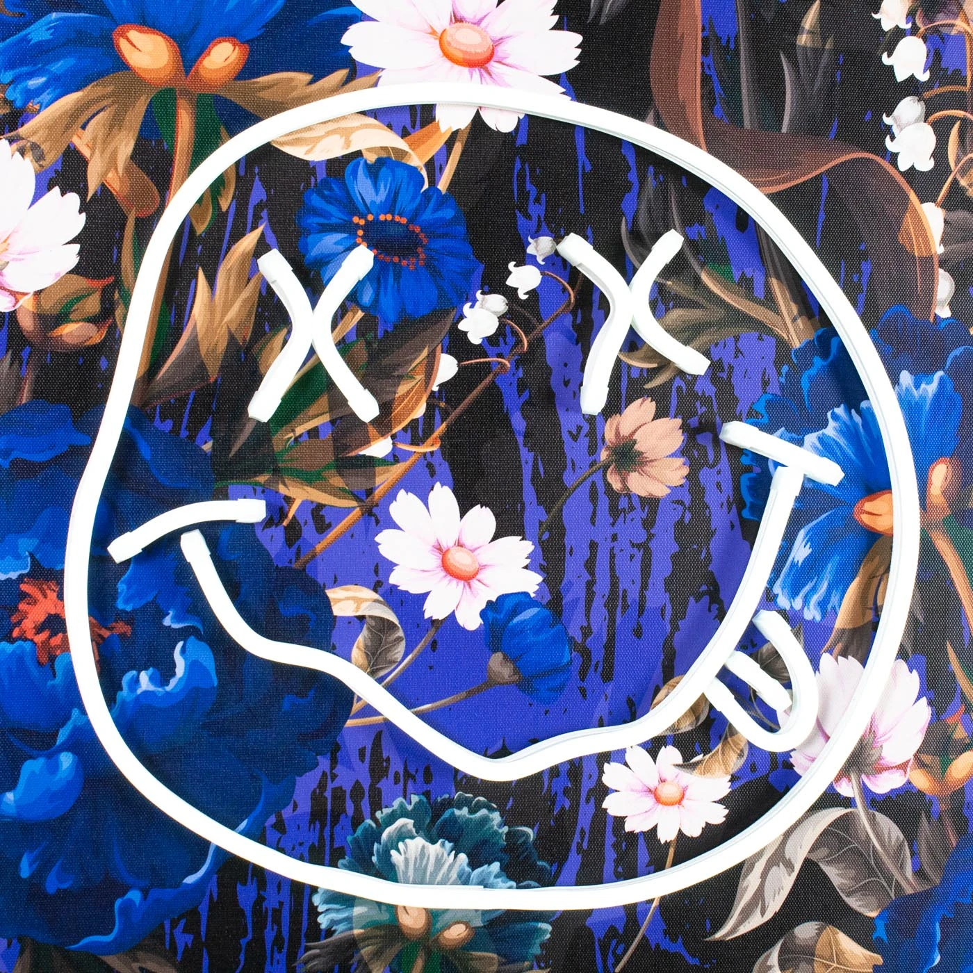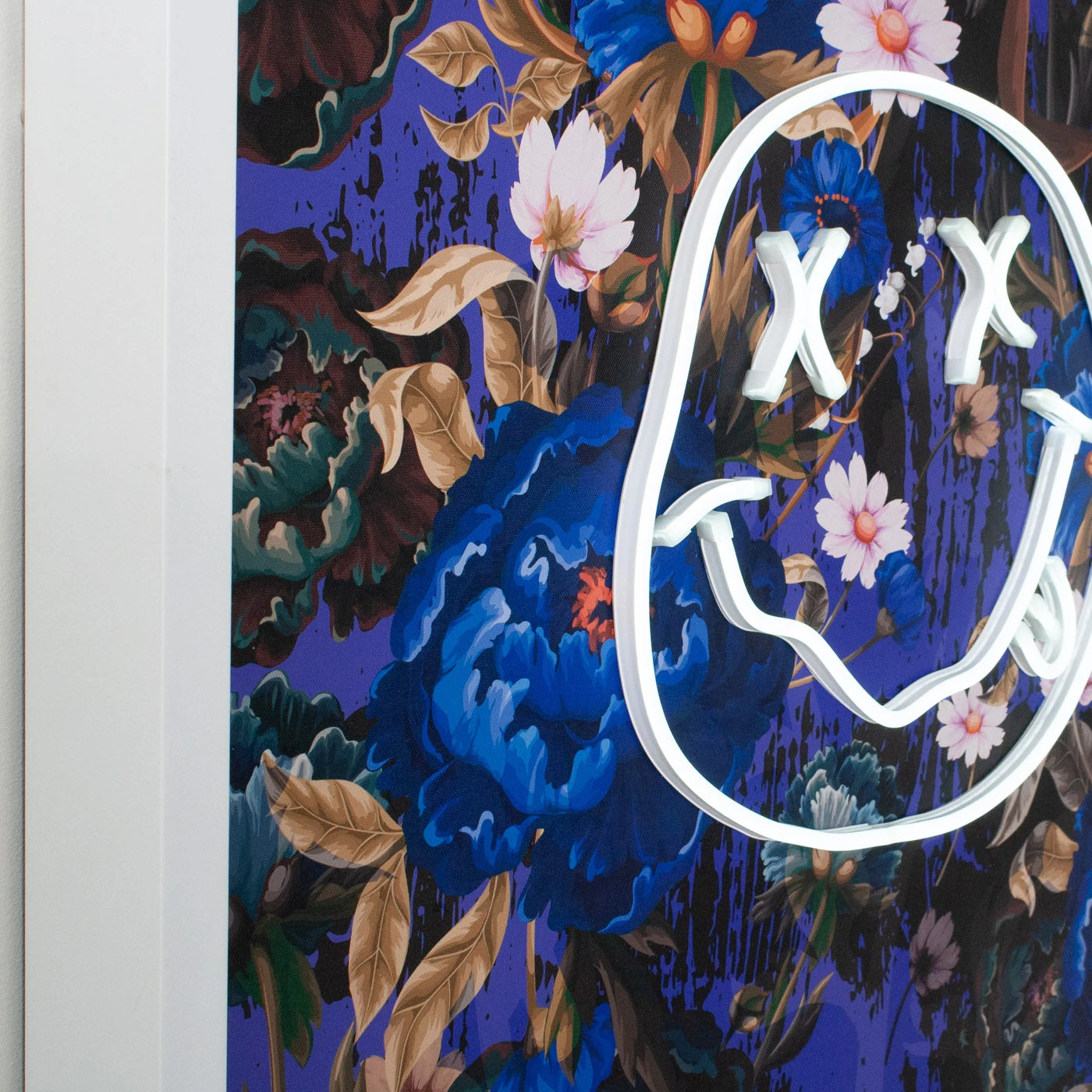 New from the Tat Frederick studio, ‘Floral Expression’ features a light-up neon smiley face against a blue floral background. Framed in white.