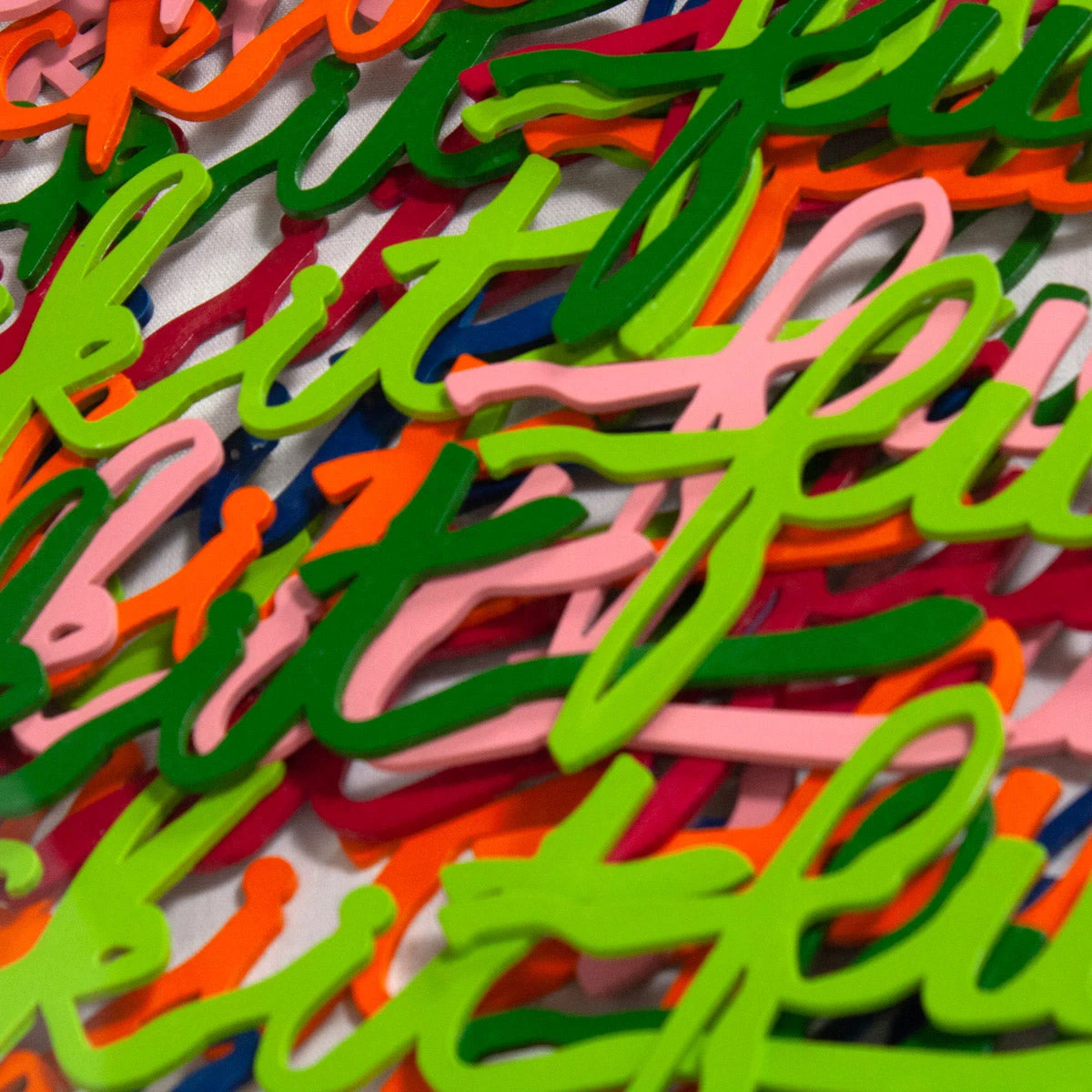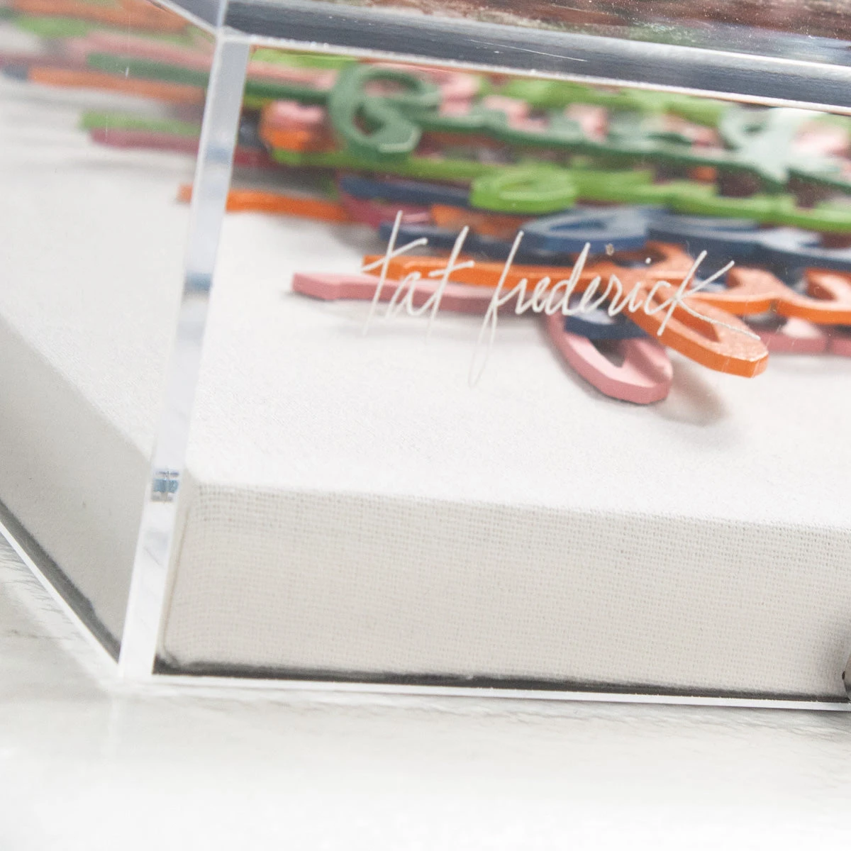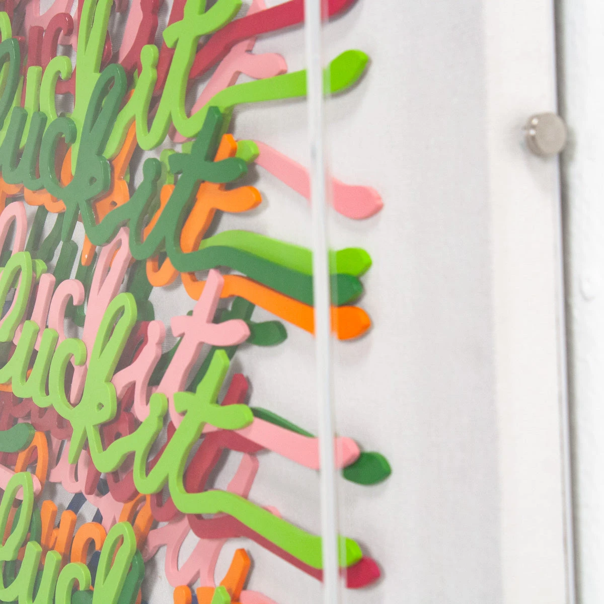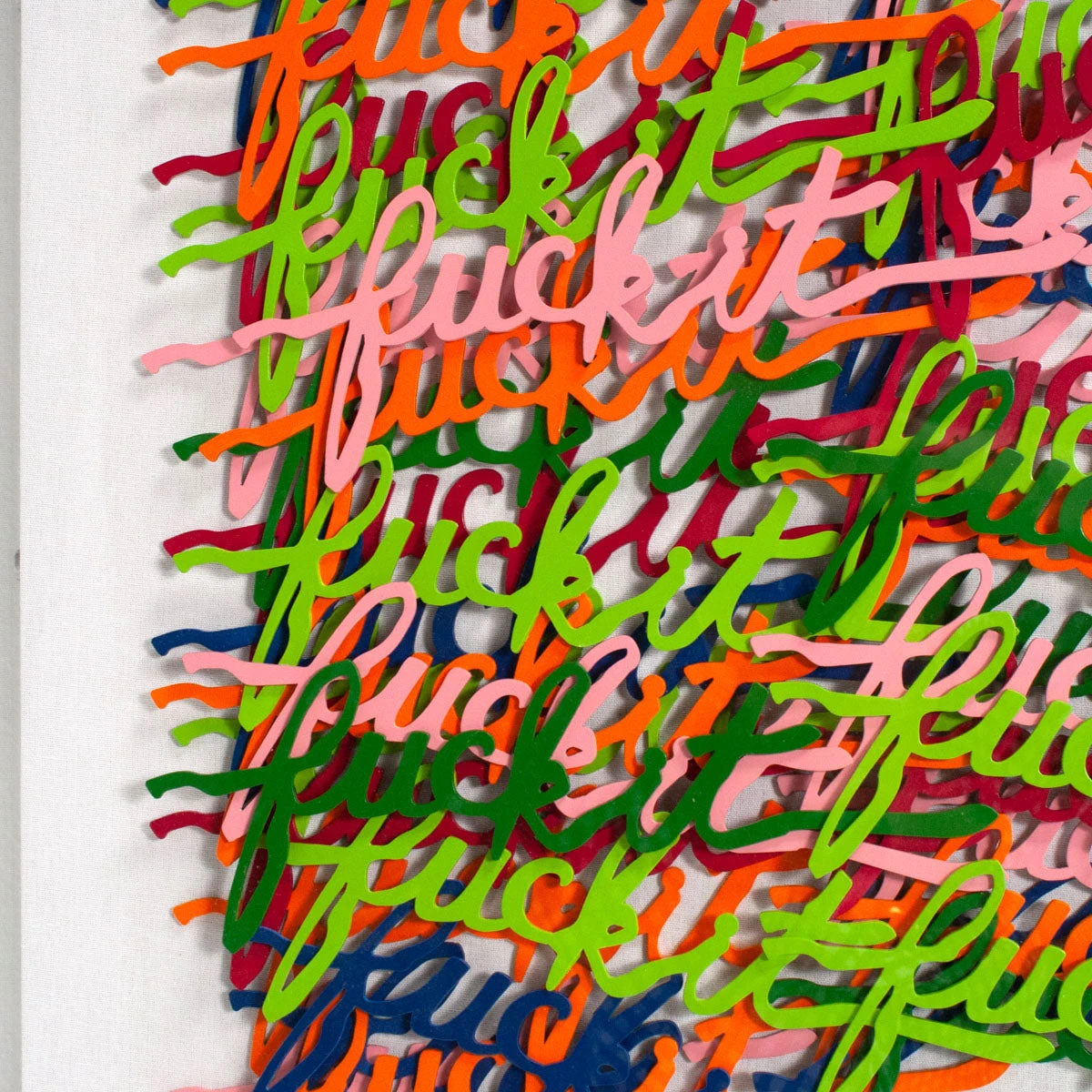 One of our favorites. A bigggg mood for sure. Laser cut words “fuck it” are individually placed on white canvas and framed in an acrylic shadowbox.Â