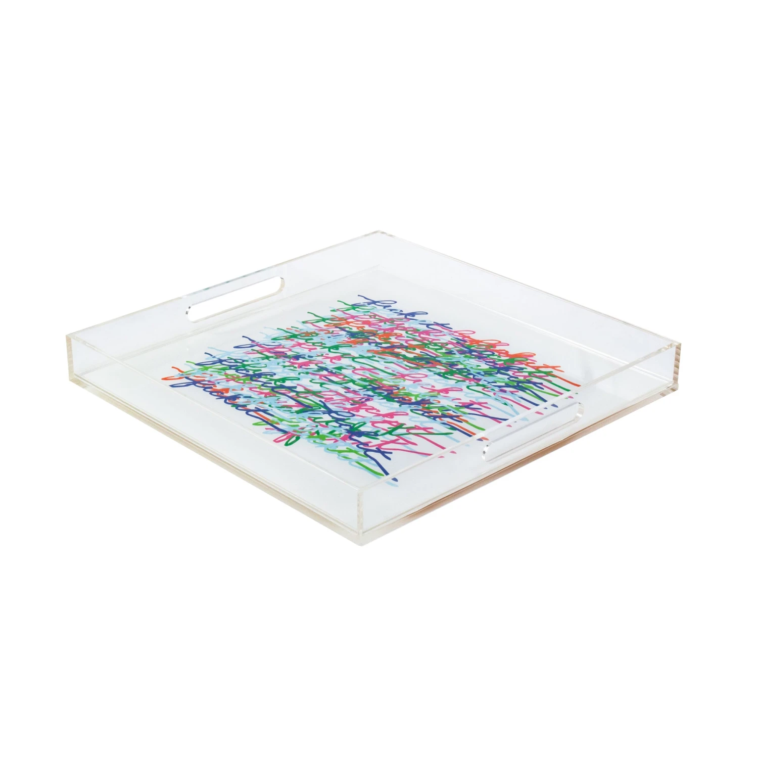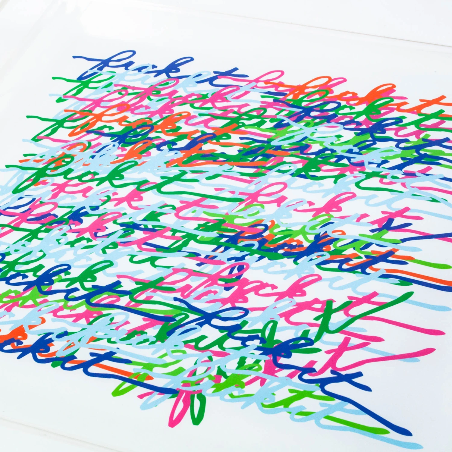 Acrylic tray with printed words “fuck it” in rainbow coloring.