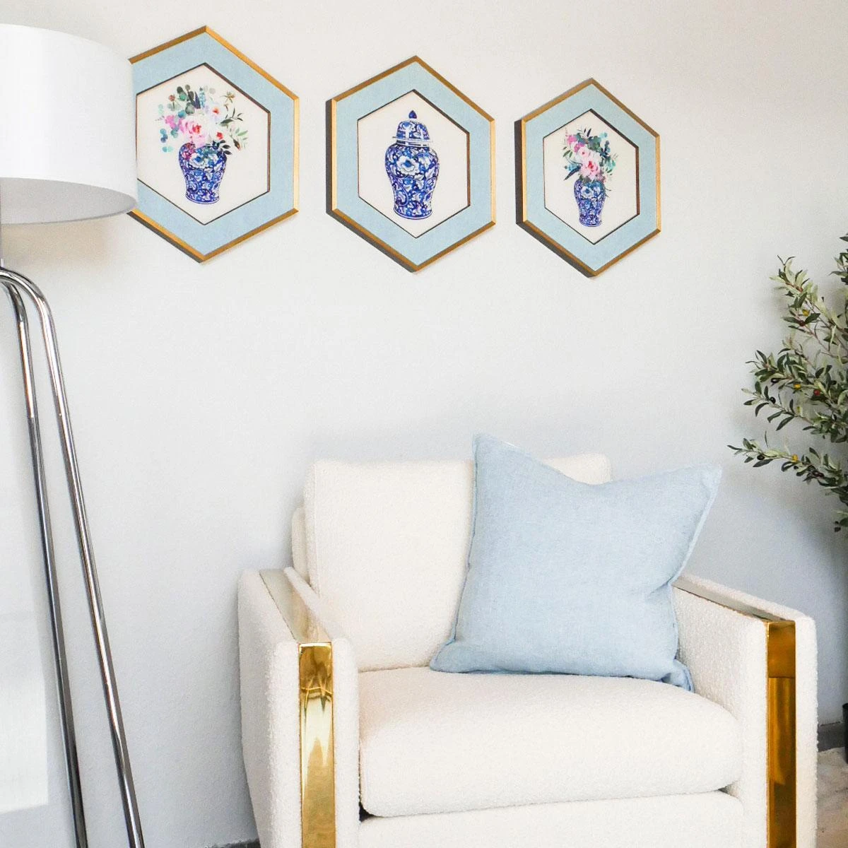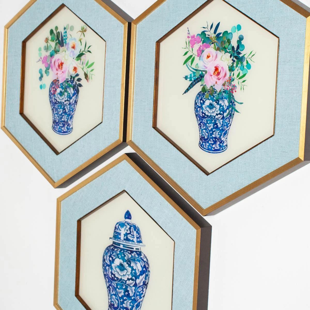 Combine it however you please. Our ginger vase set of Hexagon art comes with three pieces to arrange.