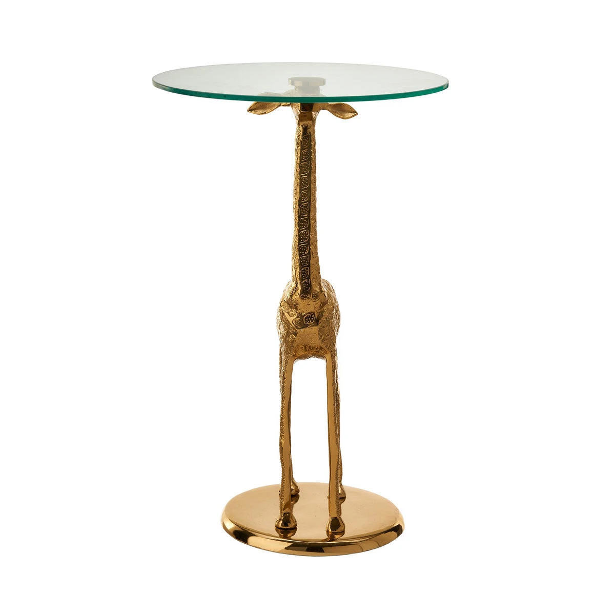 Made from metal with a shiny gold finish and topped with glass.