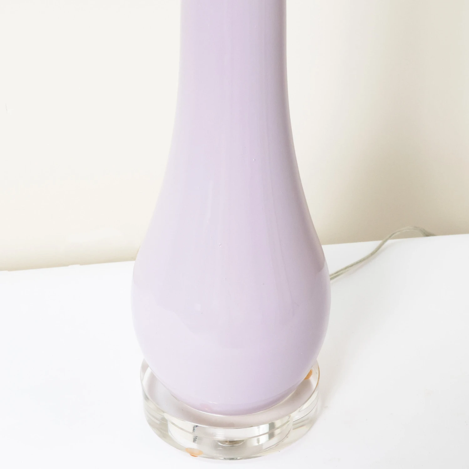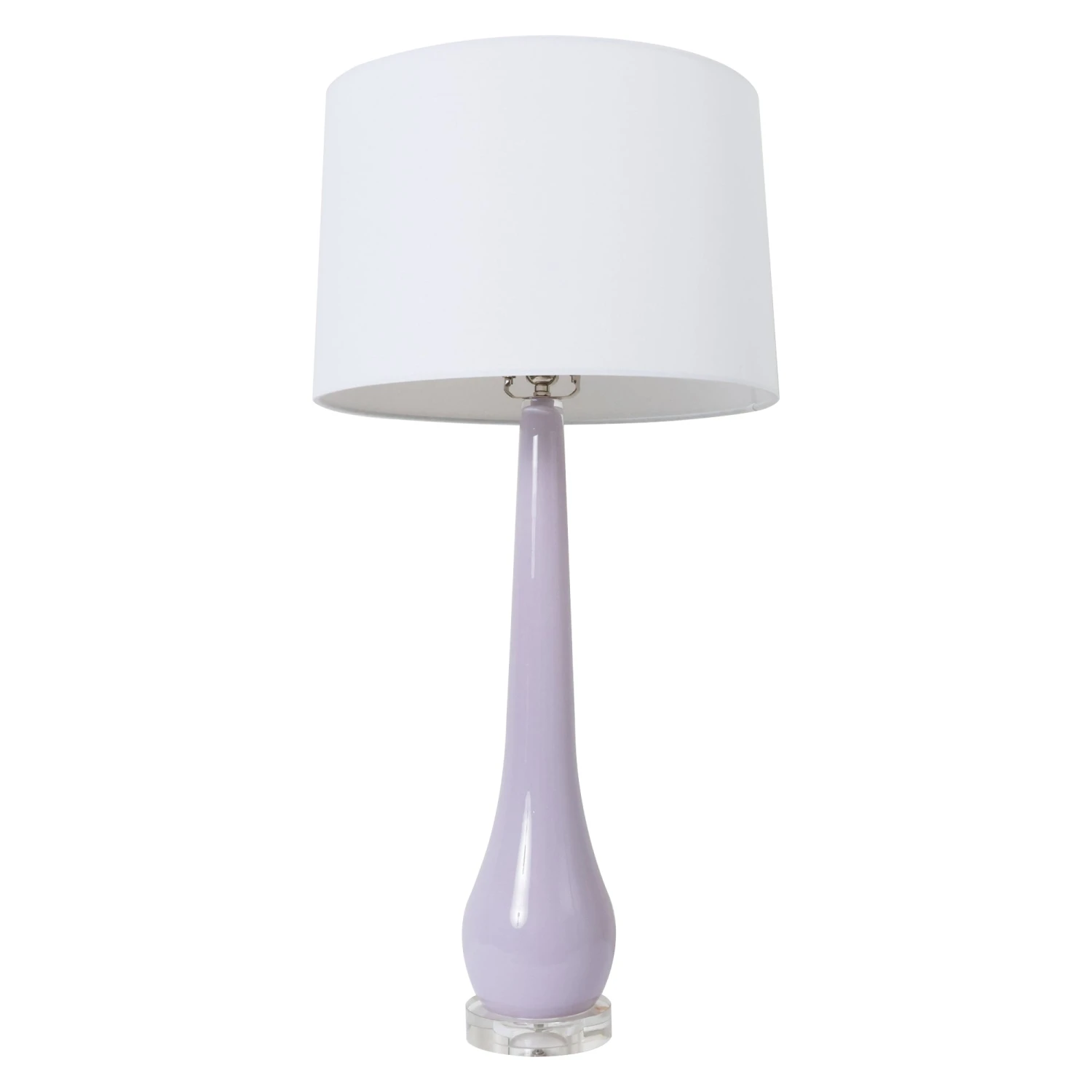 This gorgeous Italianate hand blown glass lamp features an acrylic base and a white linen shade with a round acrylic finial. We love the purple hue on this graceful design.