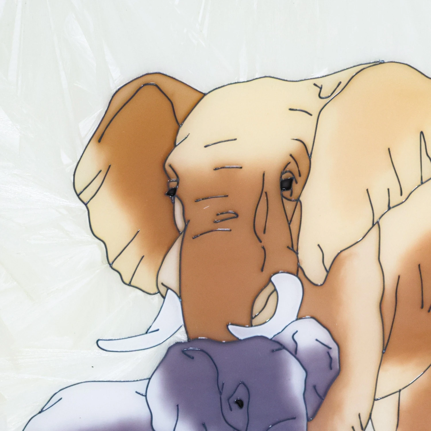 This opaque mosaic hangs on the wall with colored glass art that depicts elephants. Lights up when plugged in. This is what nursery decor dreams are made of!