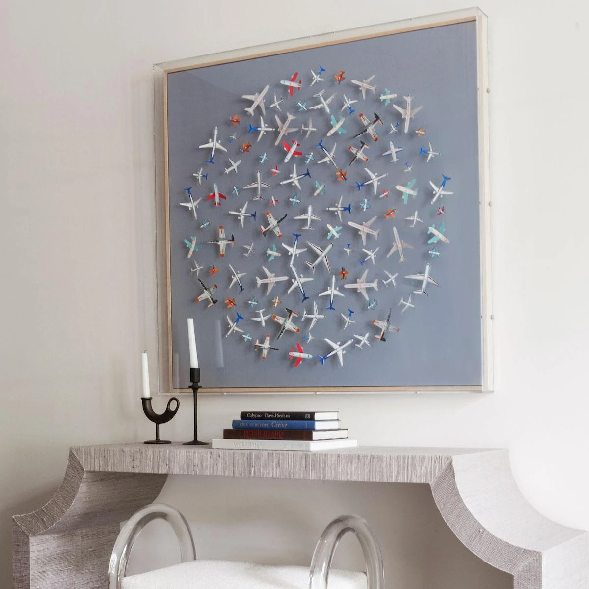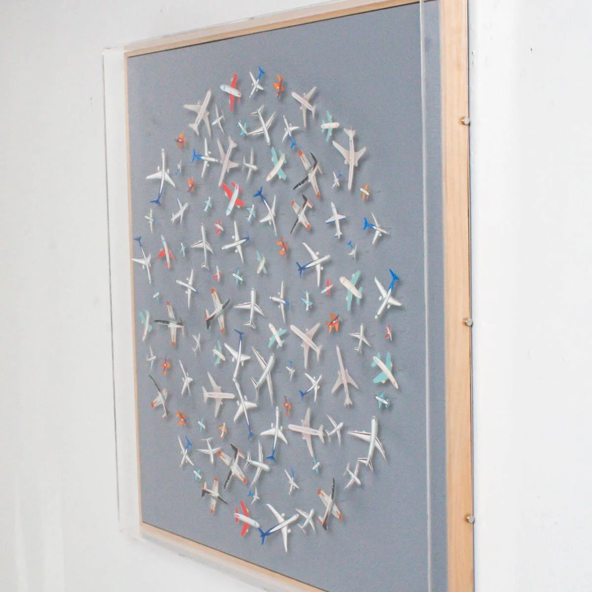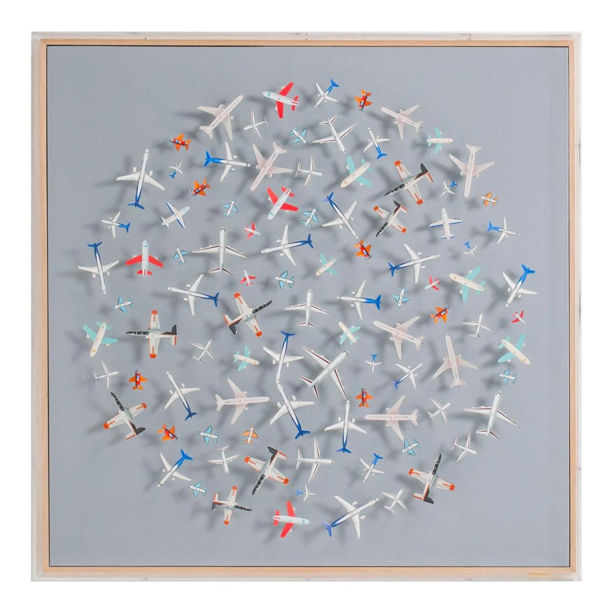 Printed airplanes are hand-cut and individually pinned to a grey canvas. Each piece is handmade and will have some variations in color and finish. Framed in blonde wood with an acrylic shadowbox.