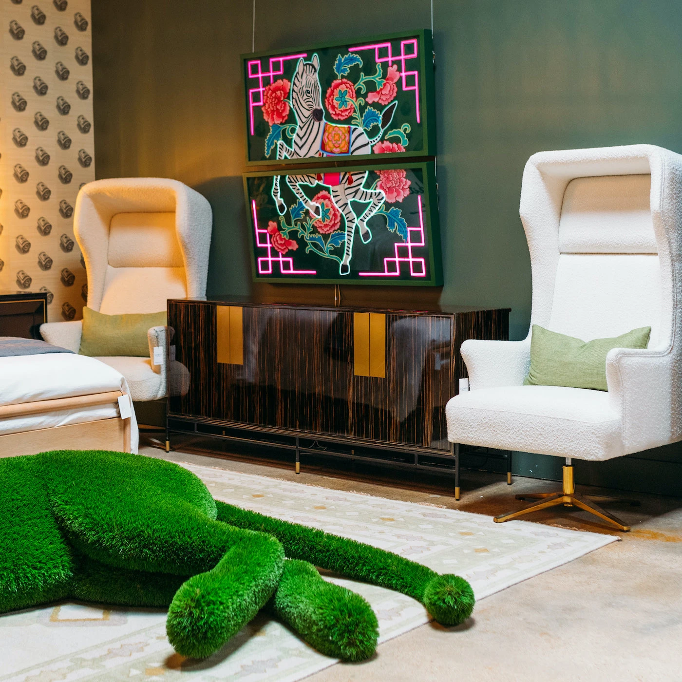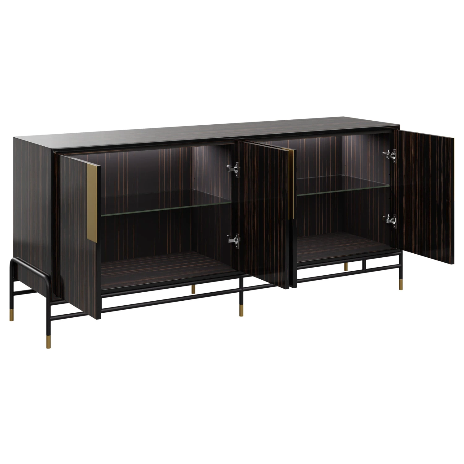 Our Junius Sideboard features gorgeous ebony wood veneer with a high gloss finish. Brass details and slim black legs create sleek contrast. A glass shelf behind both doors provides storage.