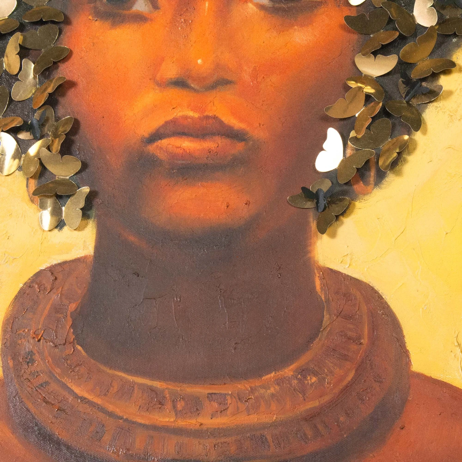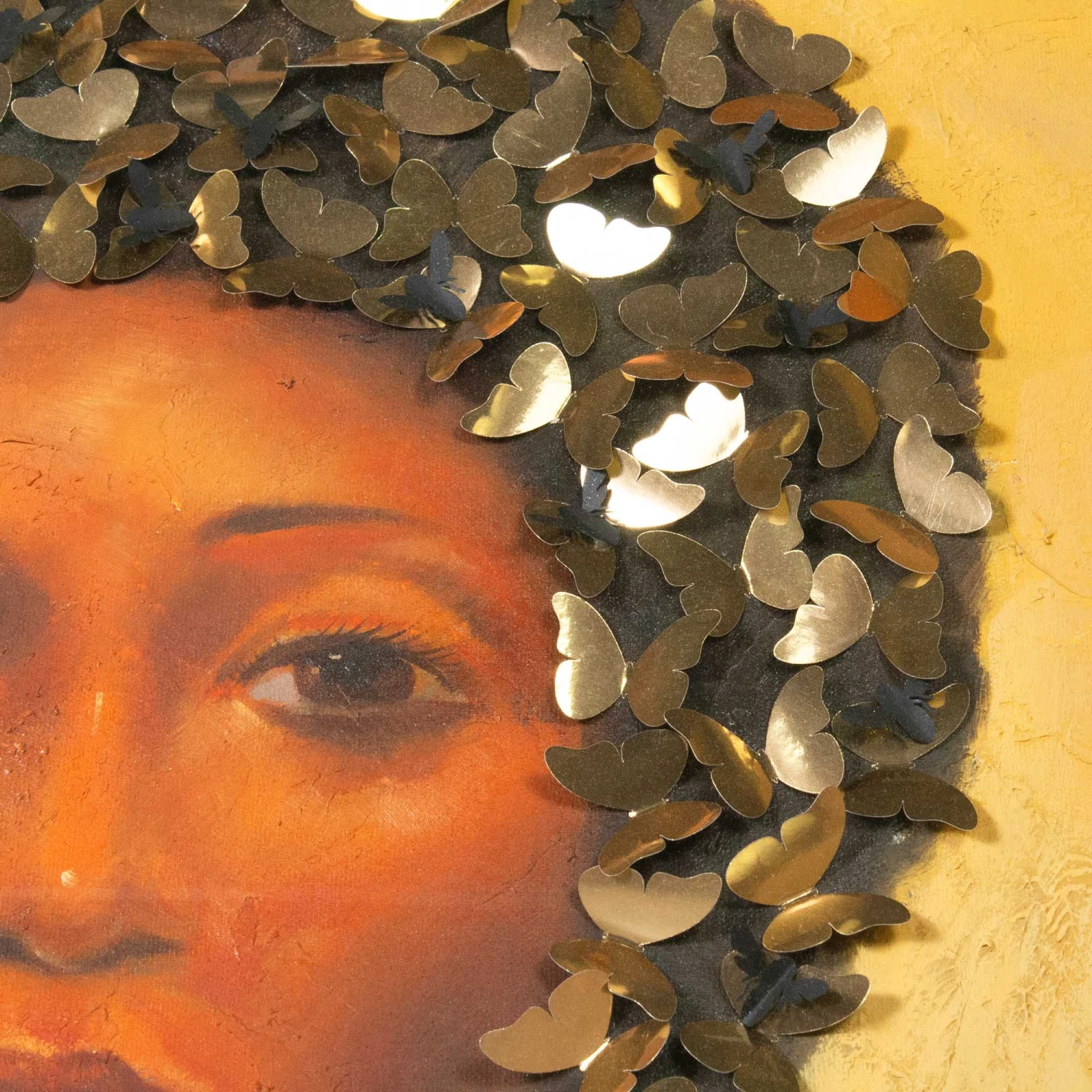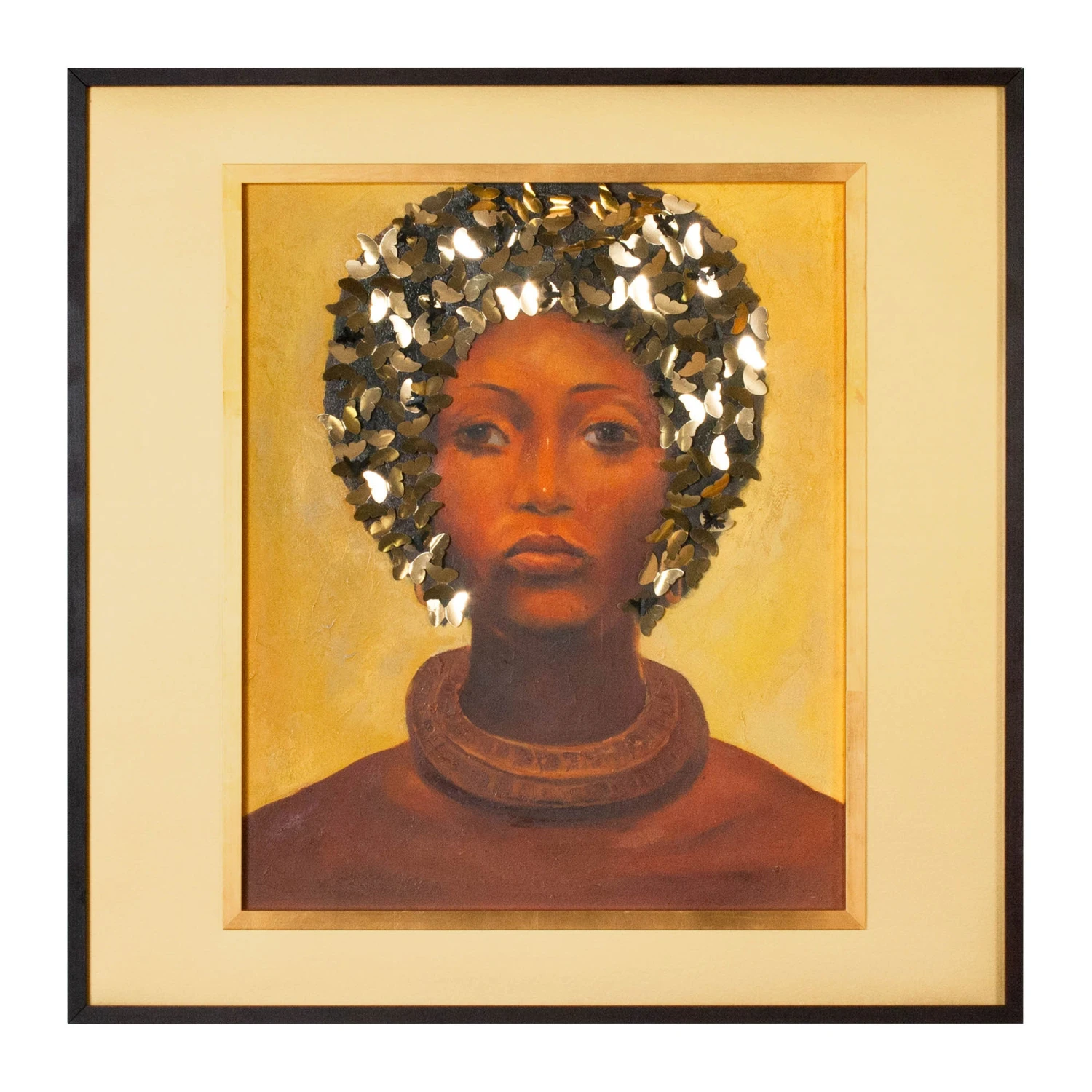 A modern-day blend of chiaroscuro and mixed media, Lady Zola is printed on canvas with a swarm of gold butterflies and bees in her hair.Â