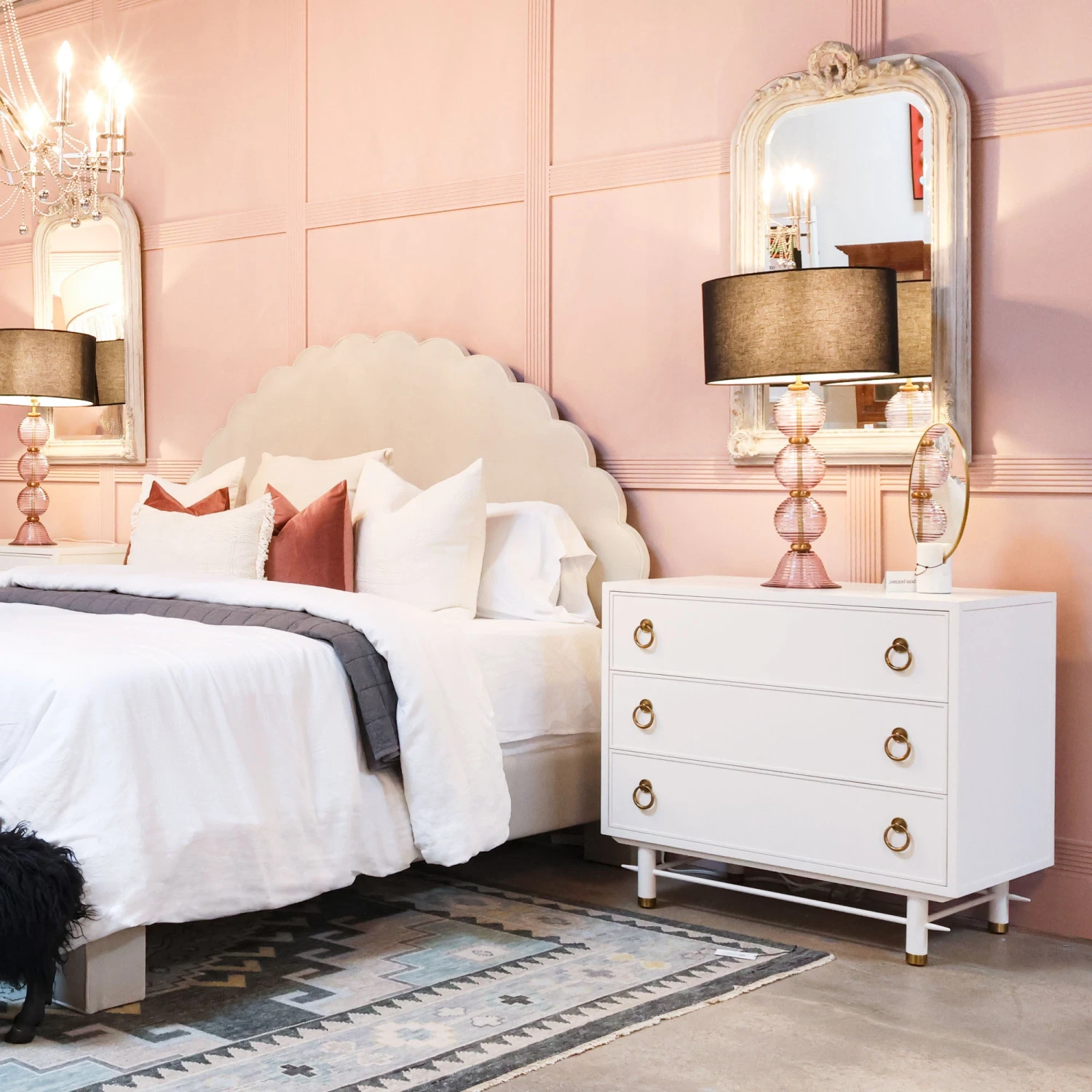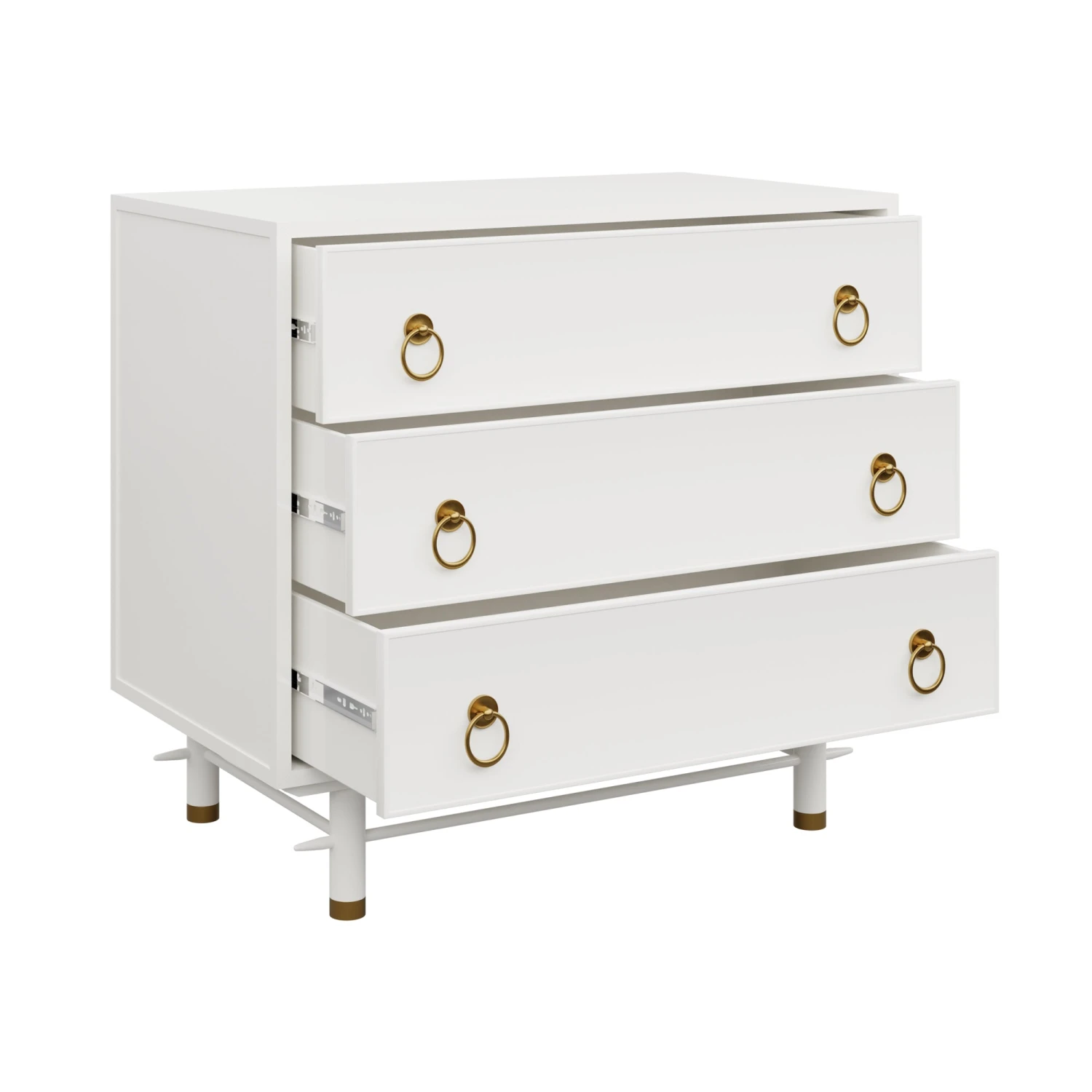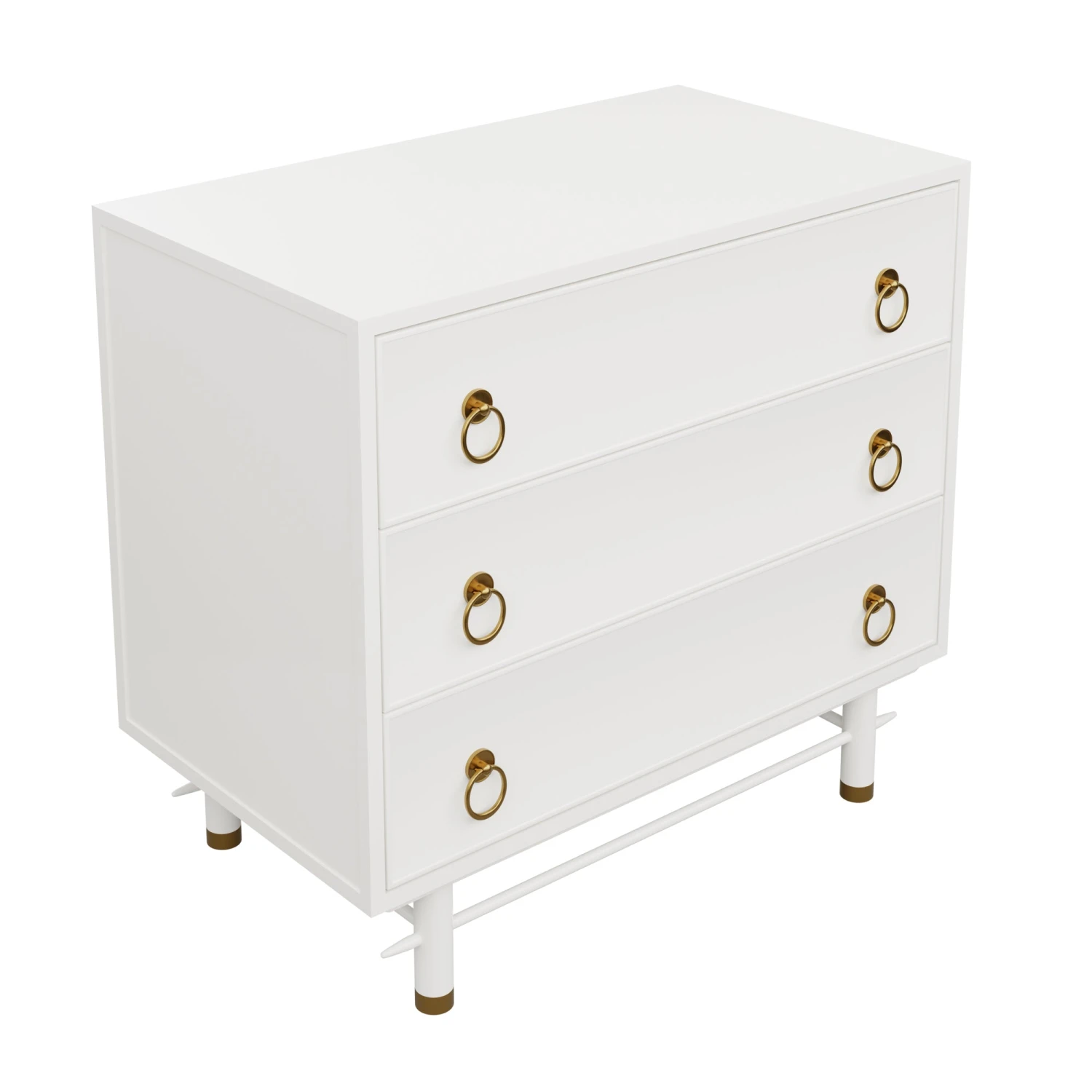 Now available with 3 drawers, our Laird Chest keeps it unique with a cross bar base and shiny brass ring pulls. The matte white lacquer frame encases 3 roomy, soft-close drawers so you can store your goodies in style.