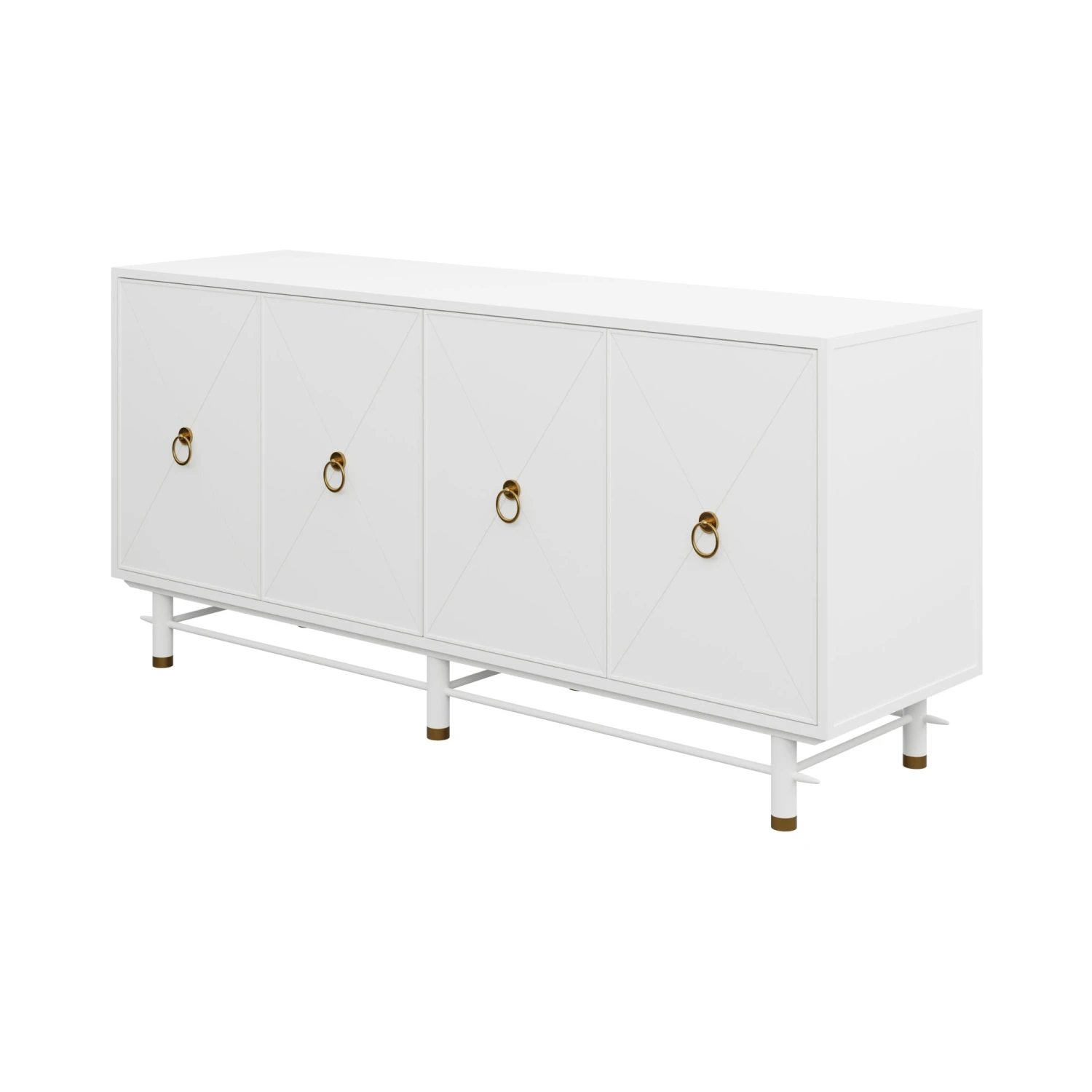 Now available as a credenza, Laird keeps it unique with a cross bar base and diamond cutouts. Matte white lacquer frames 4 doors that open to reveal 2 roomy cabinet interiors with a soft close drawer on the right side and an adjustable shelf on the left.Â