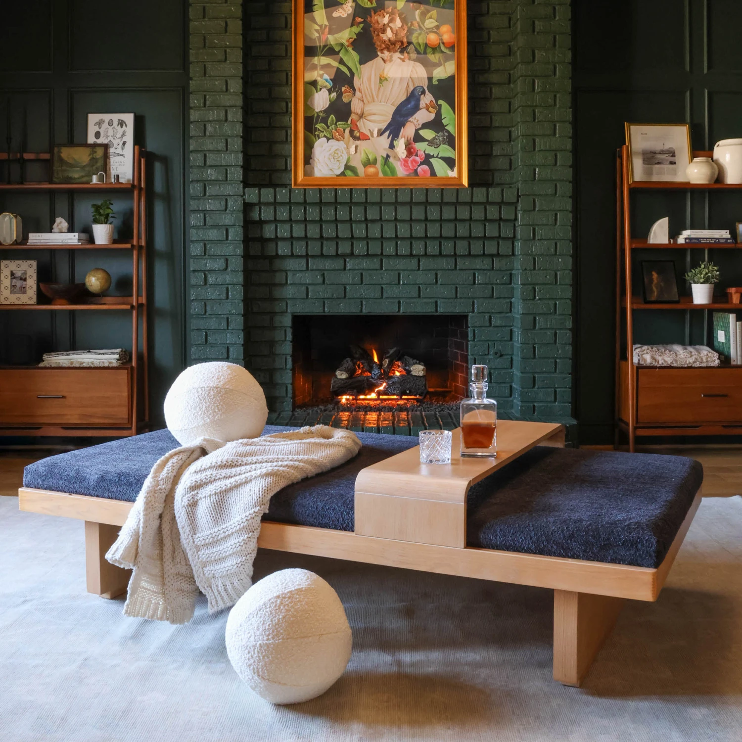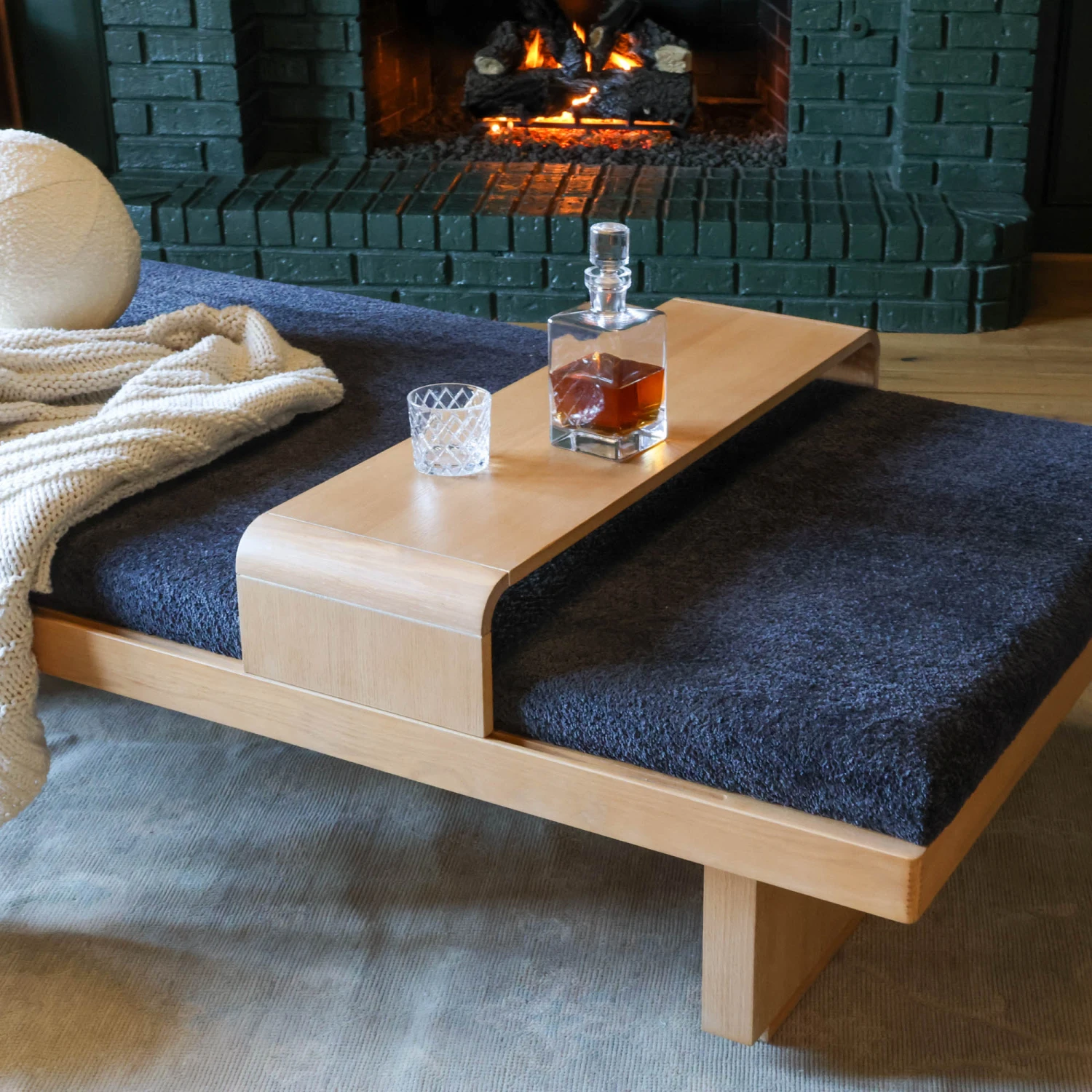 Featuring a simple design with a moveable wooden table detail that slides forwards and backwards, this bench is just as functional as it is fabulous! A simple frame with a light stain creates contemporary contrast against Lilet’s darker fabric. Soft to the touch with a tight pile, the dark grey sherpa will envelope you in luxe comfort.