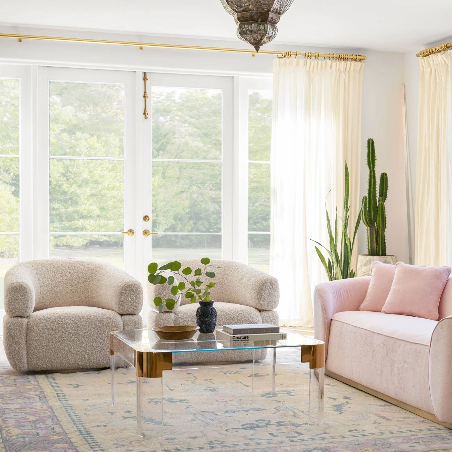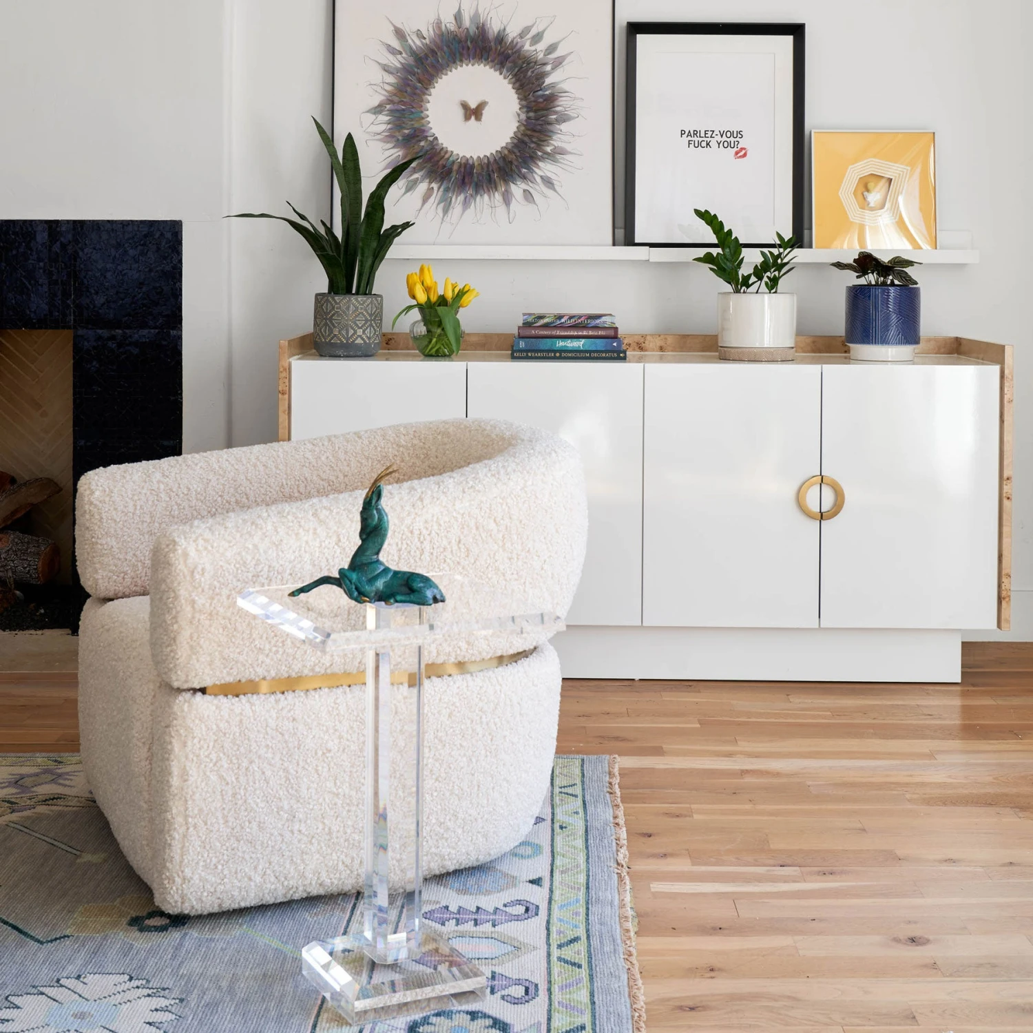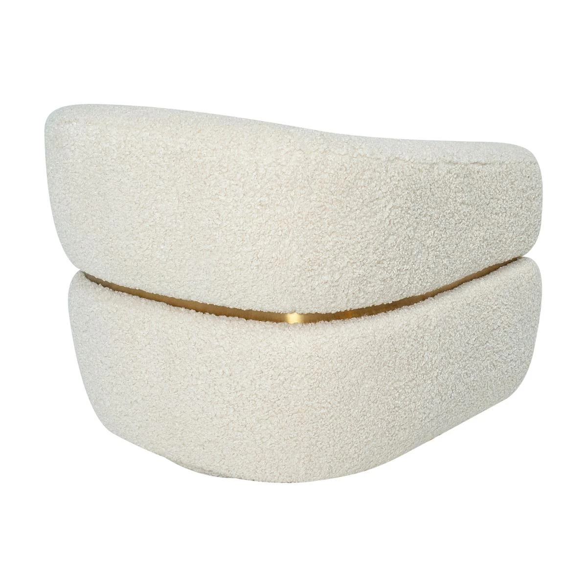 Soft to the touch and sinuous to the eye. Ivory boucle fabric is cinched with a brass waist band for extra style. A 360-degree swivel lets you take in every perspective.