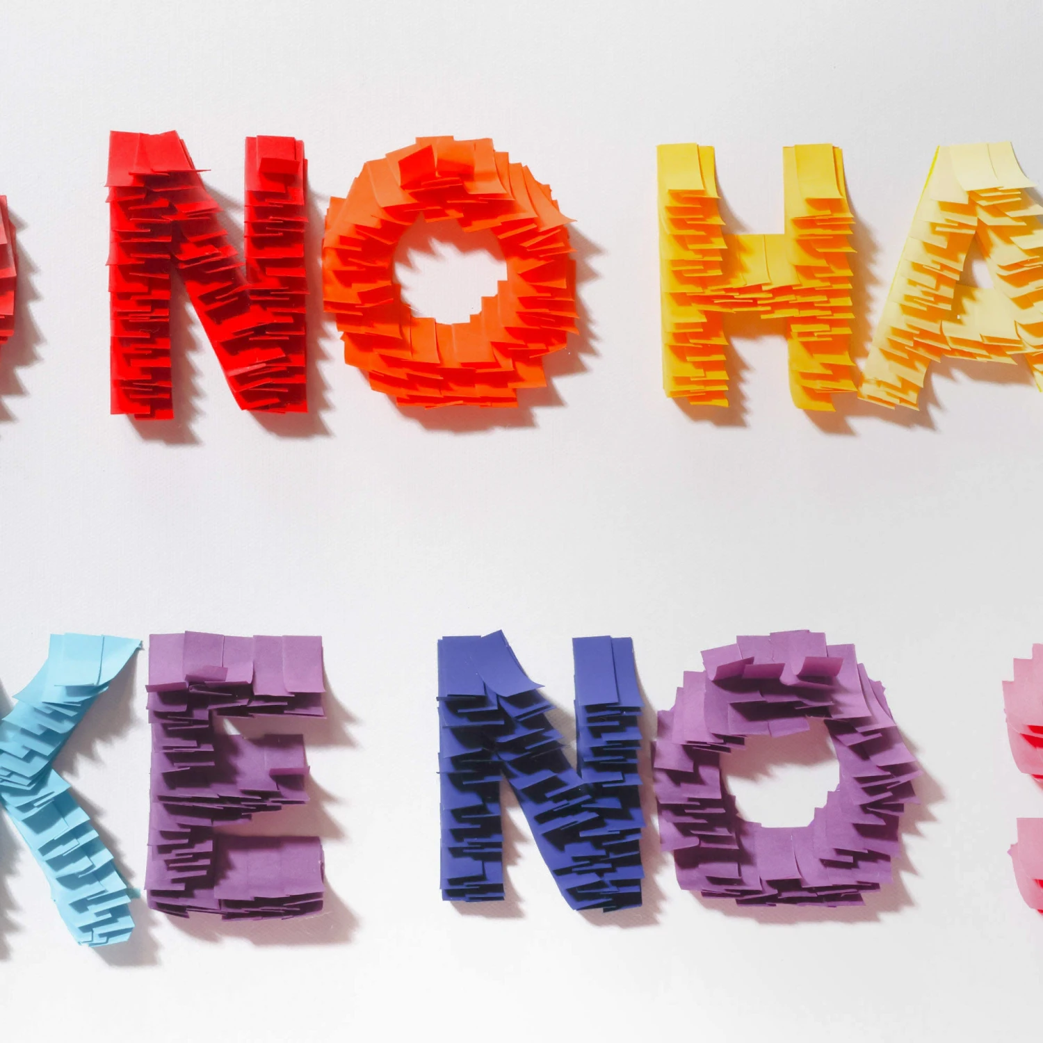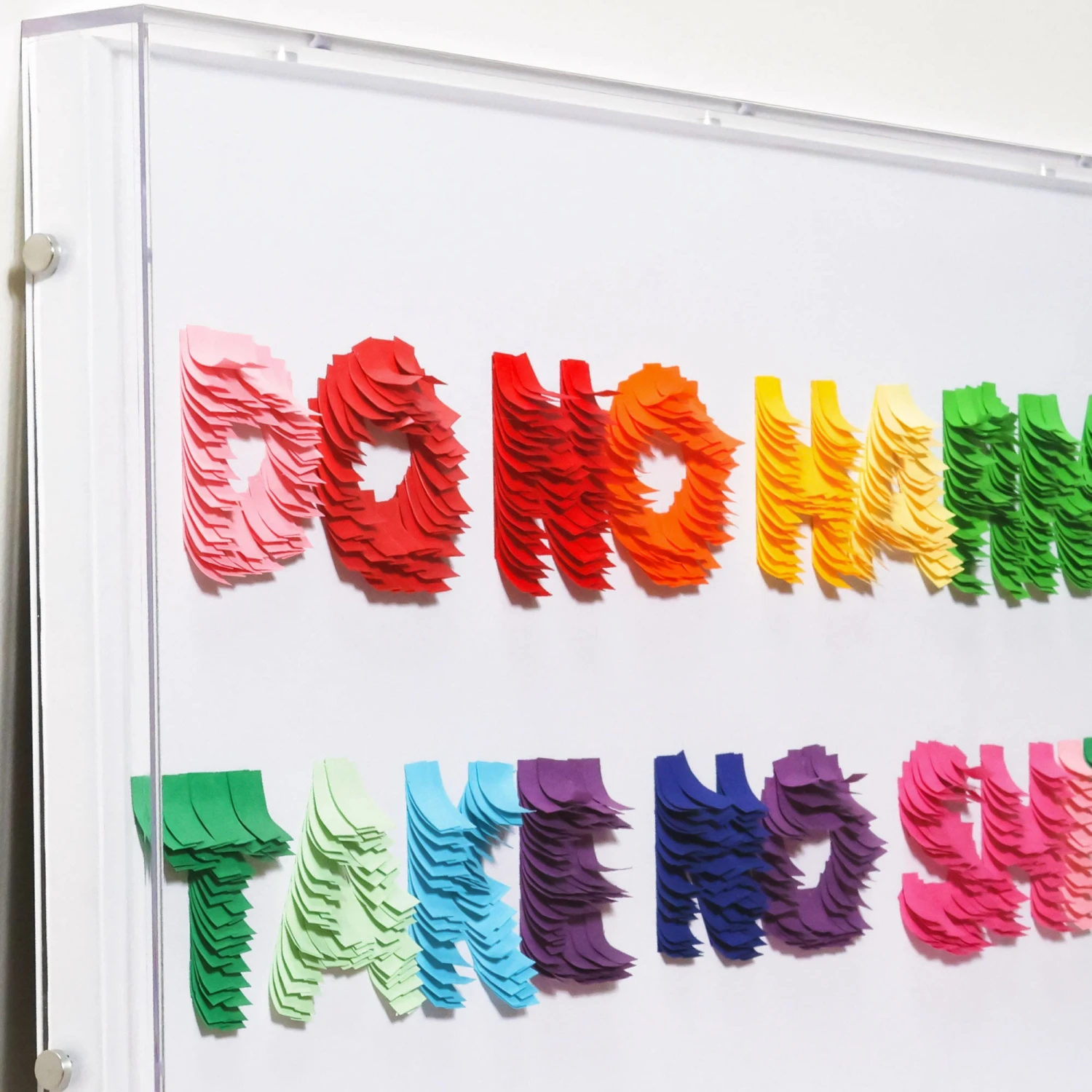 They say a picture is worth a thousand words – what about a thousand post it notes? New from the Tat Frederick studio, this piece features colorful post it notes making up the phrase ‘Do not harm. Take no shit.’Â