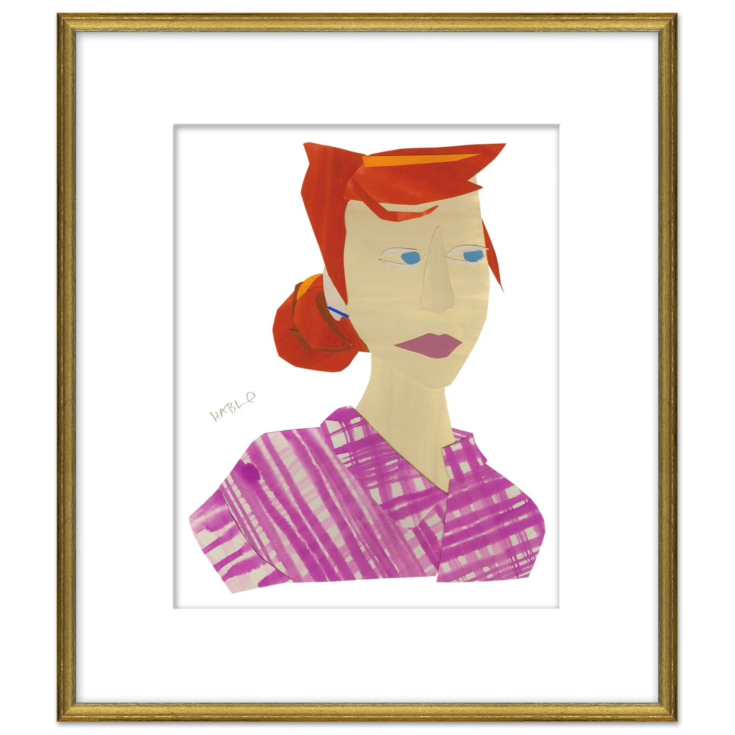 Colorful giclée print of a portrait created by Susan Hable. ‘Portrait Series – Caroline‘ is printed on archival paper and framed in a black and gold frame.