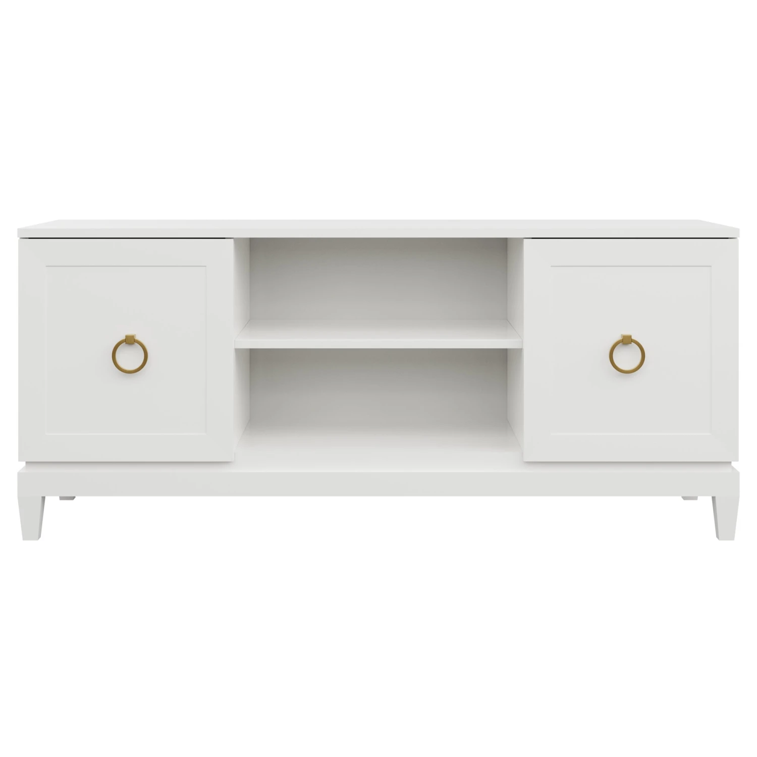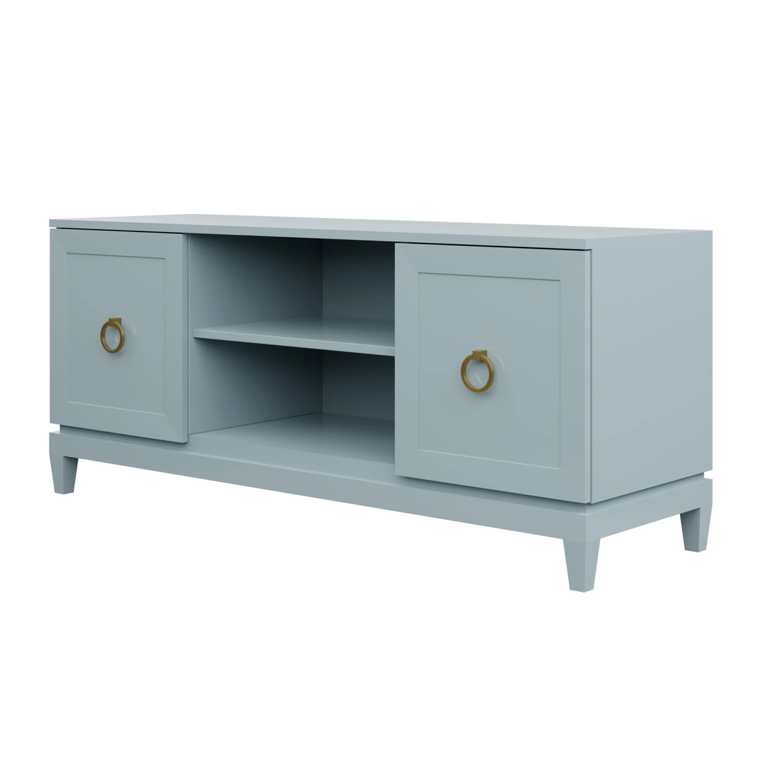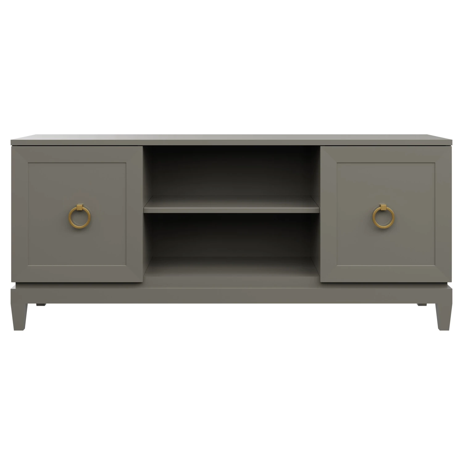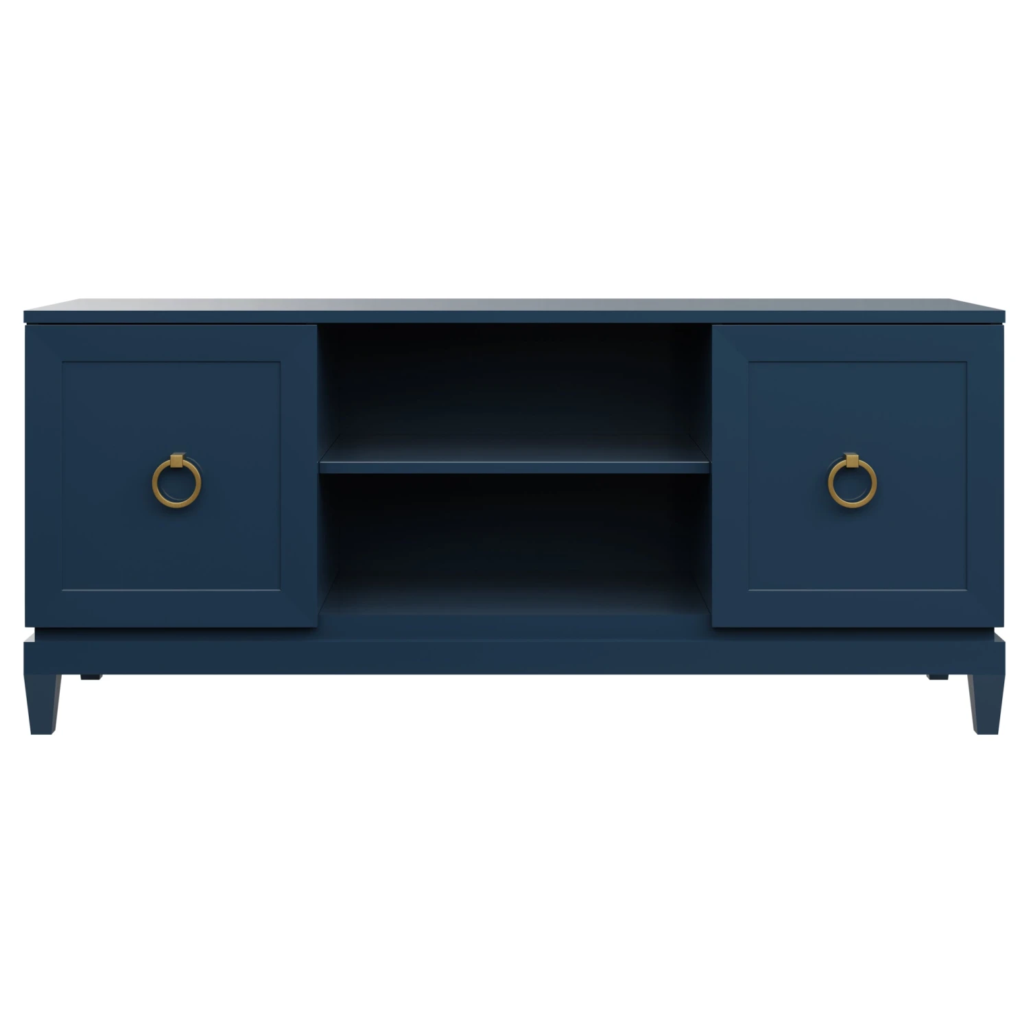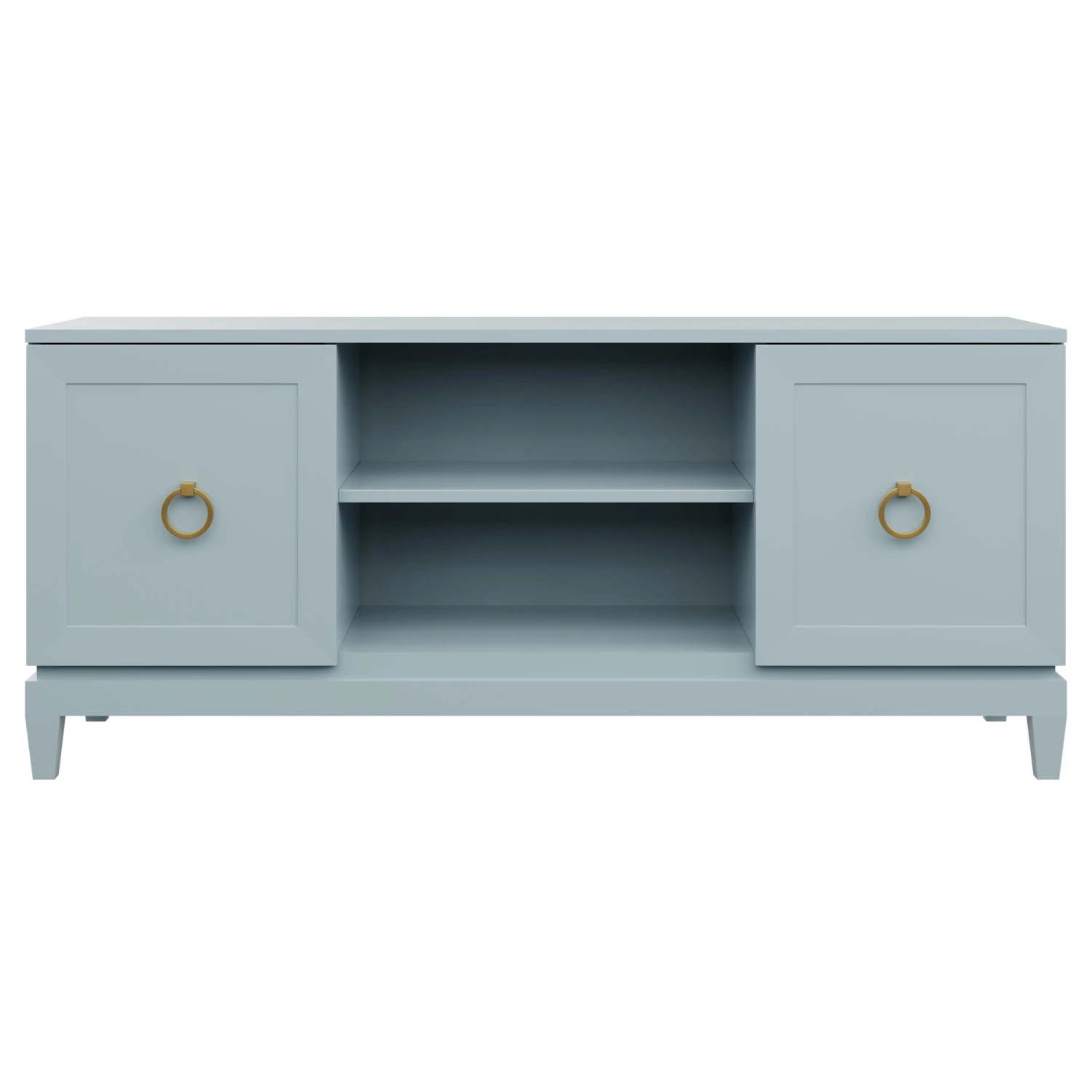 Open middle shelves and two cabinets make the Queen a perfect media cabinet. Features two 3″ holes for cables behind each closed cabinet and 3″ brass ring hardware.