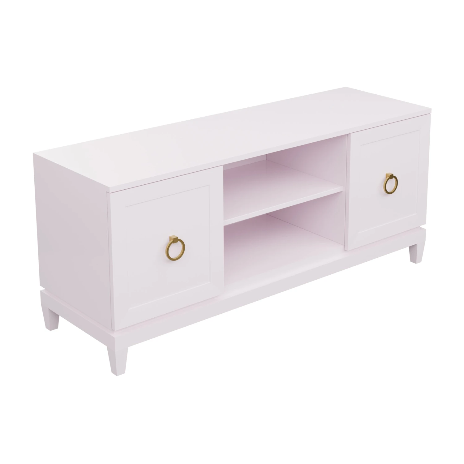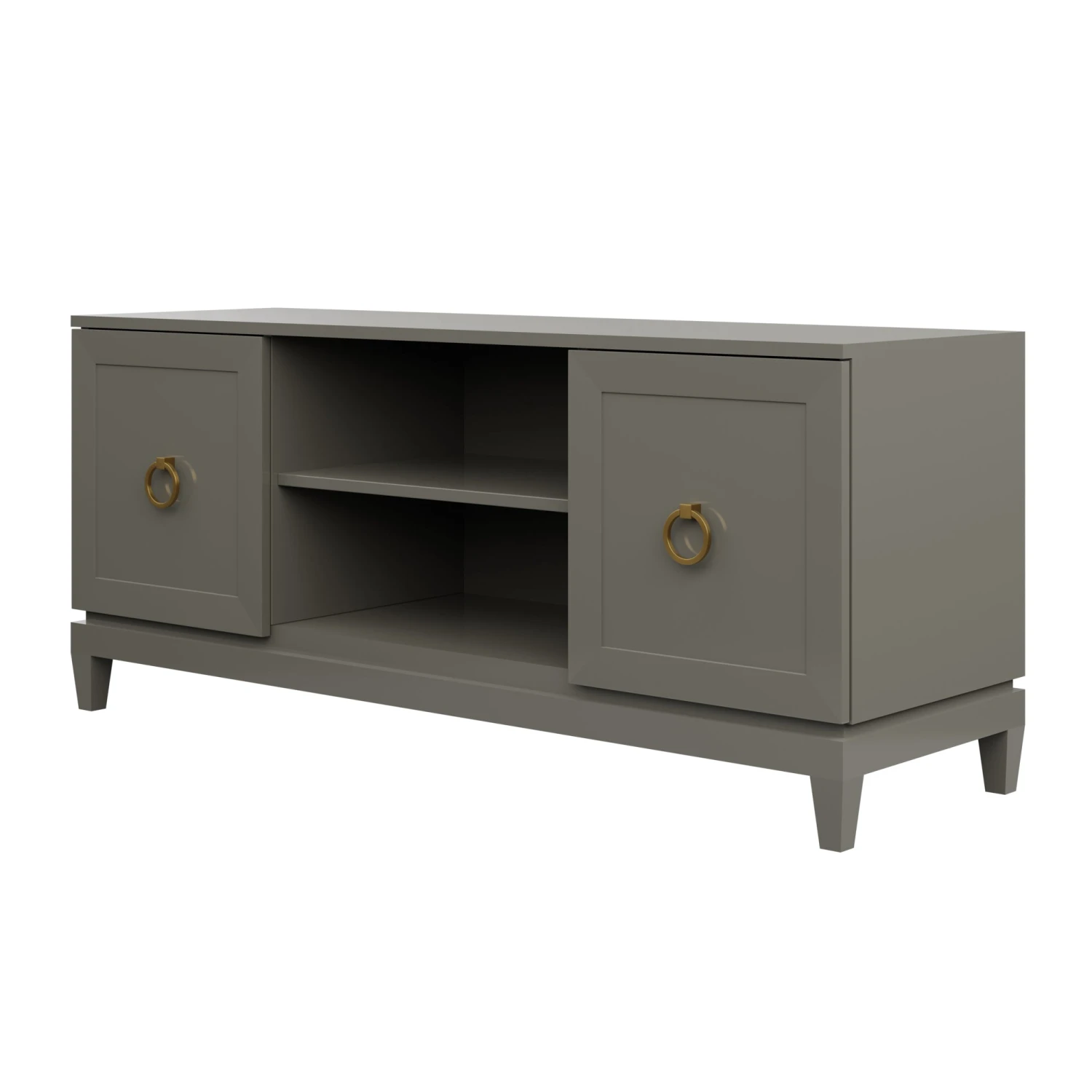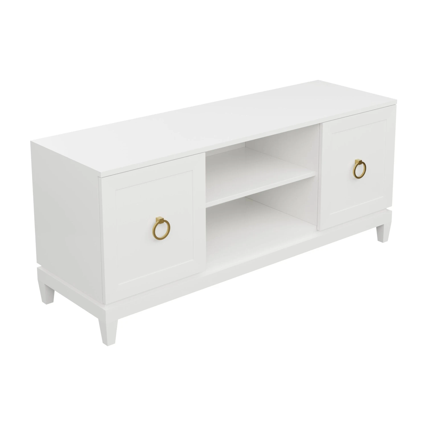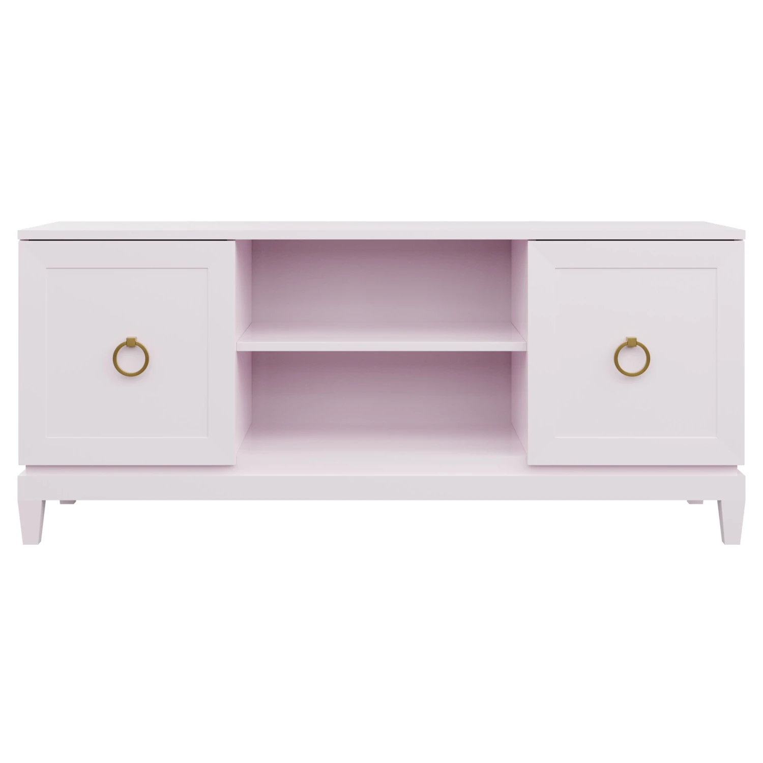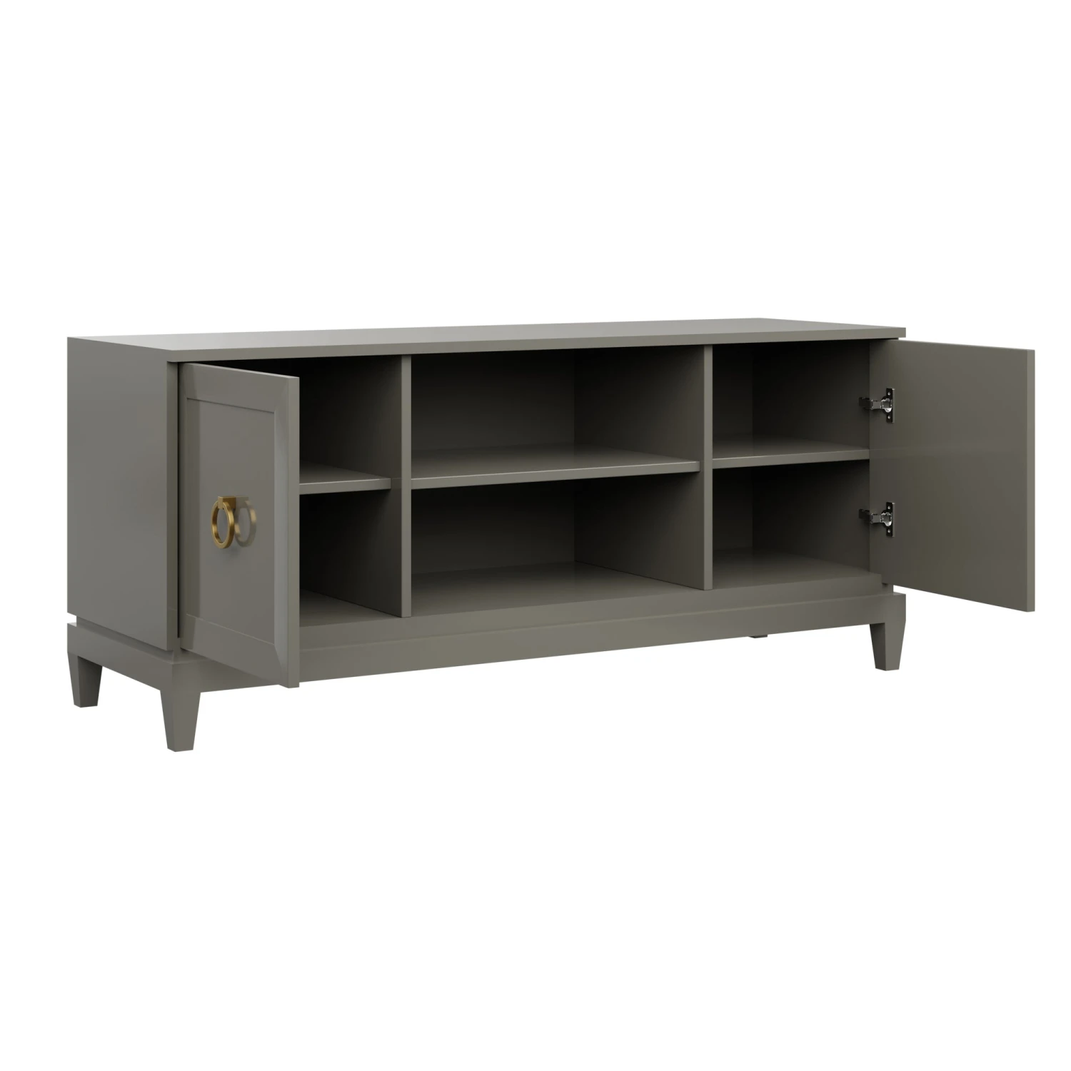 Open middle shelves and two cabinets make the Queen a perfect media cabinet. Features two 3″ holes for cables behind each closed cabinet and 3″ brass ring hardware.