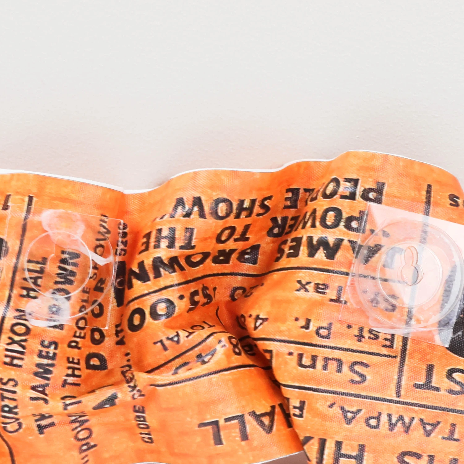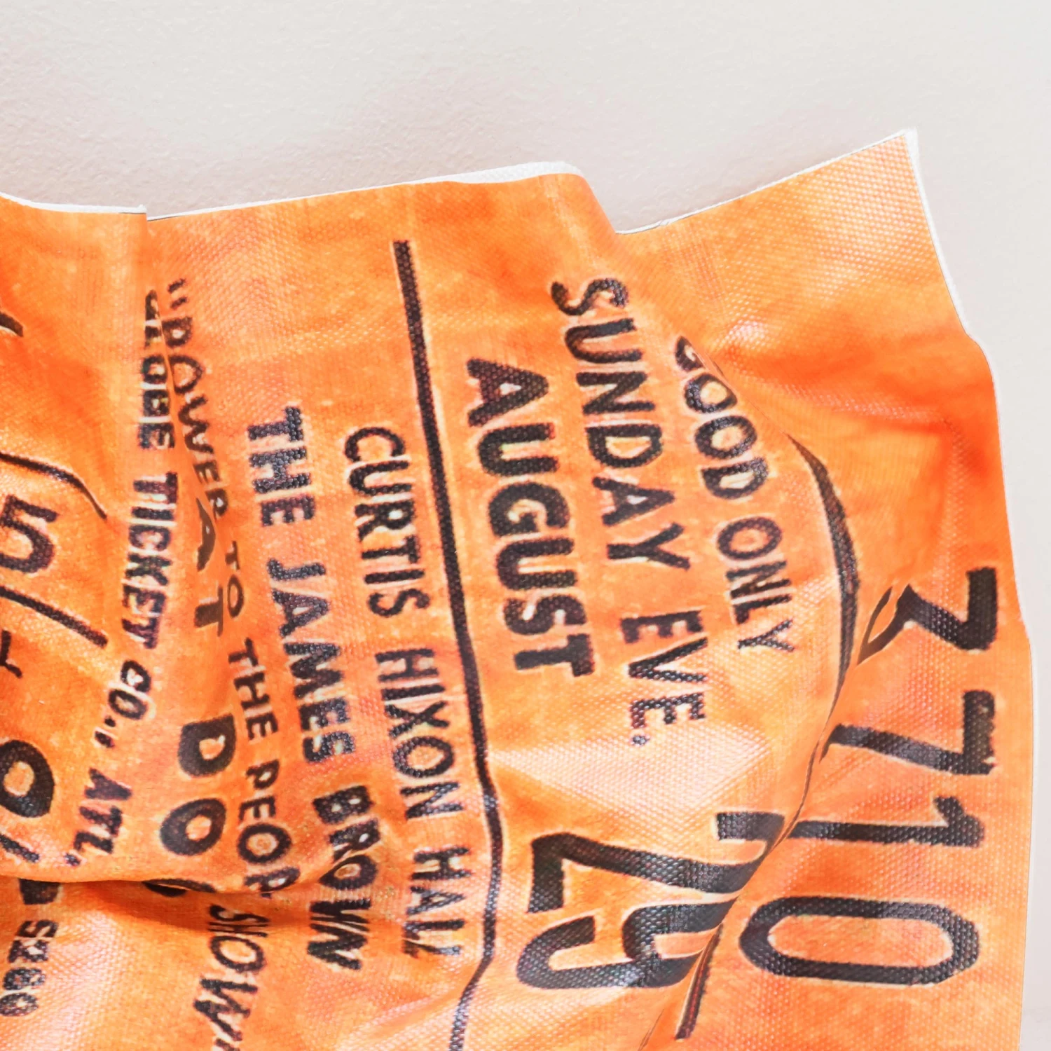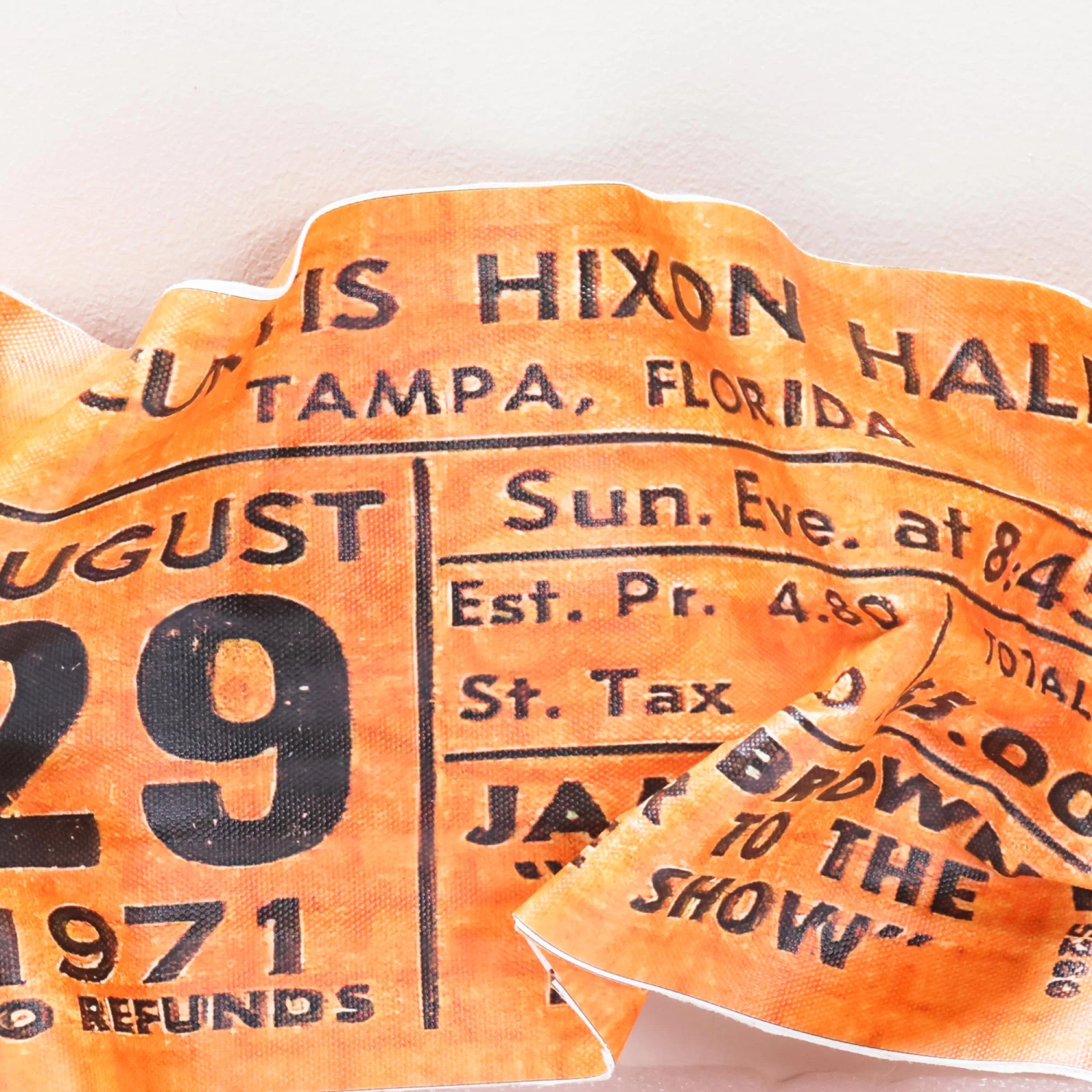 Just in from Tat Frederick, this 3D artwork features a James Brown reproduction concert ticket. Printed on double-sided canvas with flexible wire inside to form the shape and two acrylic rings for hanging.