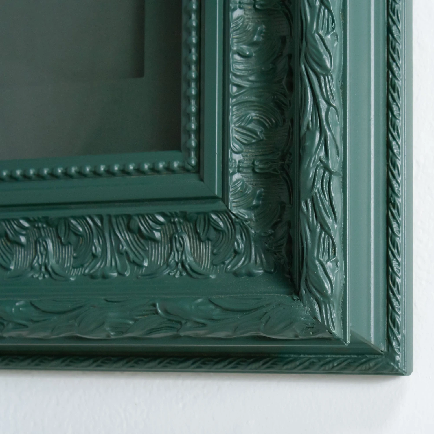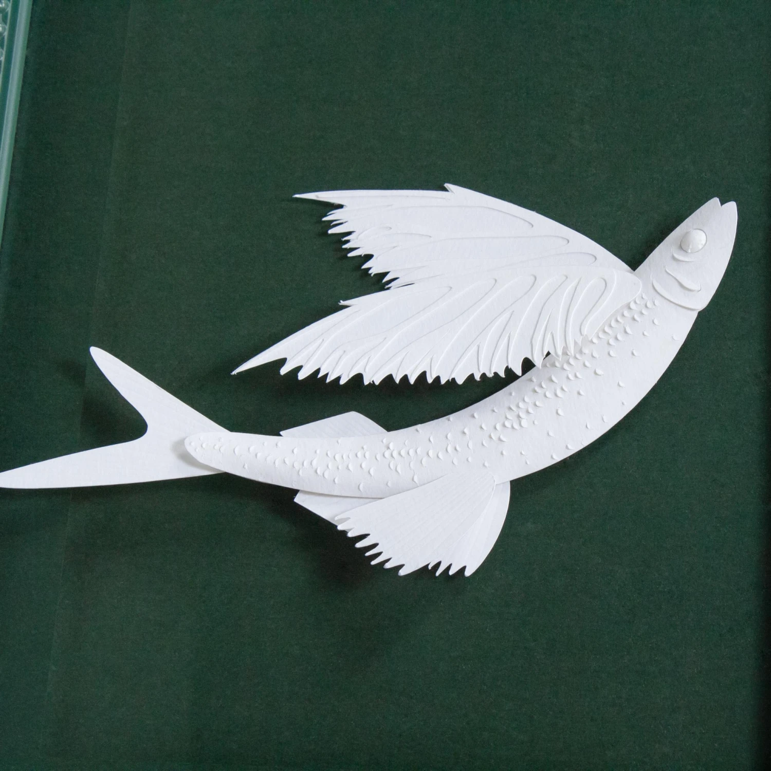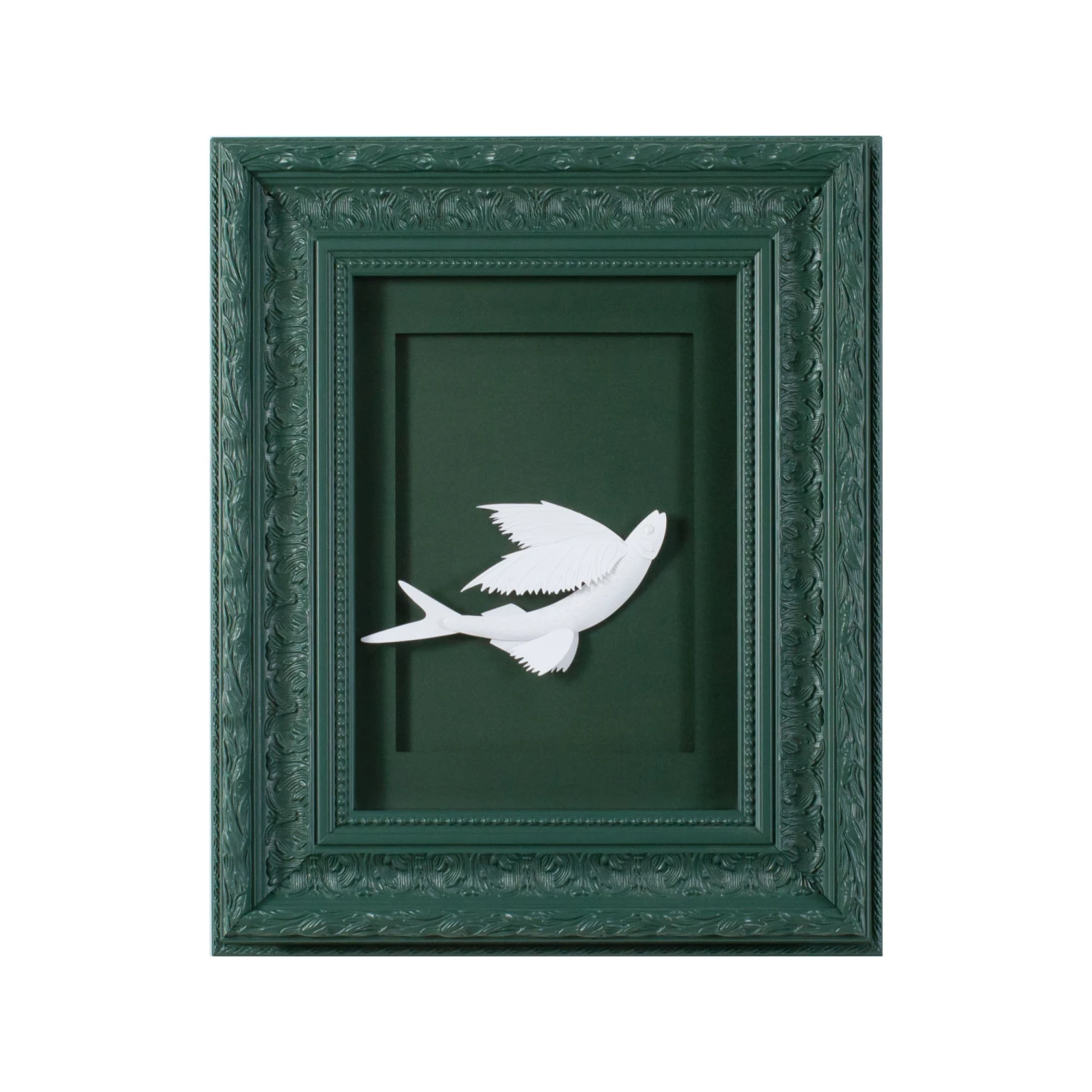 Hand crafted from paper, this fish is magnificent against a dramatic dark green backdrop. The fish is fixed to green matte paper with float mounting, enclosed behind plexiglass with an elaborate painted green frame.