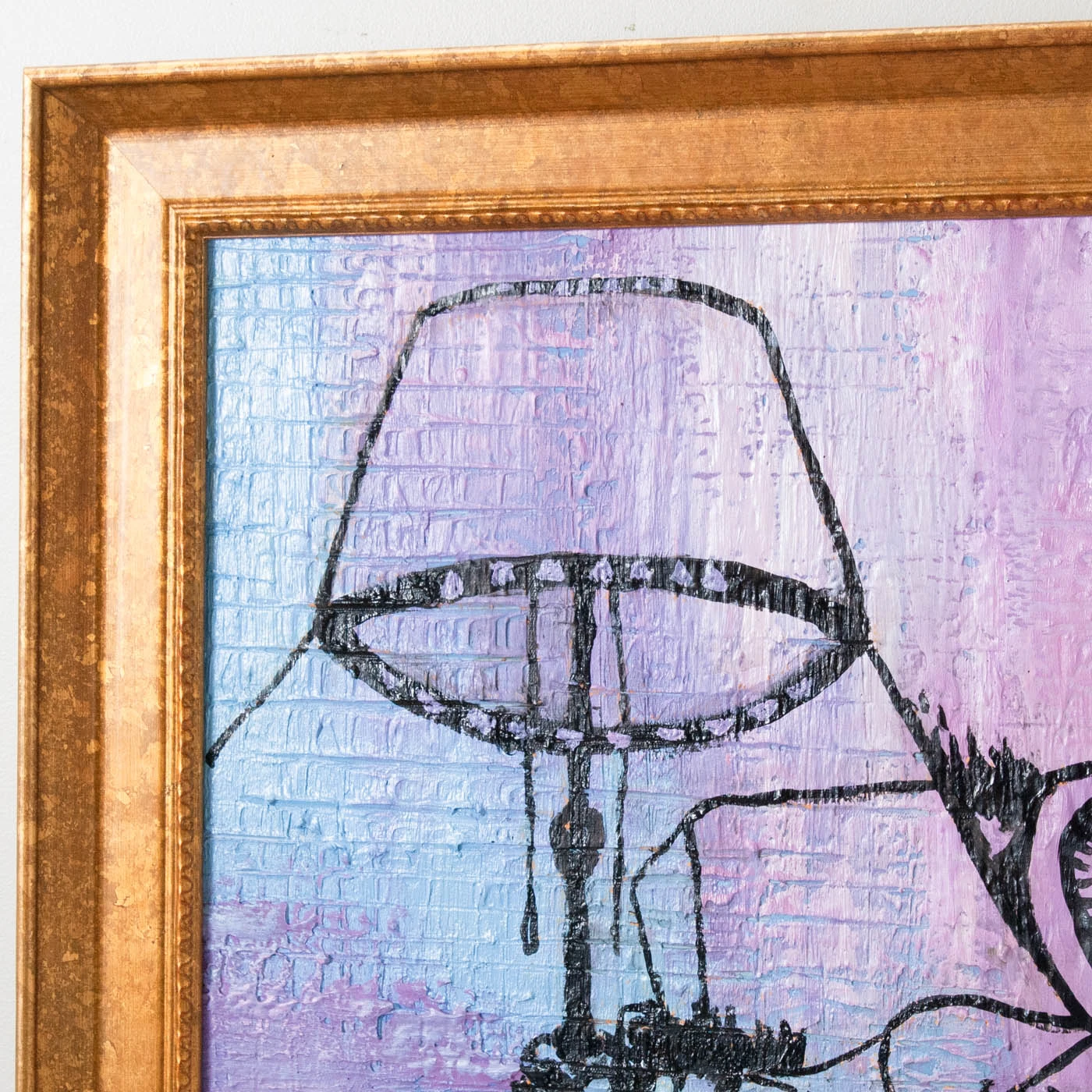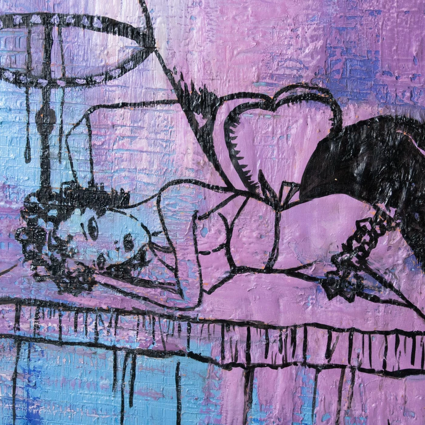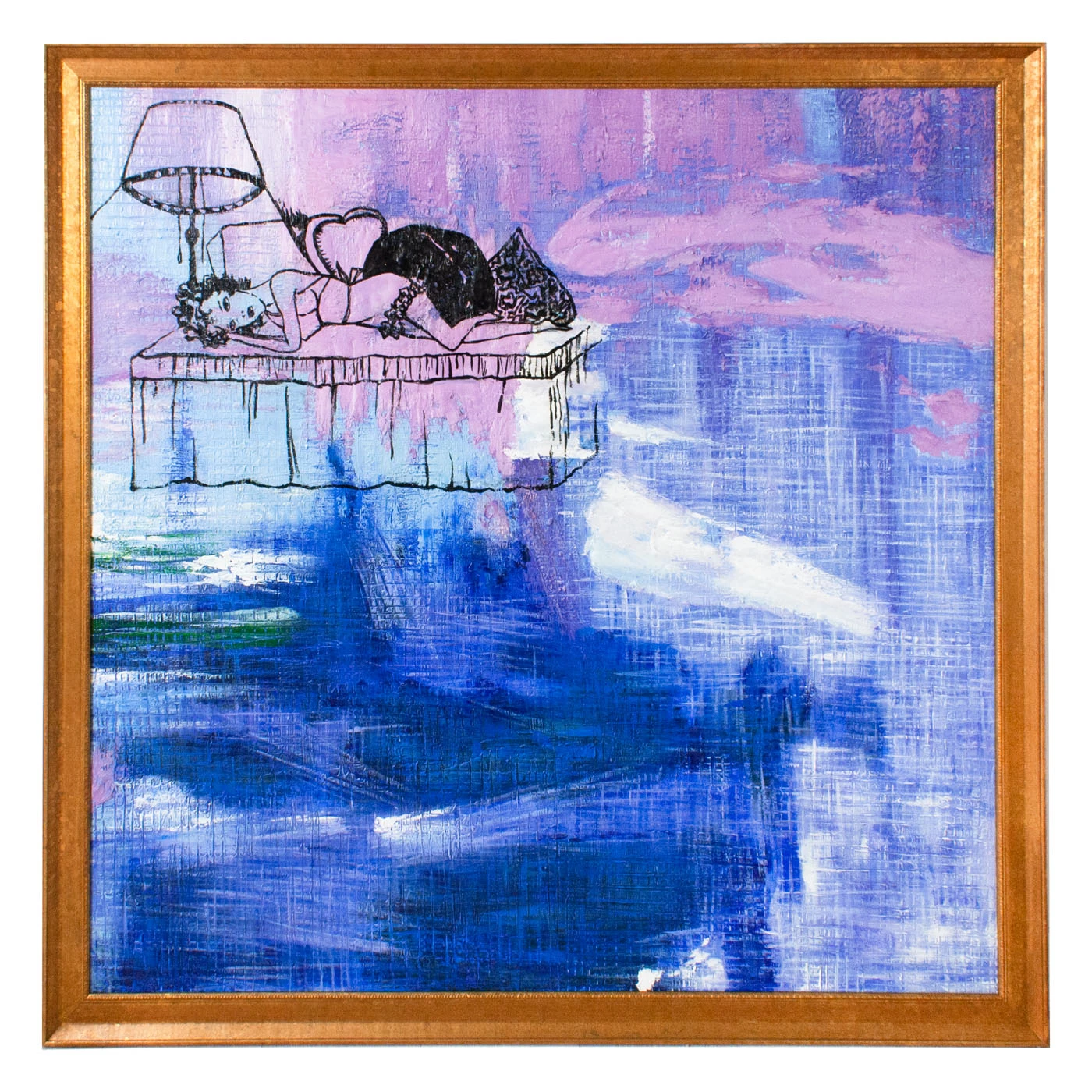 This giclee print by Tat Frederick features a vintage-style sketch of a woman laying in bed against a cool-toned abstract background.