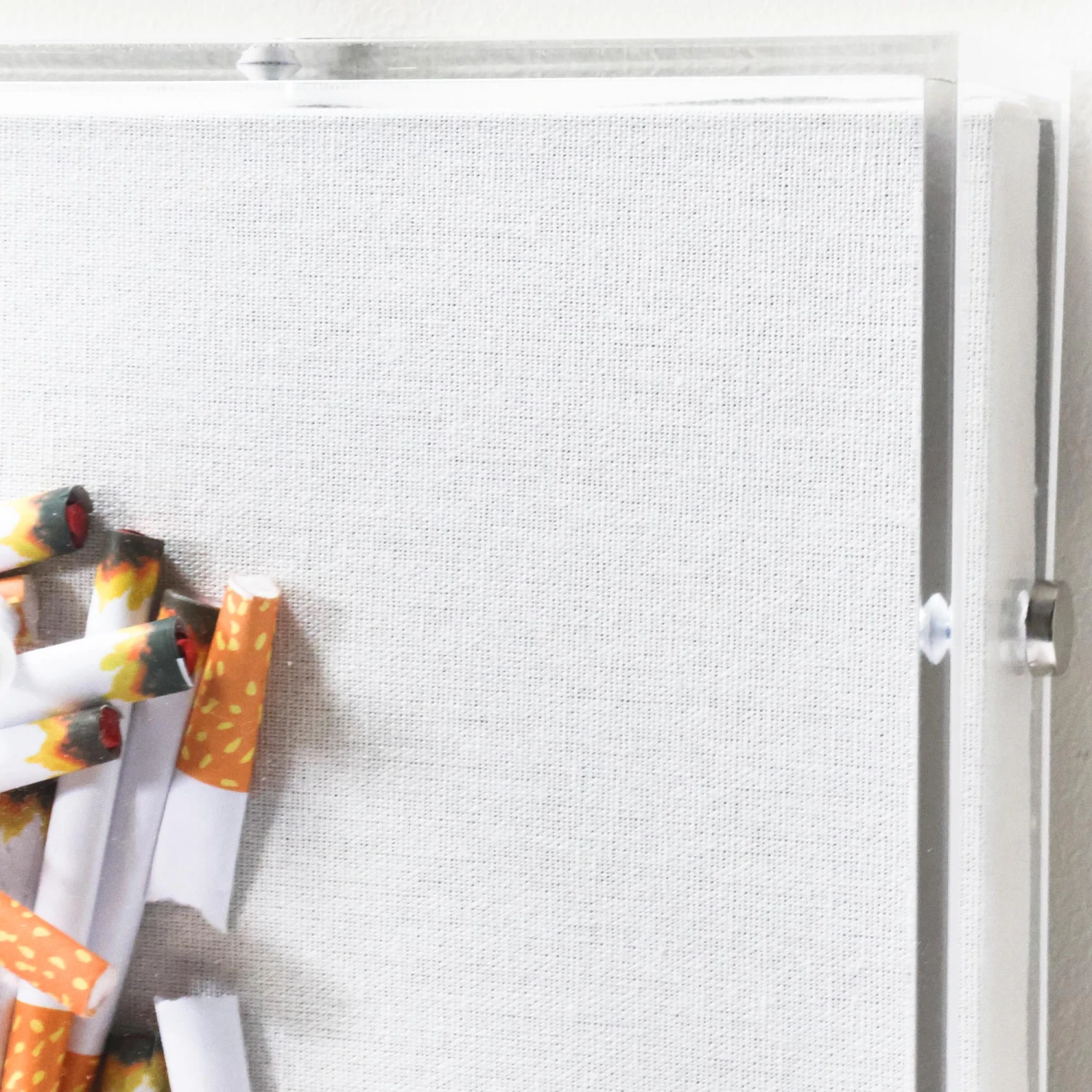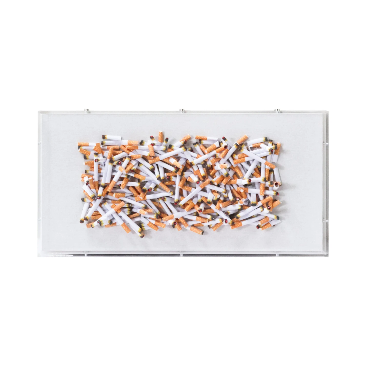 From the Tat Frederick studio, this piece features hand-placed paper cigarettes on canvas. Metallic tips make them appear lit, while holes in the frame give the appearance of some melting through. Framed in an acrylic shadowbox.