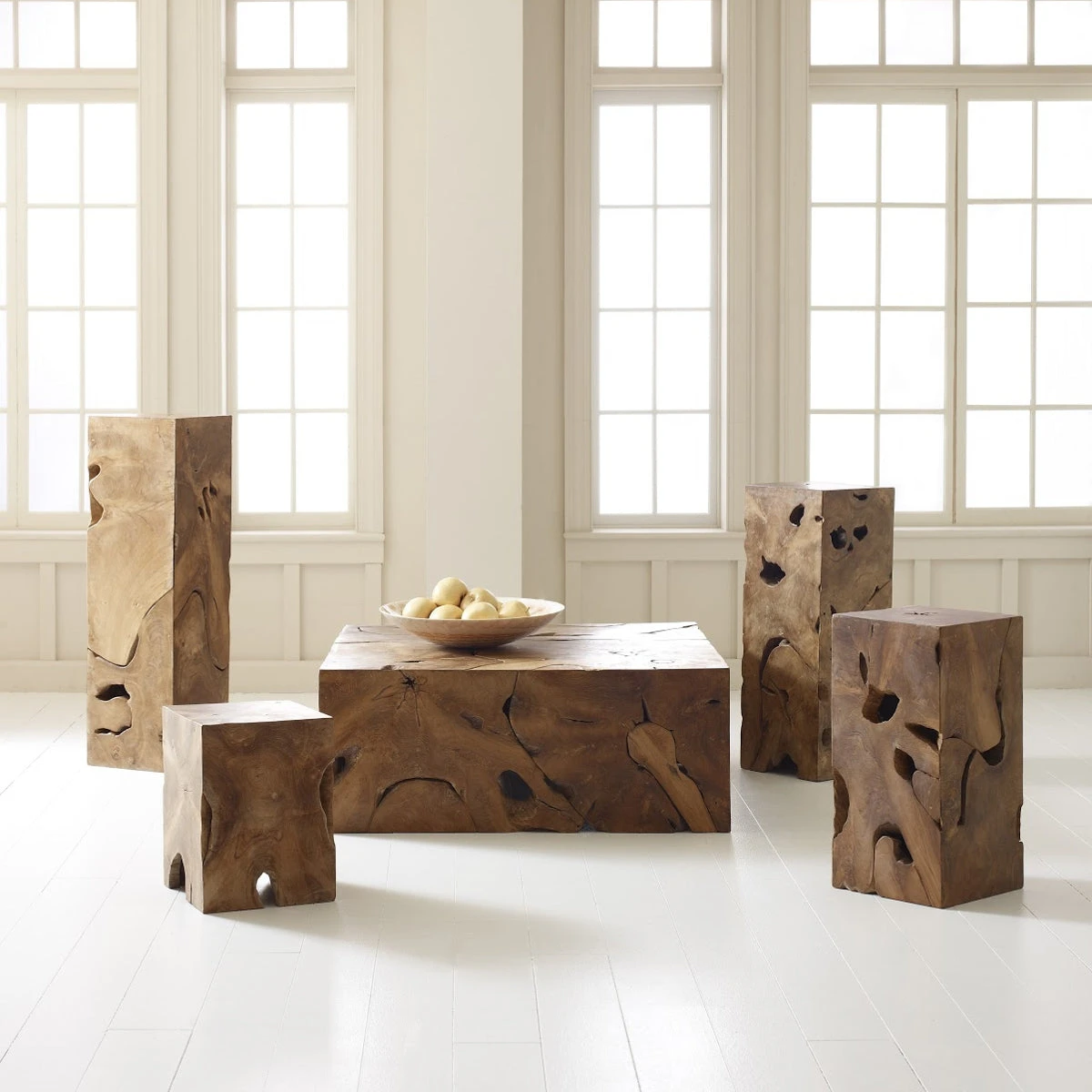 Pieces of scrap teak wood are hand assembled to create these organic tables and stools.