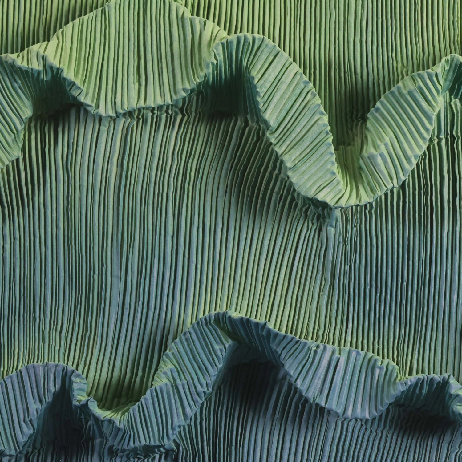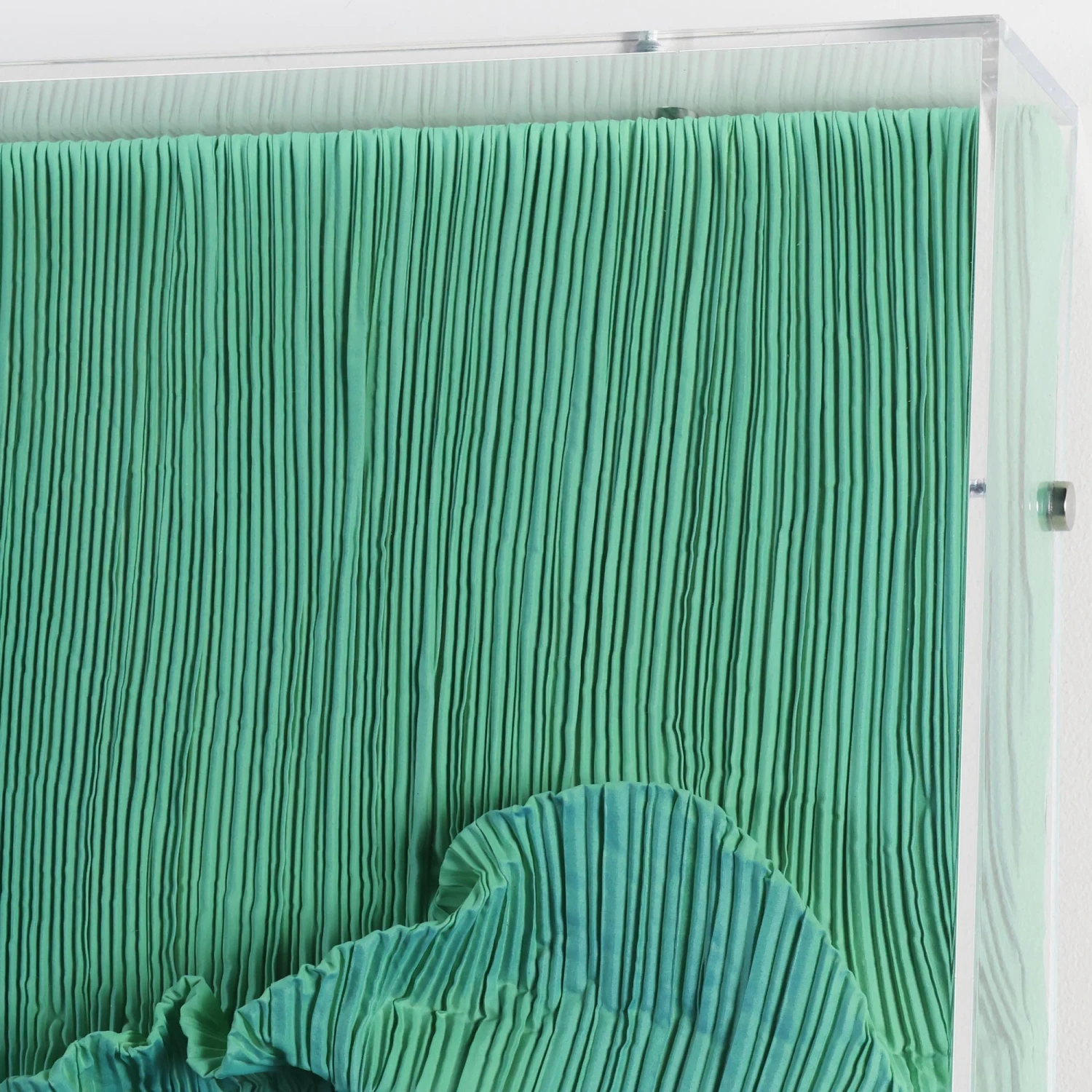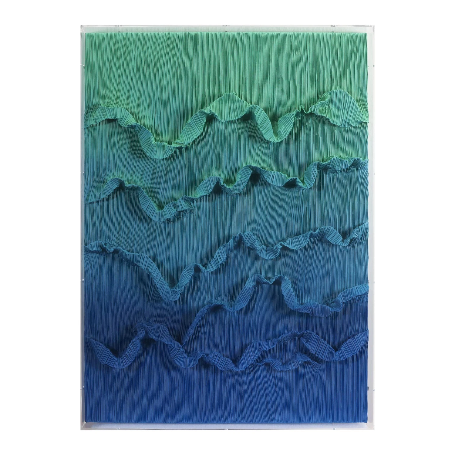 Encapsulating all of the deep sea intrigue, this piece features blue and green ombre paper that has been hand folded and fixed to canvas. Framed in an acrylic shadowbox.Â